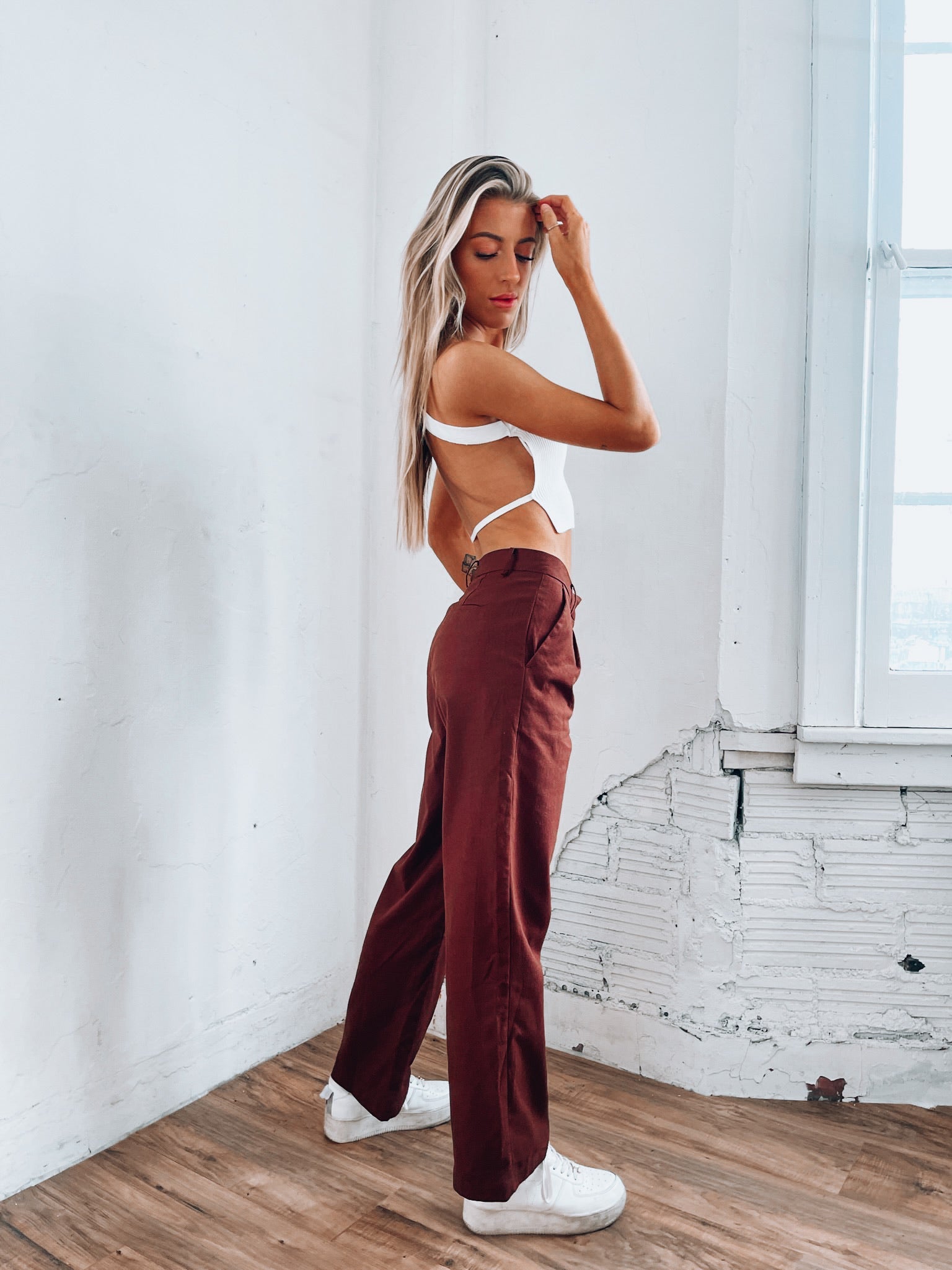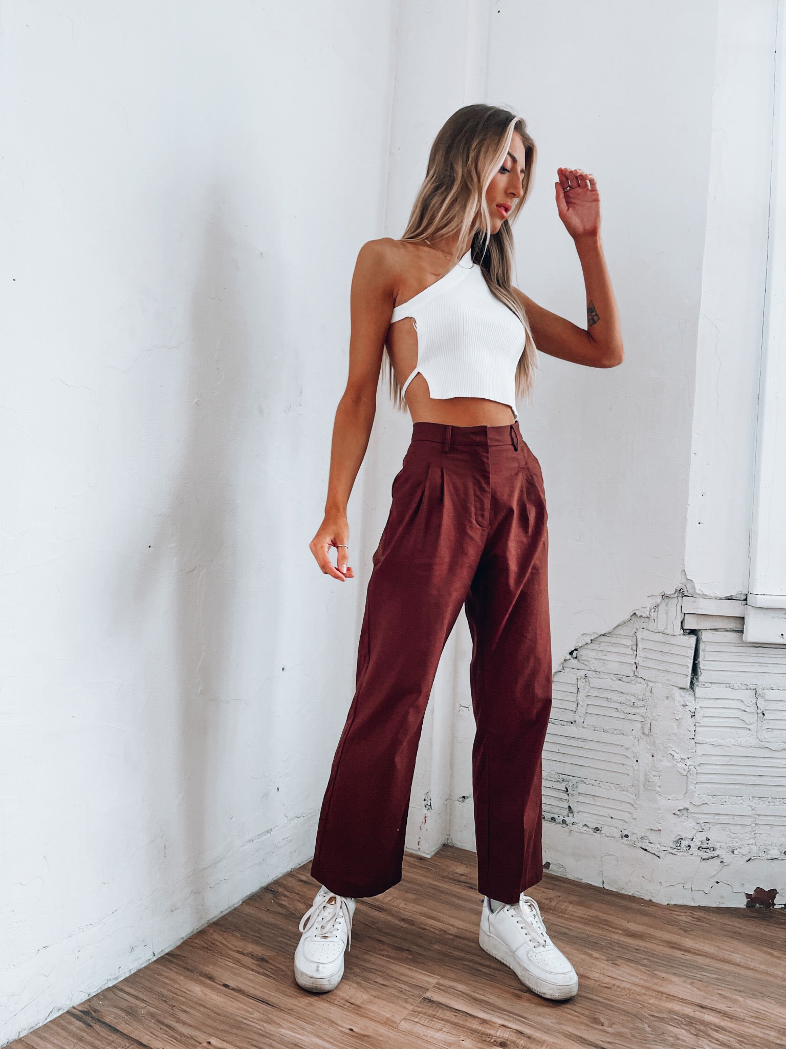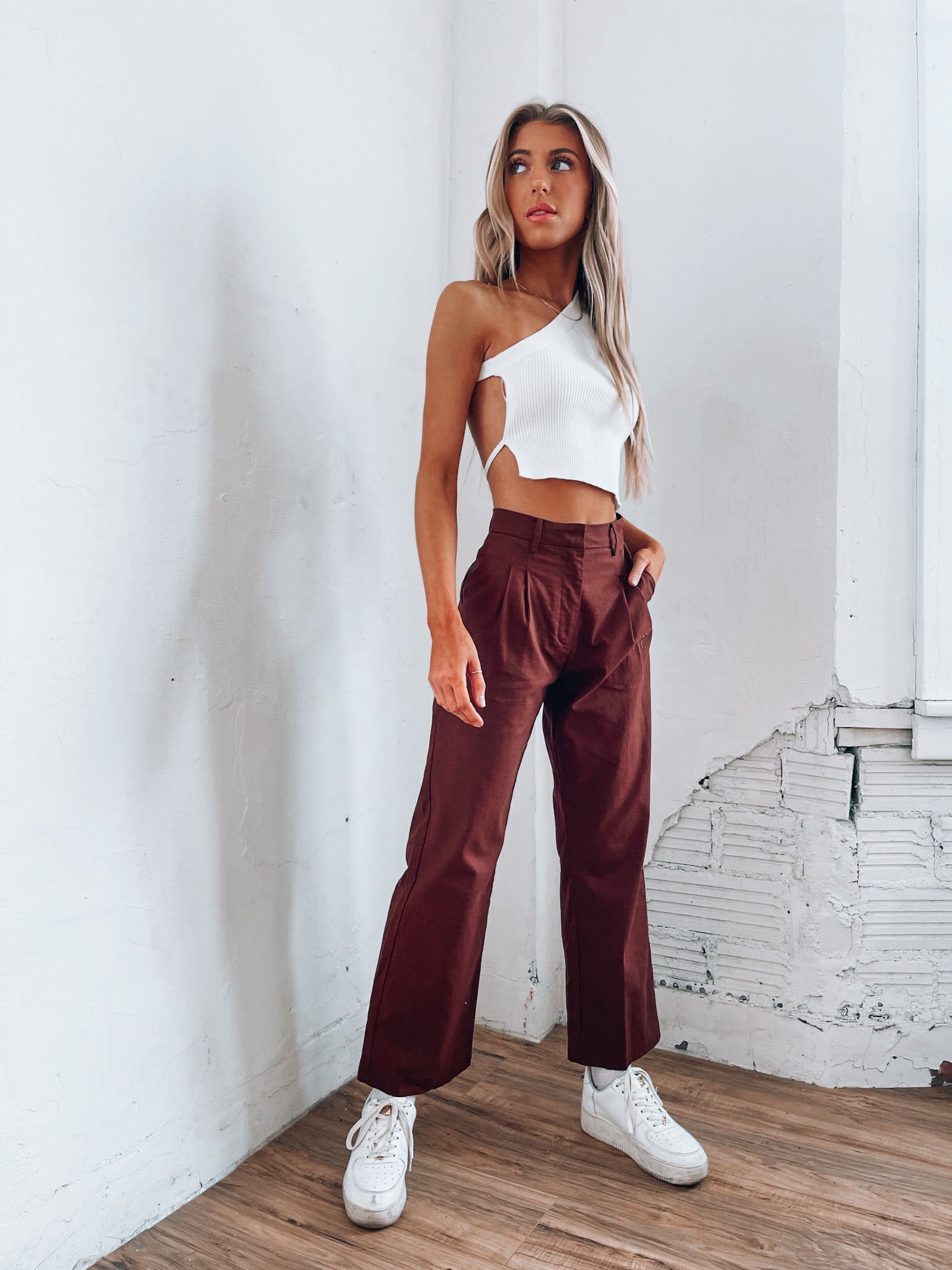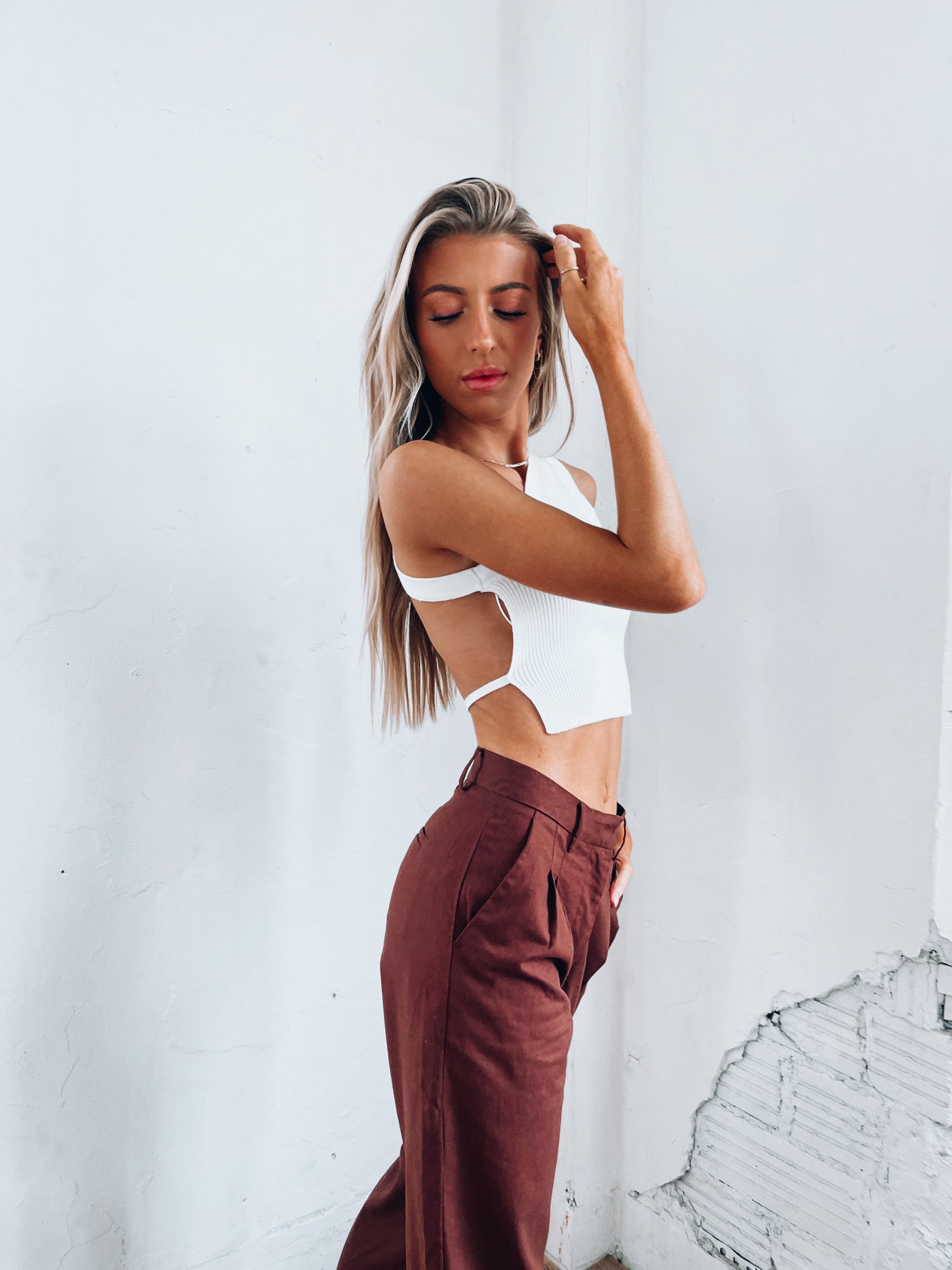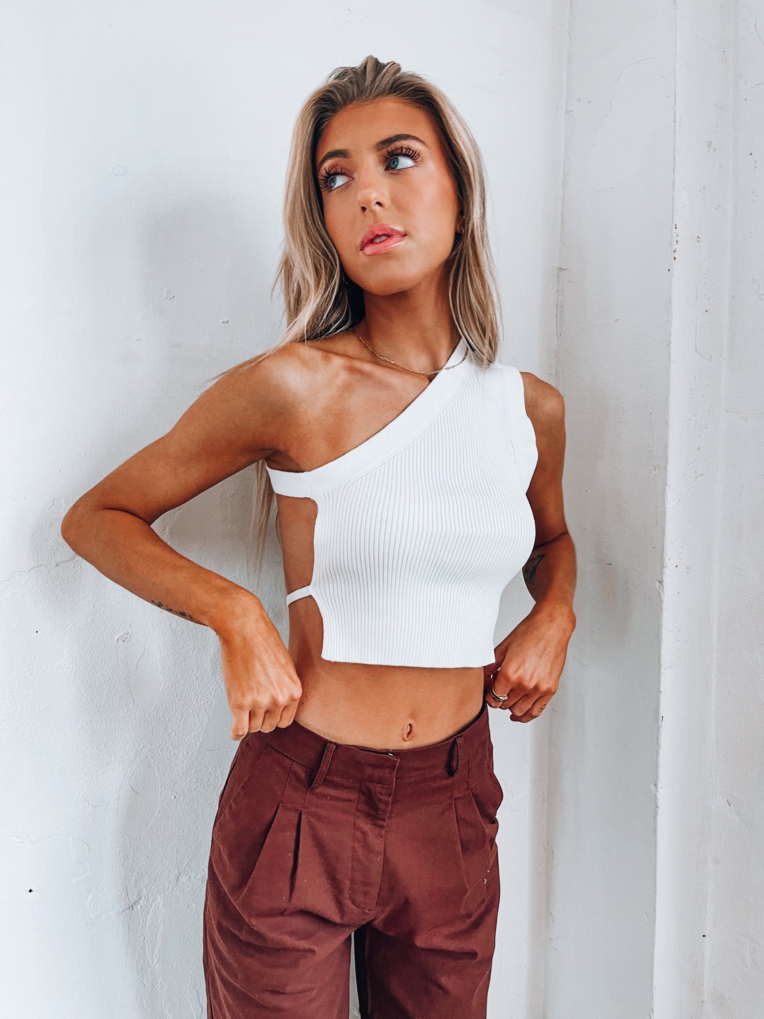 Our Kennan White One Shoulder Crop is a fitted crop top. This one shoulder top has an open back detail with a thin adjustable bottom back strap. This top would look so cute with any bottom!