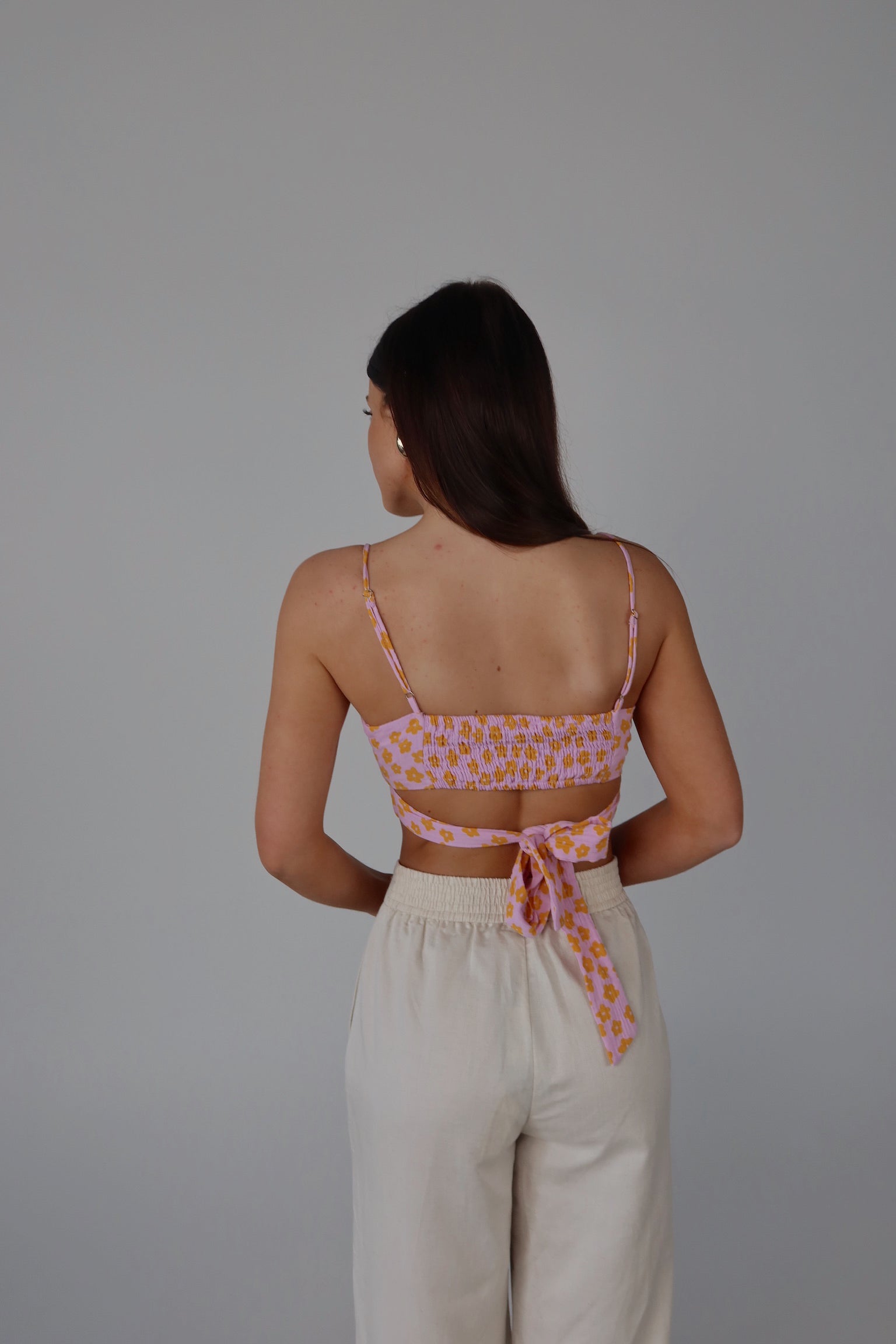 Our Cassie Floral Crop Top has floral print throughout with adjustable straps. It has a synched thick back strap and a bow tie closure. This top has ruching on the front and a slight crossover detail under the bust.