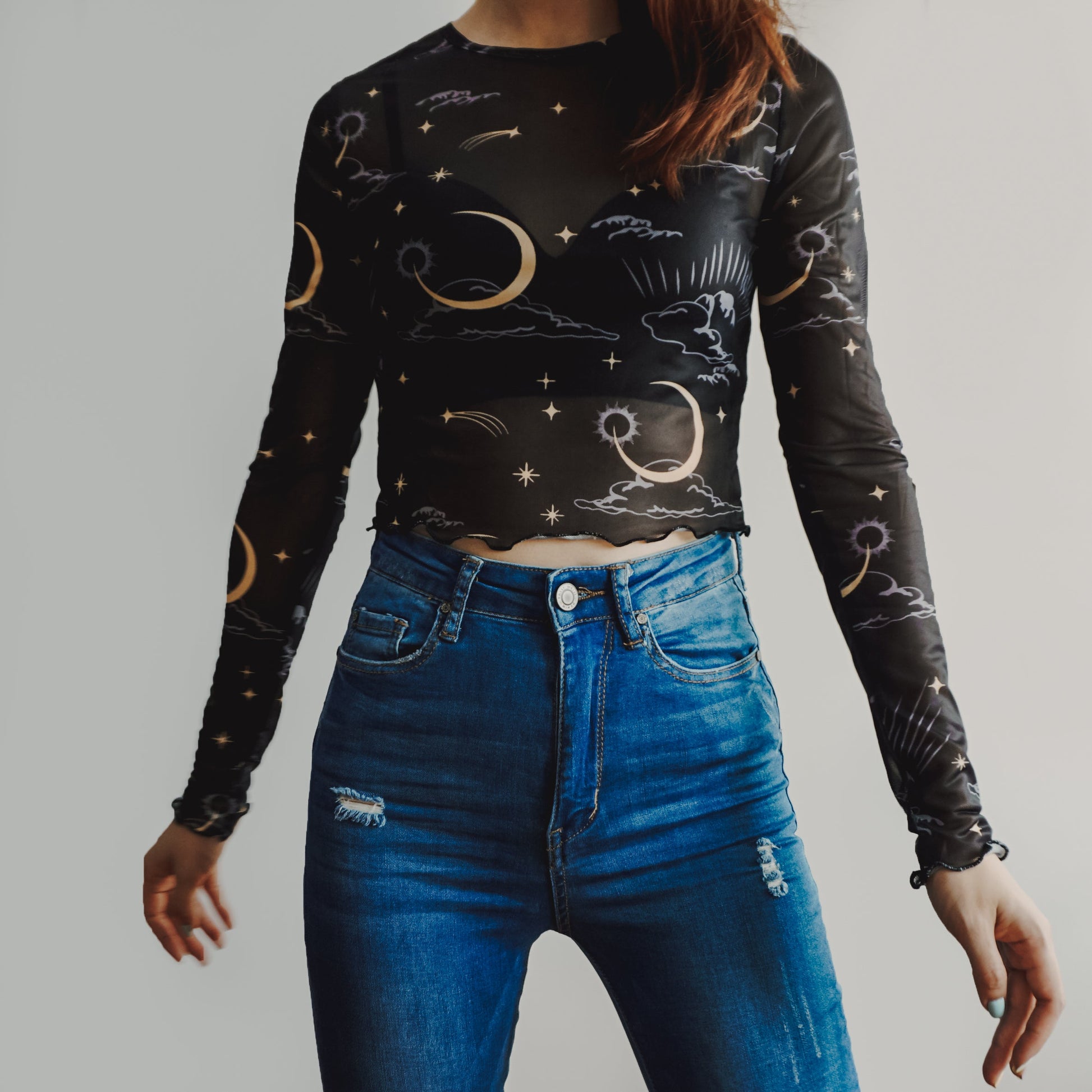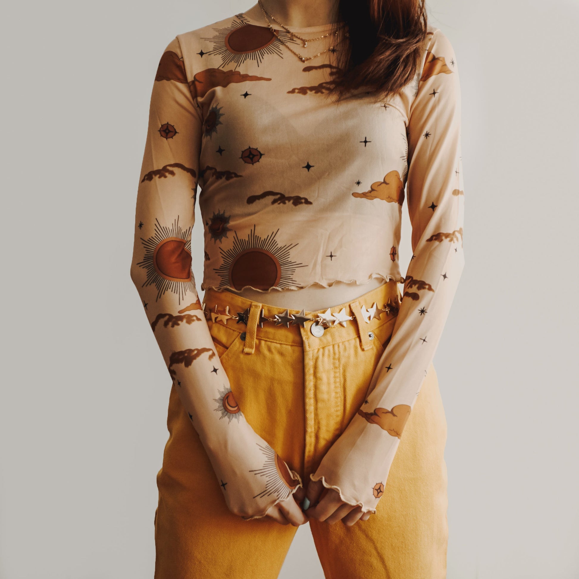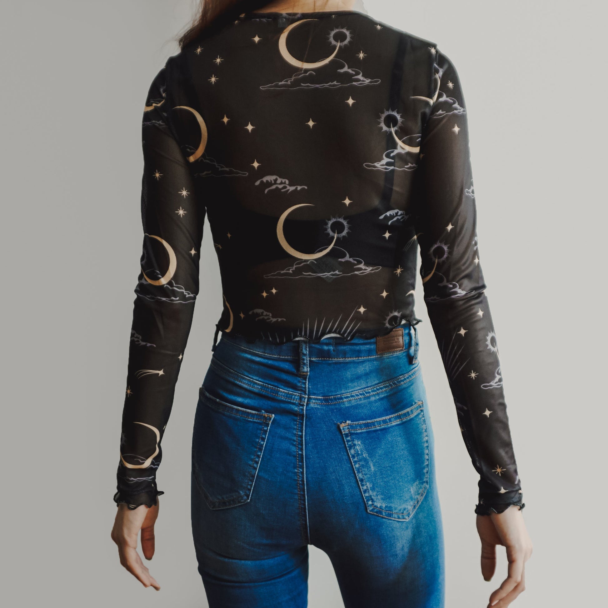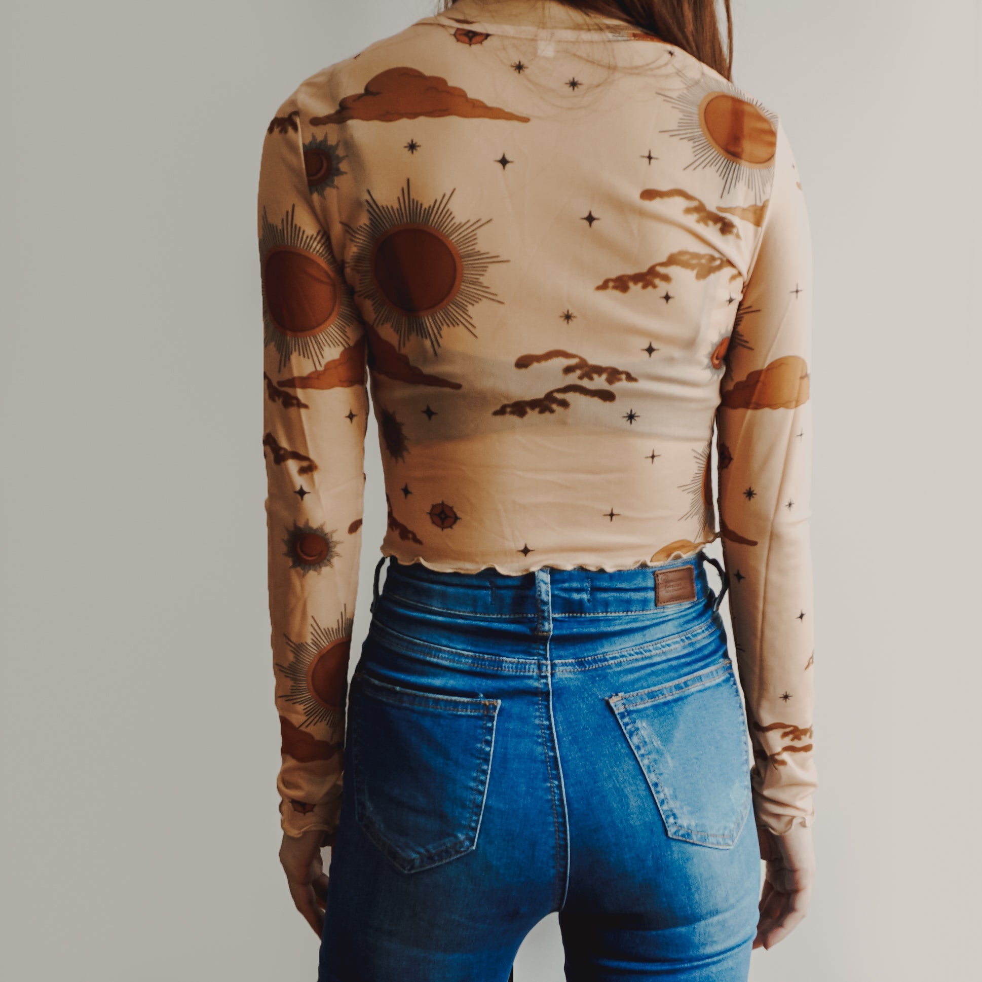 Long sleeved cropped mock neck mesh shirt with the sun, moon and clouds.