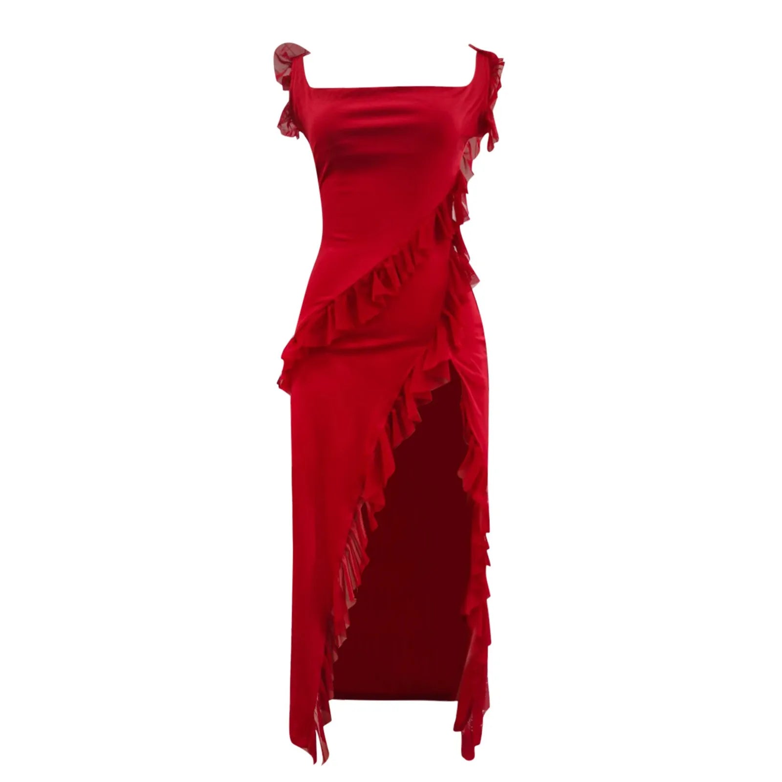 FashionSierra - Ruffles Chiffon Maxi Dress For Women 2025 Backless Split Sexy Black Long Wedding Party Elegant Luxury Chic Female