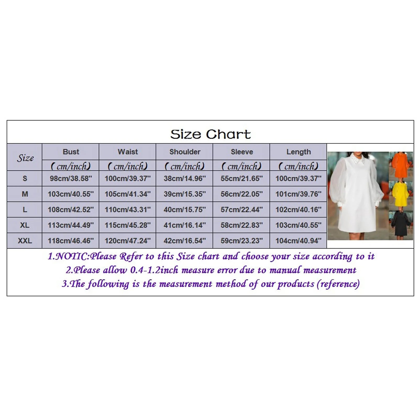 | Size | Bust | Waist | Shoulder | Sleeve | Length |