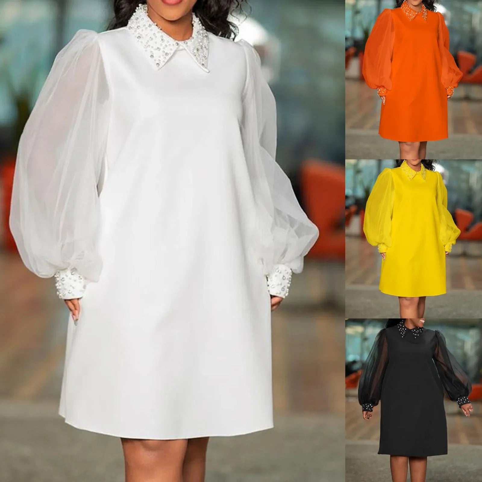 FashionSierra - Loose Turn Down Collar Mesh Full Sleeve Straight Knee Length Elegant Business Chic Dress