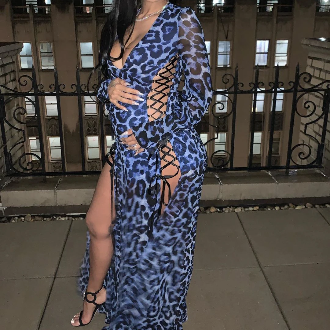 FashionSierra - XXL Leopard Print Bandage Hollow Out Dress Women Long Sleeve V-neck Split High Waits Maxi Dress Party Club Wear Robe Femme