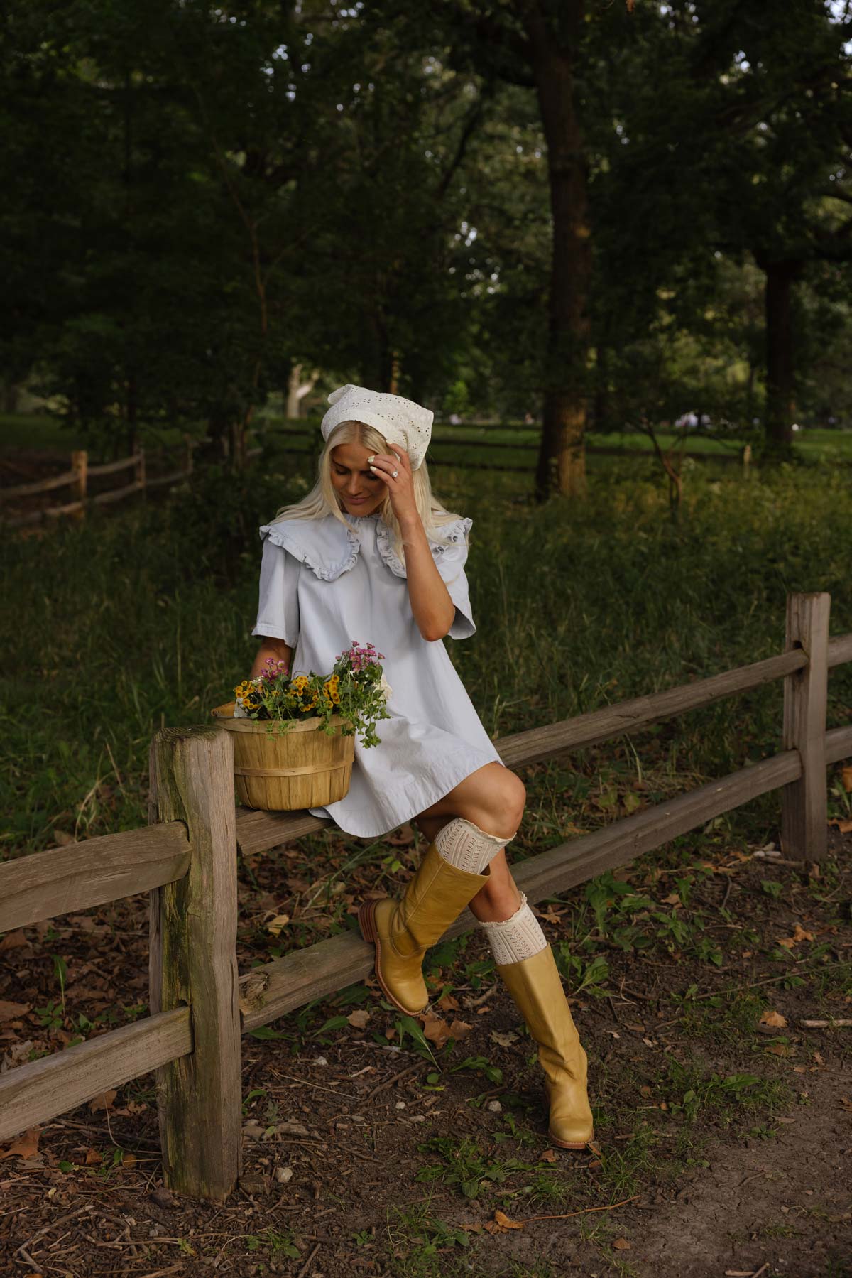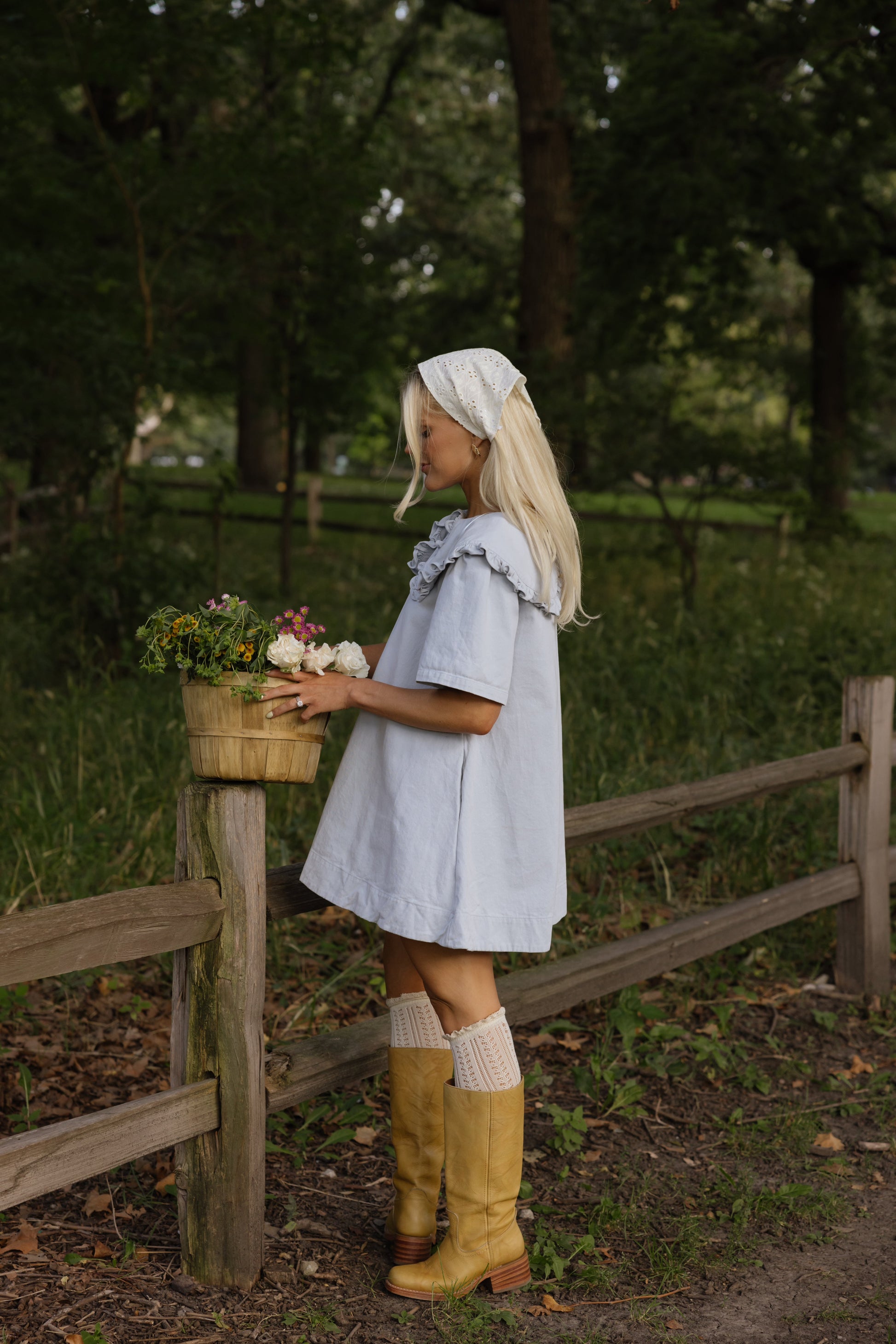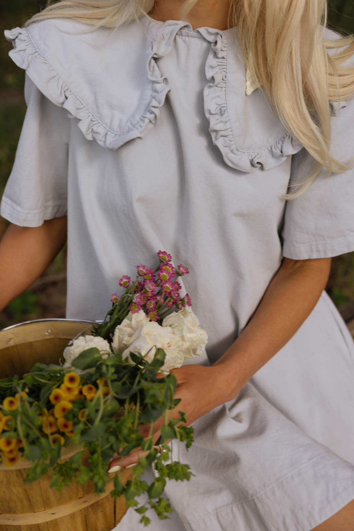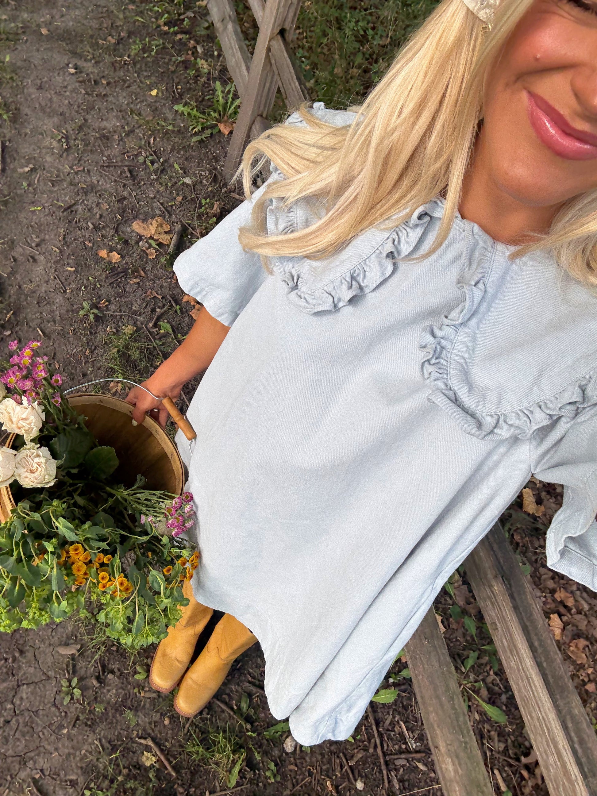well, well, well, if it isn't the cutest fall dress i've ever seen. baby blue denim, oversized collar and just the easiest babydoll fit. i love this hunny worn on it's own with doc loafers, or layered with one of our quilted jackets or knits. it will be your favorite dress, 12/12 months of the year, TRUST ME ANGELS !!