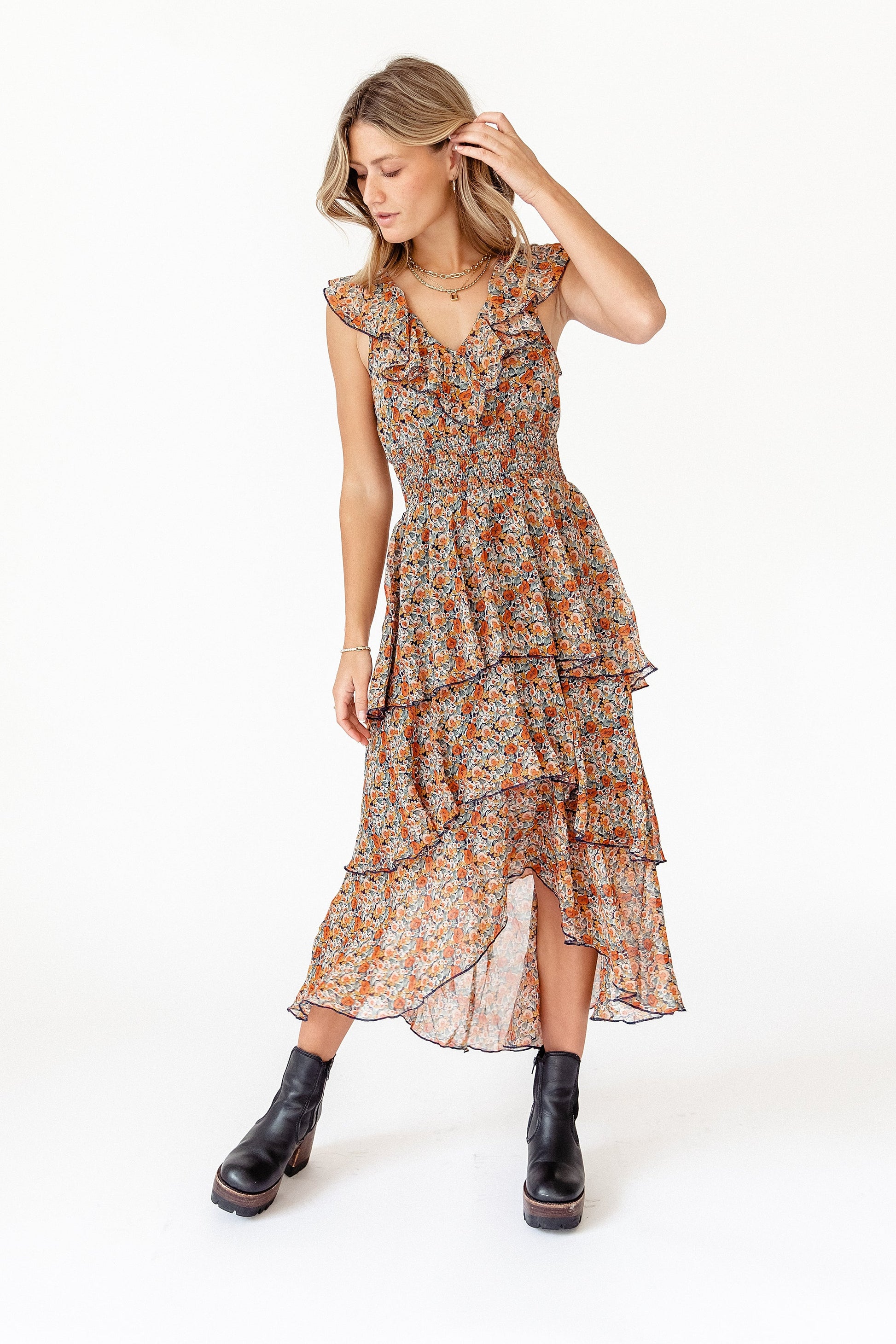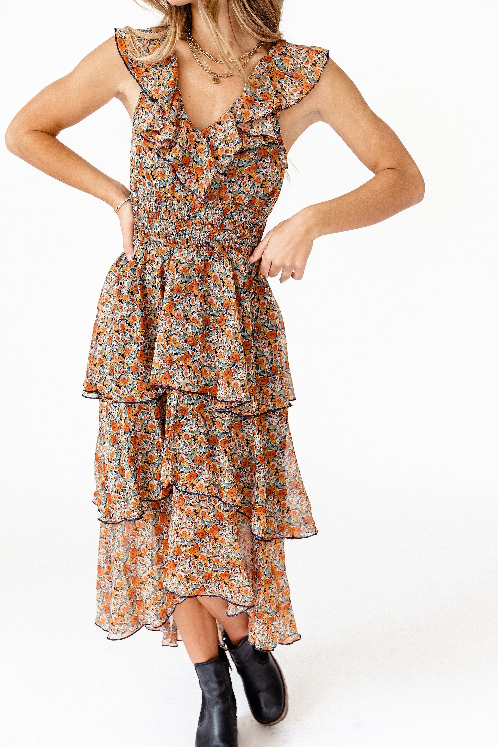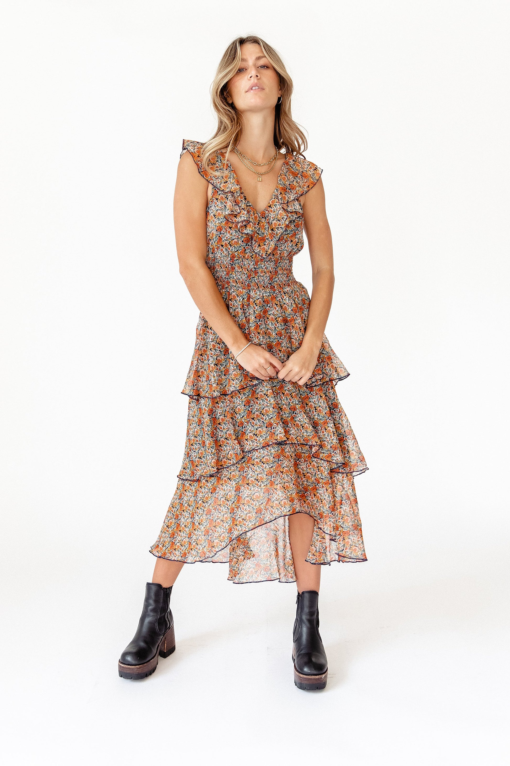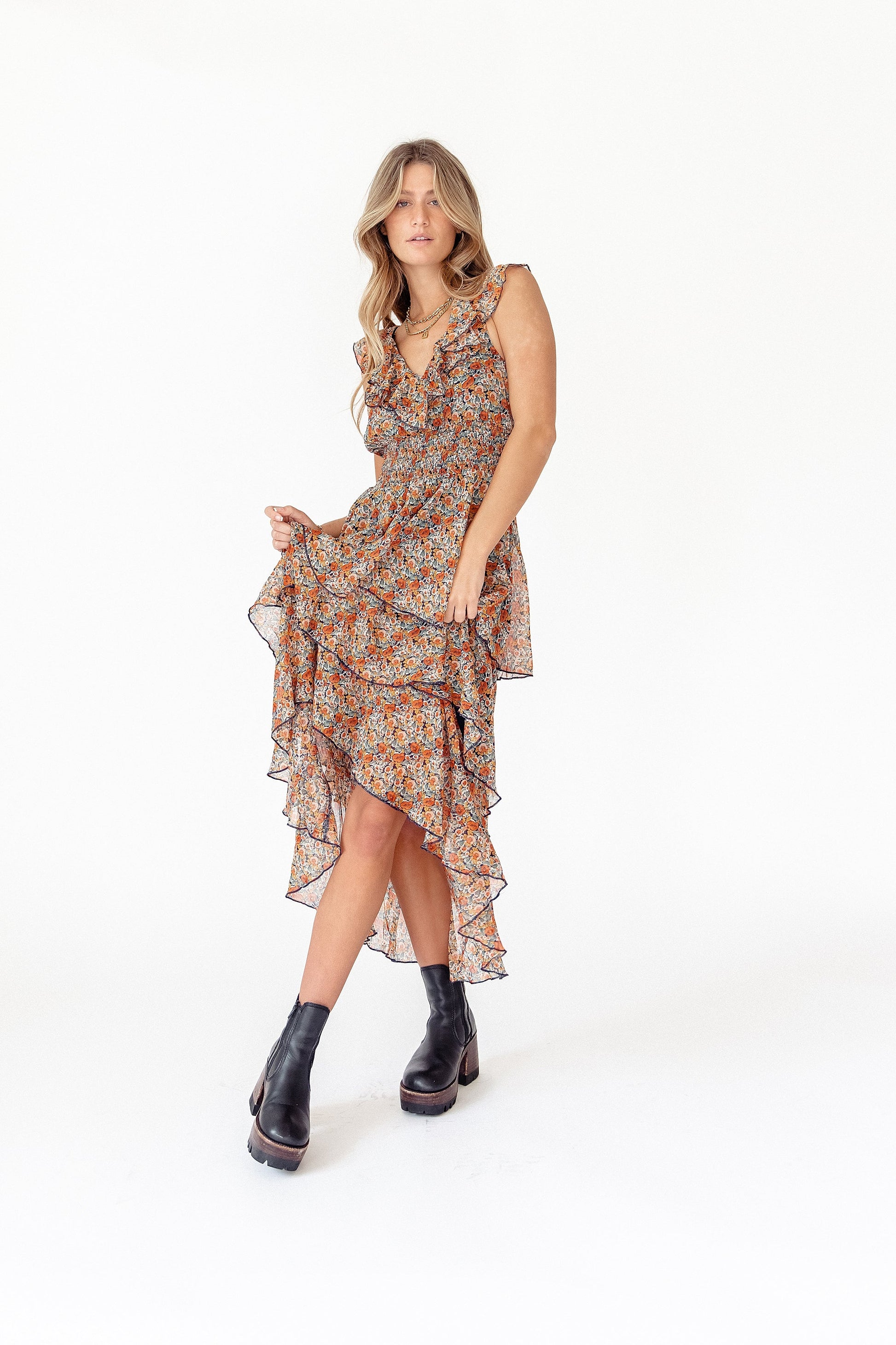 Here at Coco McCall we're always on the hunt for stunning dresses to add to our collection and the Fleetwood Floral Chiffon Dress is one of the prettiest ever. The silhouette is absolute magic-- flattering ruffle neckline, 3-tiered and the black detailing adds an edgy vibe we're obsessing over. It's one of those pieces you'll be excited to wear to every event, not to mention it'll make you feel like a million bucks. Do your closet a favor and invest into this major head turner-- you deserve it babe.