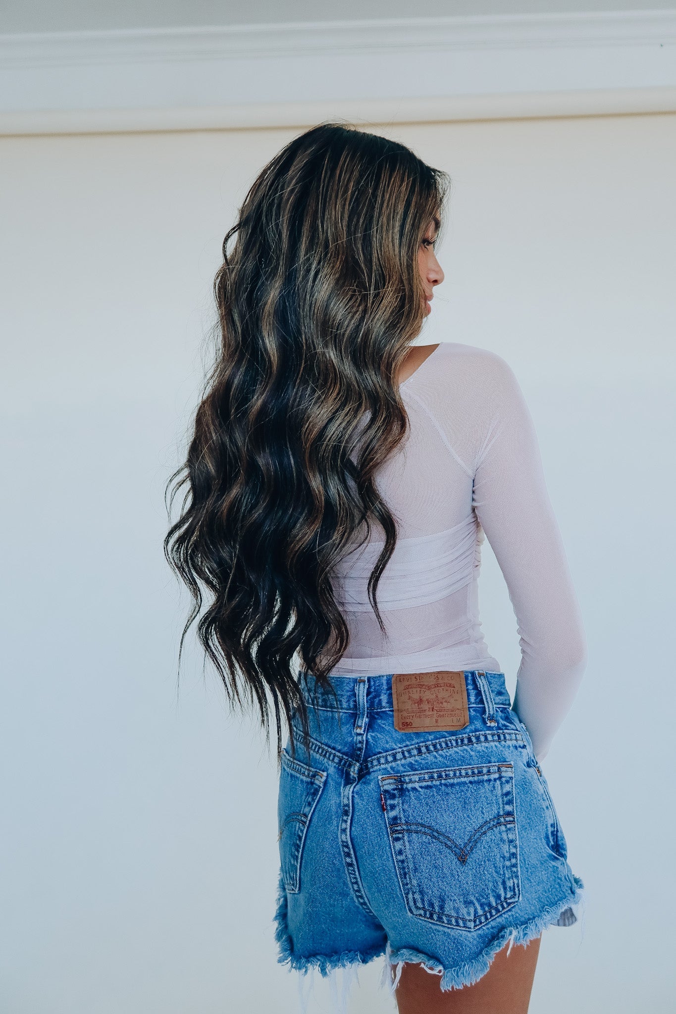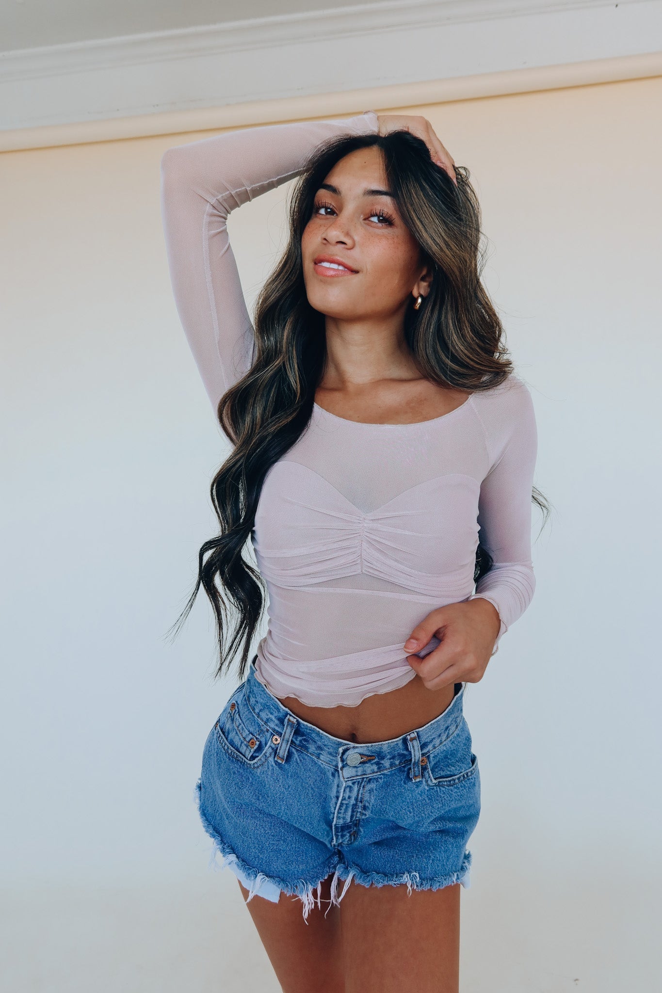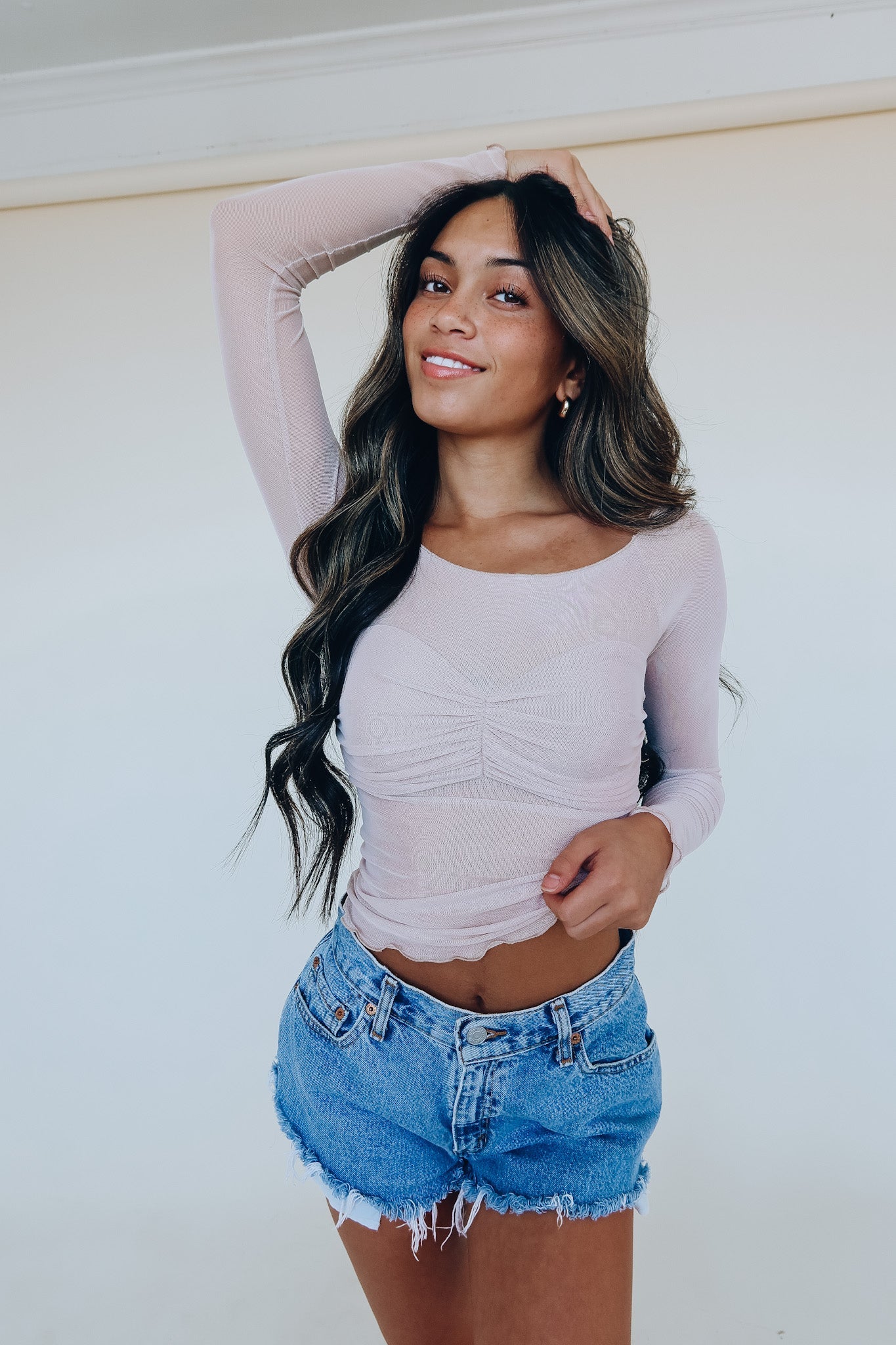 Our Sweet Fling Mesh Long Sleeve is a long sleeve crop top with a unique look. This top features a wide scooped neckline with mesh material below the bust, on the longsleeves and back detail, with a fully lined bustline. The wide neckline allows you to wear this top on or off the shoulders. The mesh material on this top has stretch throughout and hugs your body perfectly. The bodice of this top features a lined bustline with smocked detailing in the bust and long the sides. The back of this dress is double mesh lined for addtional structure. This neutral top is perfect for any time of year and will elevate any look. This top has stretch throughout and runs true to size.