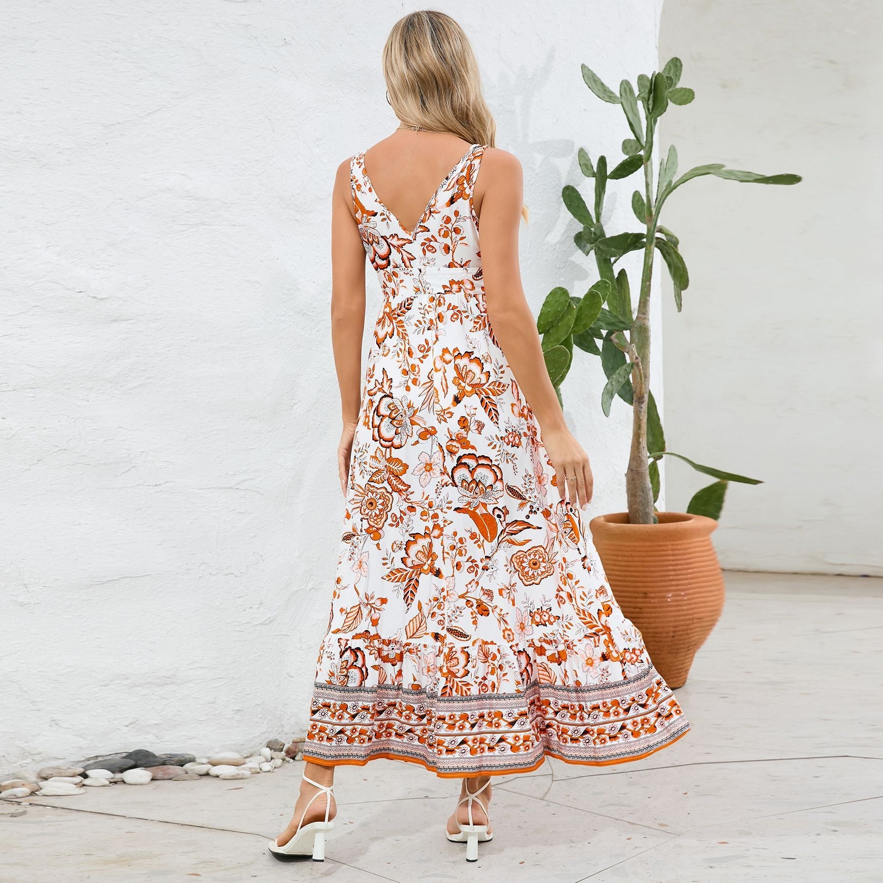 Fashion Floral Print V-neck Dress Summer Sexy Slim Fit Sleeveless Long Dress