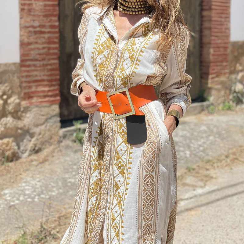 European American Fashion Floral Print Long Sleeve National Style Bohemian Mid-length Dress
