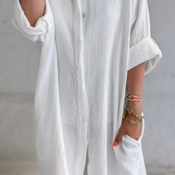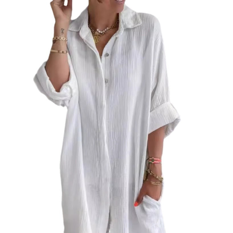 Long Shirt Women's Cotton And Linen Loose Solid Color Pocket Shirt Dress