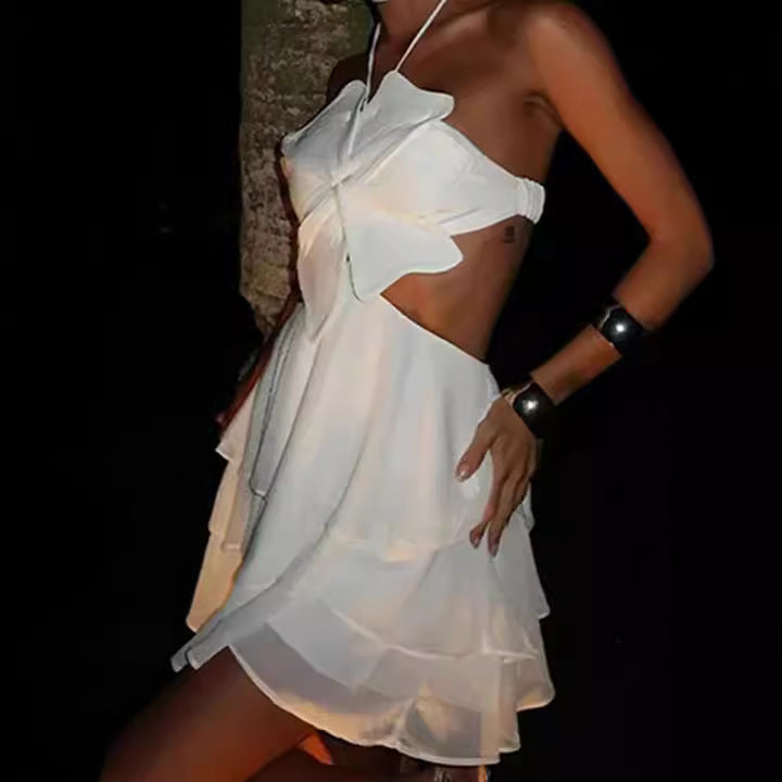 Fashion White Halter Flowers Cake Dress Backless Dress
