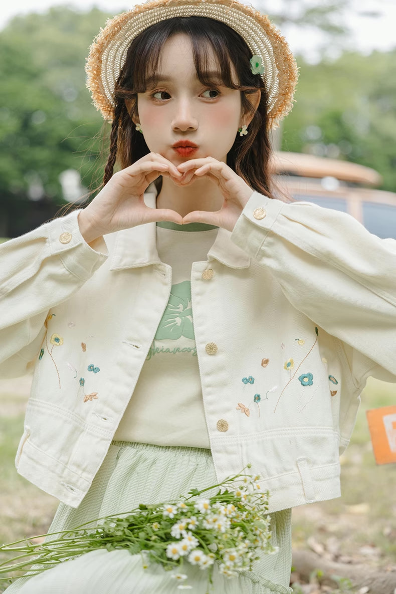 Cropped denim jacket in a creamy white color聽with embroidered flowers along the front.聽