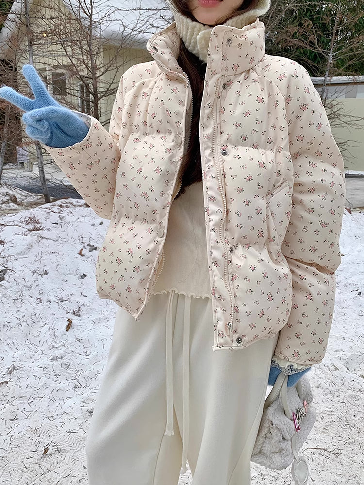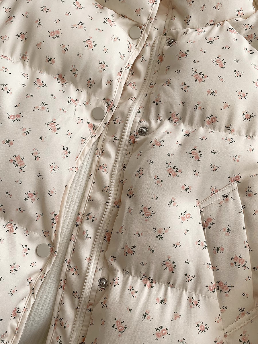 High neck zip-up puffer jacket with a ditsy floral print all over, side pockets and snap button closure.