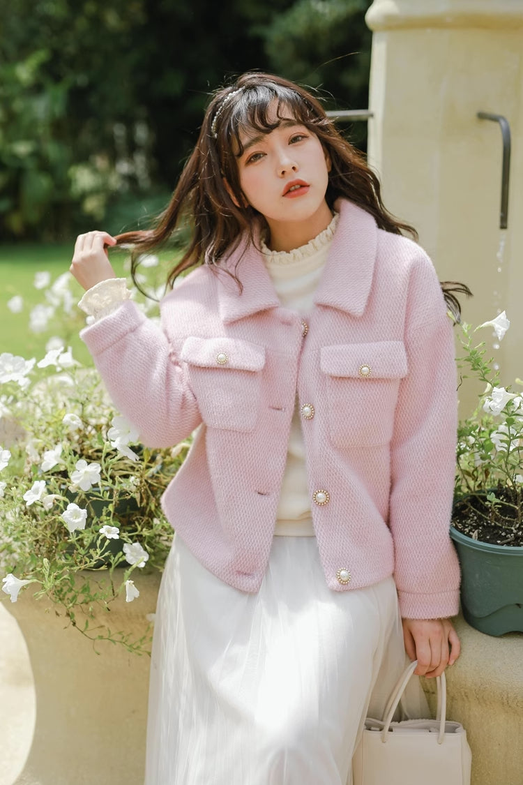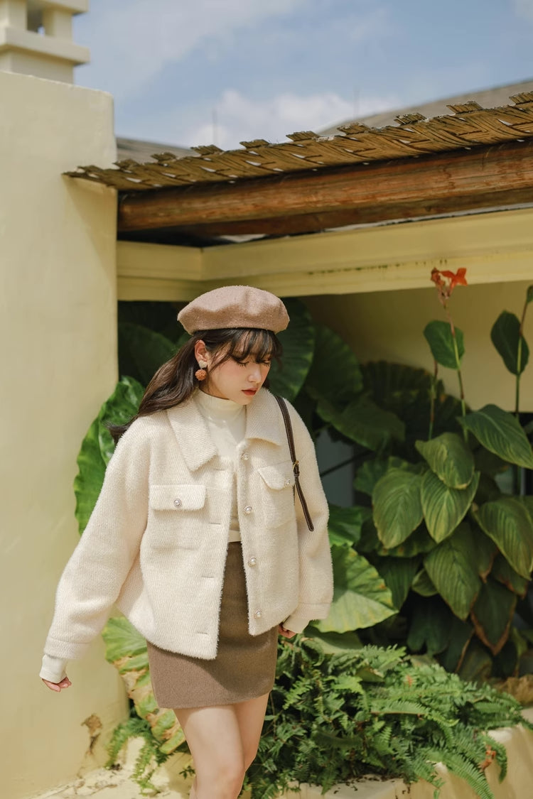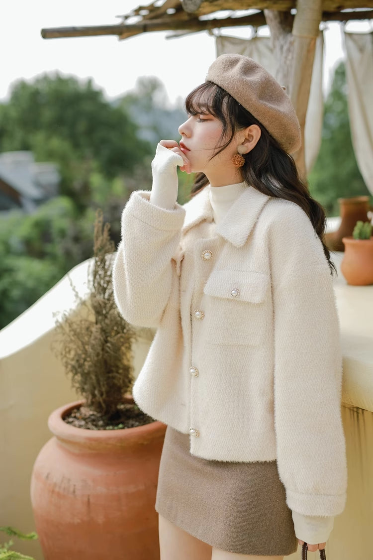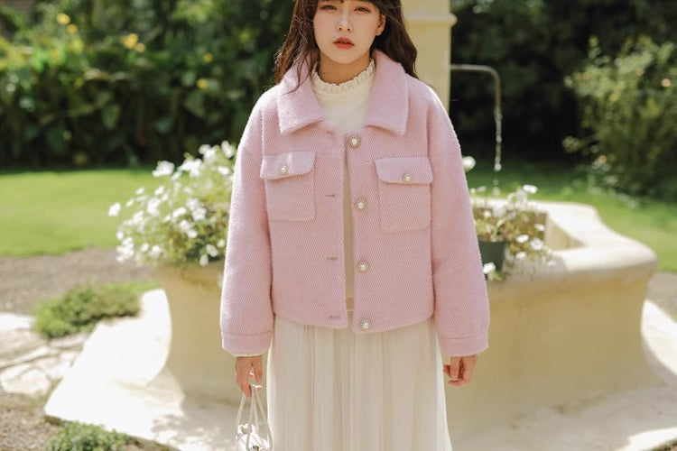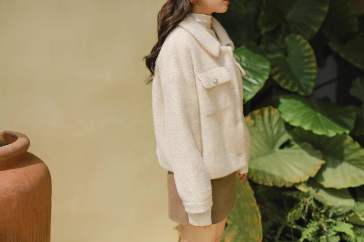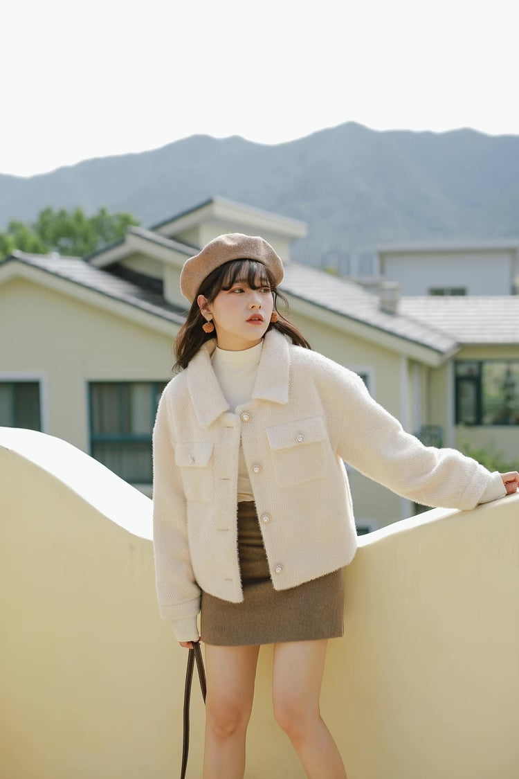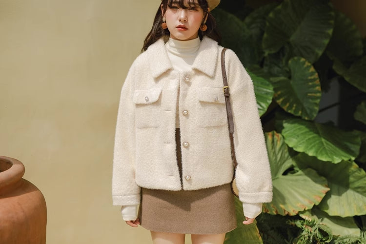 Faux short-hair mink jacket with a button-up front, collar, chest pockets and slightly cropped length.