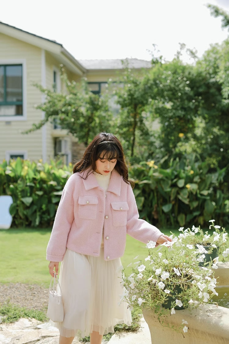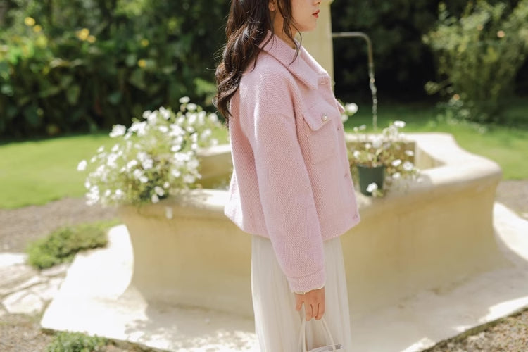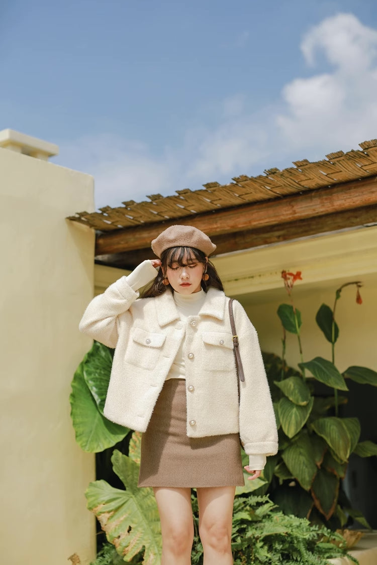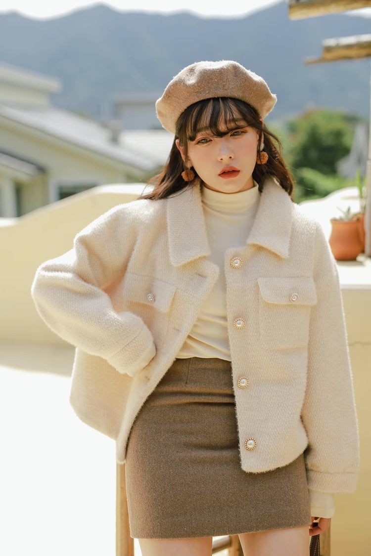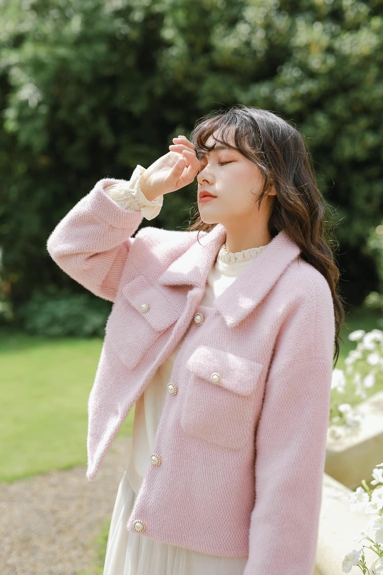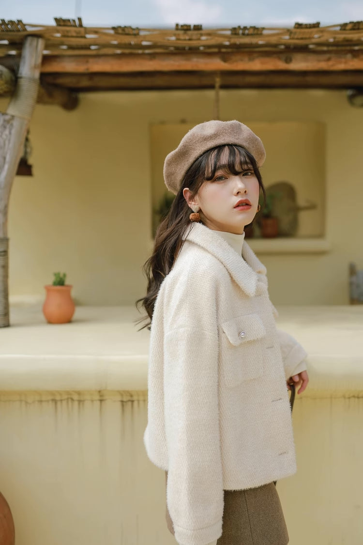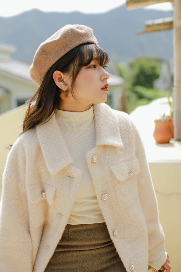 Faux short-hair mink jacket with a button-up front, collar, chest pockets and slightly cropped length.