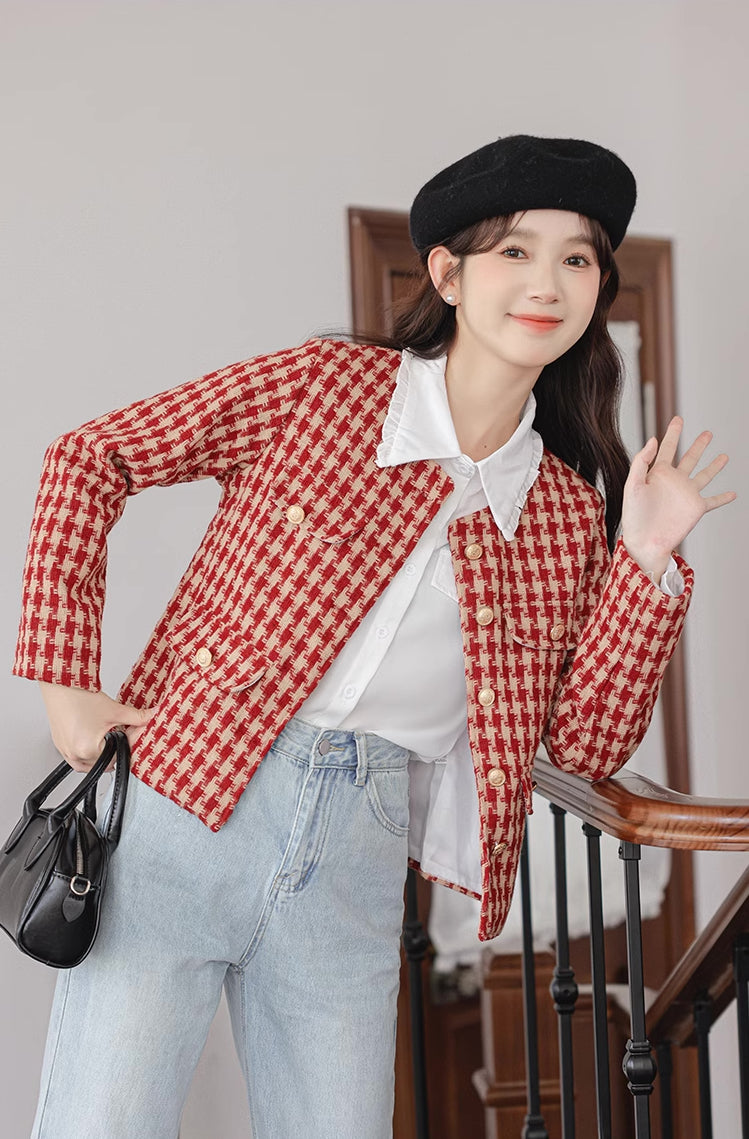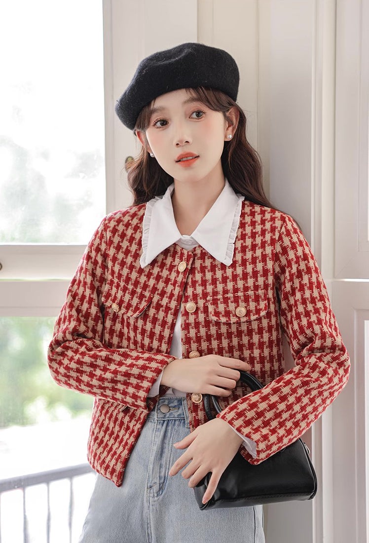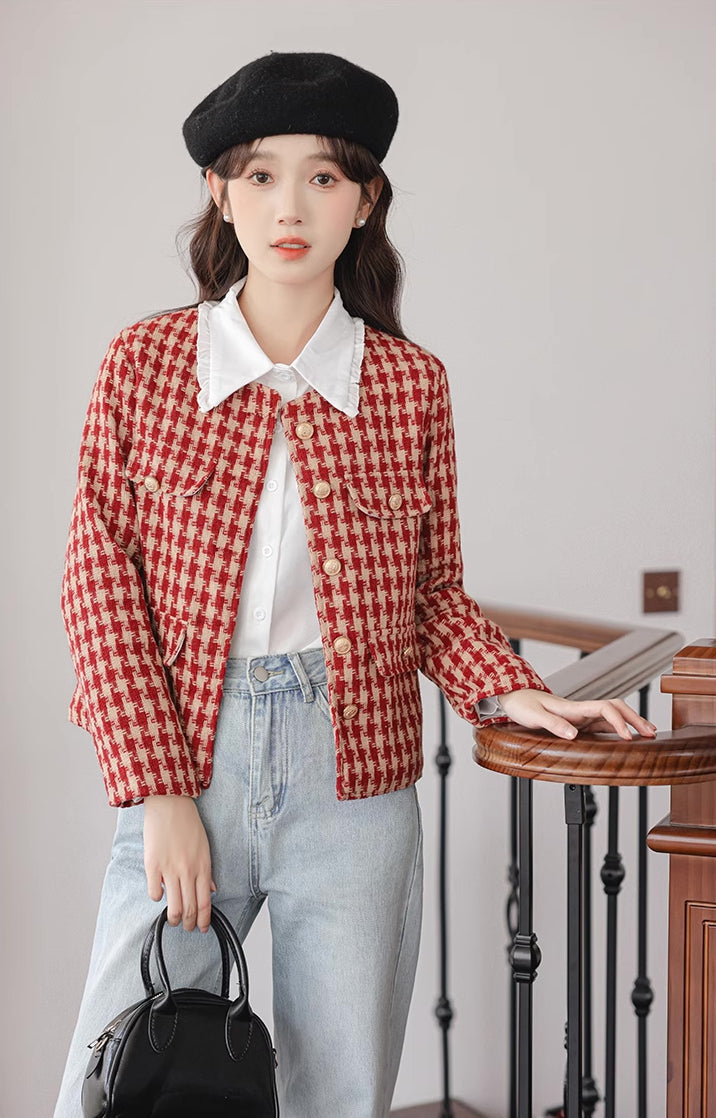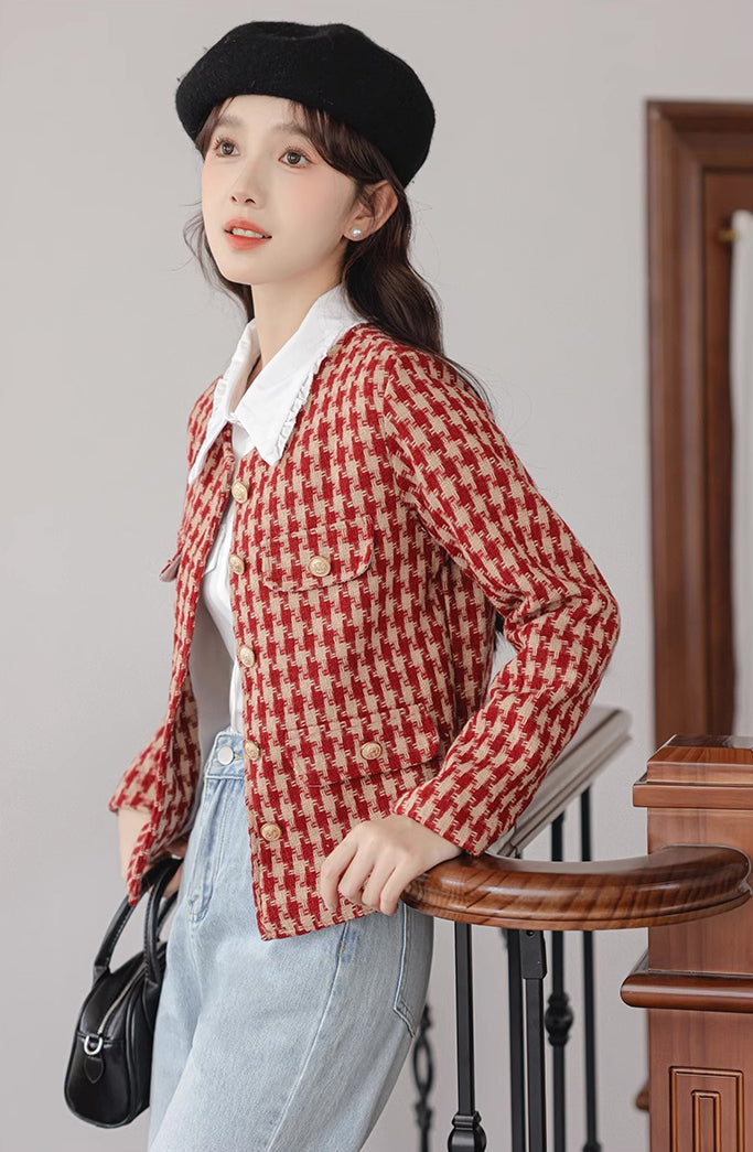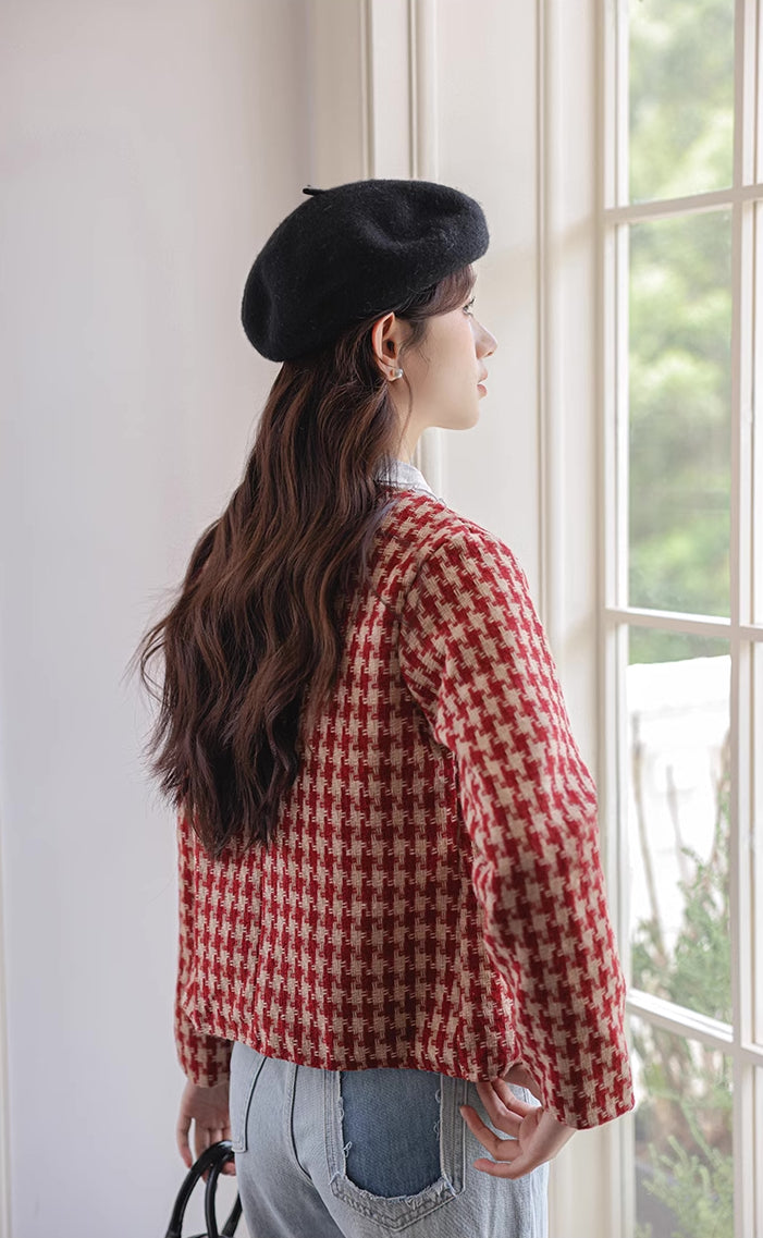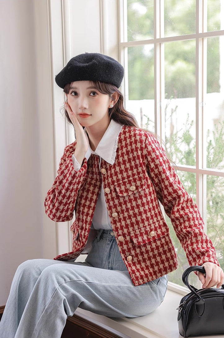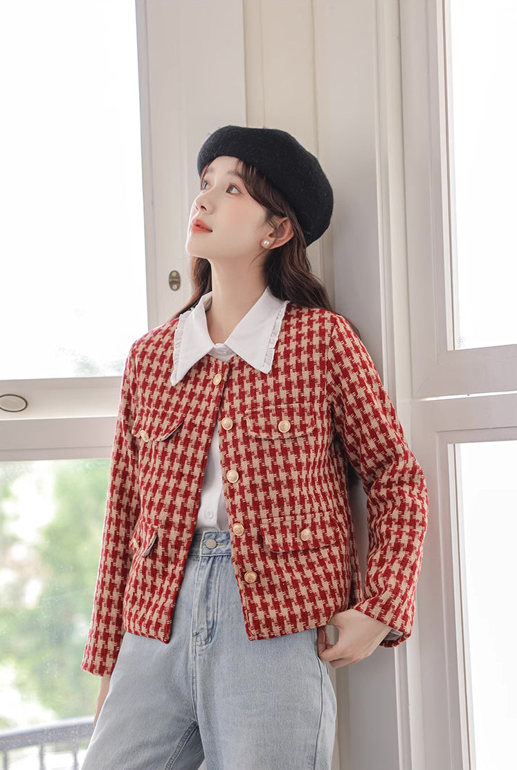 Round neck jacket made with a houndstooth tweed fabric and features stunning gold buttons and faux pockets. Lined.