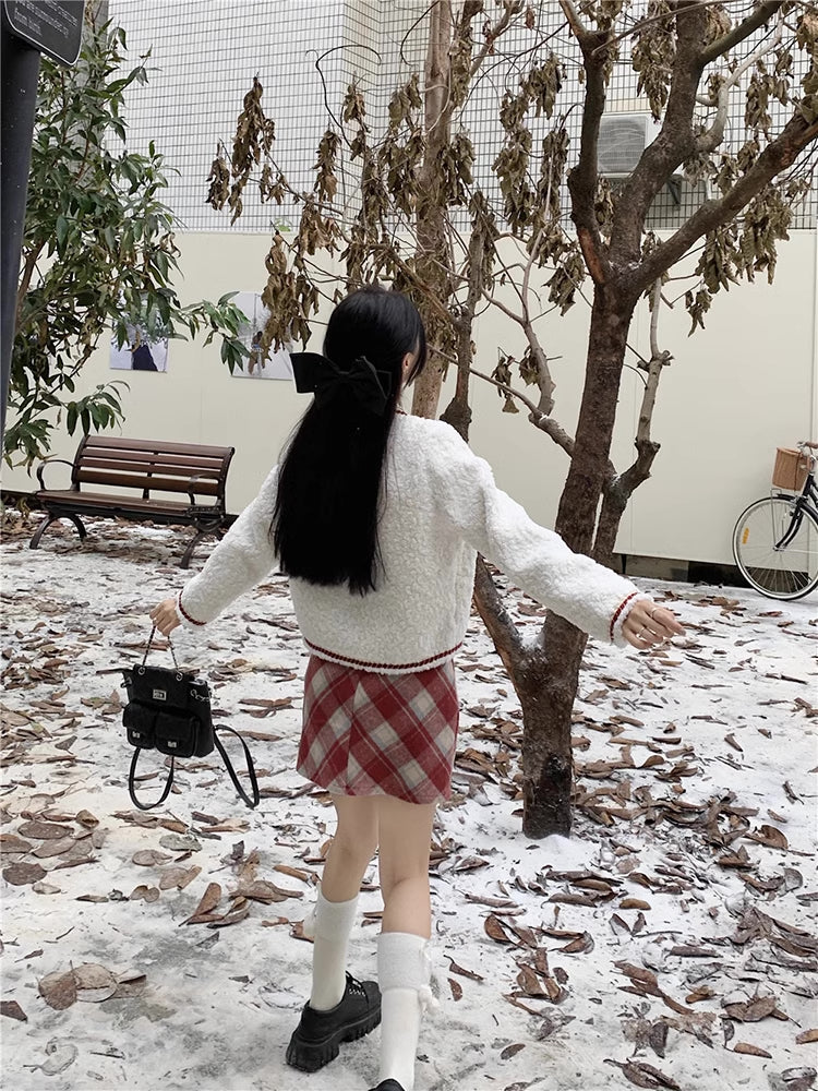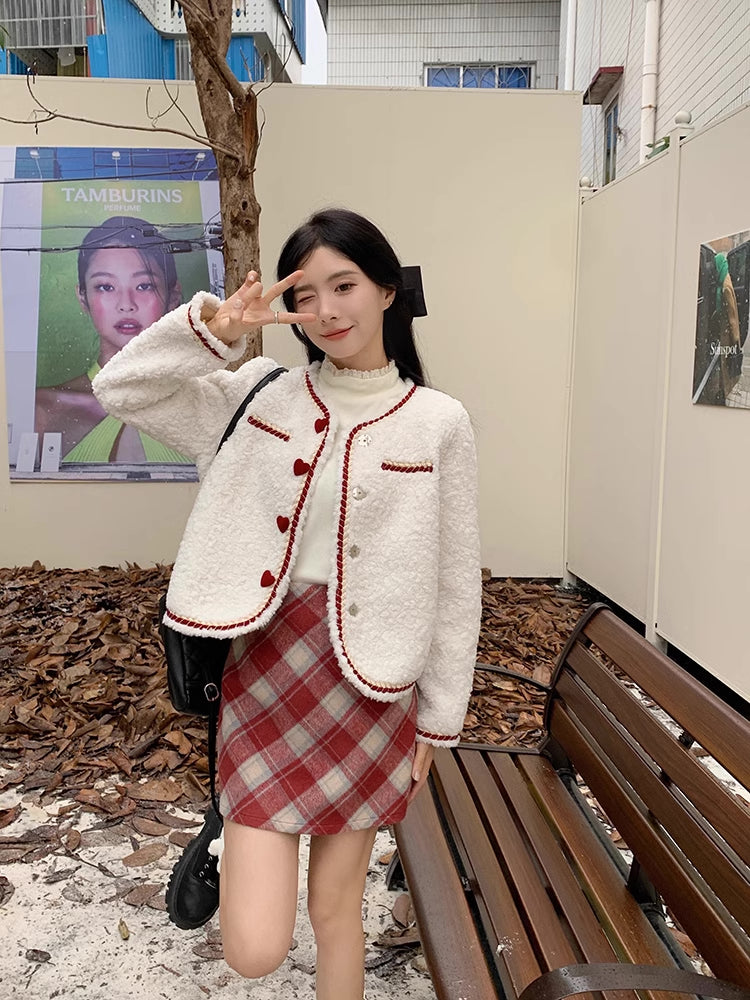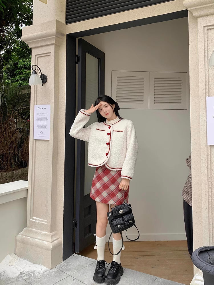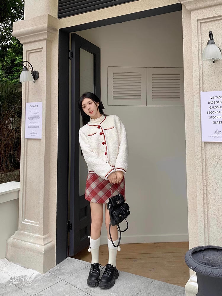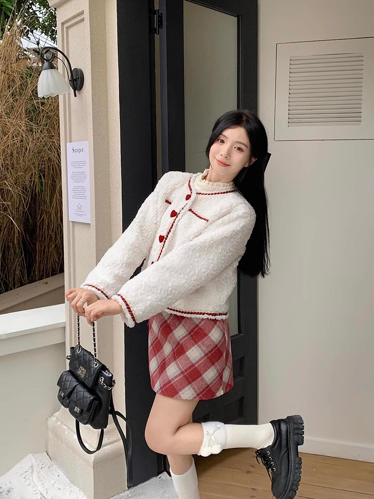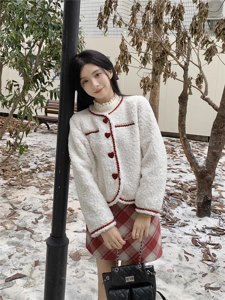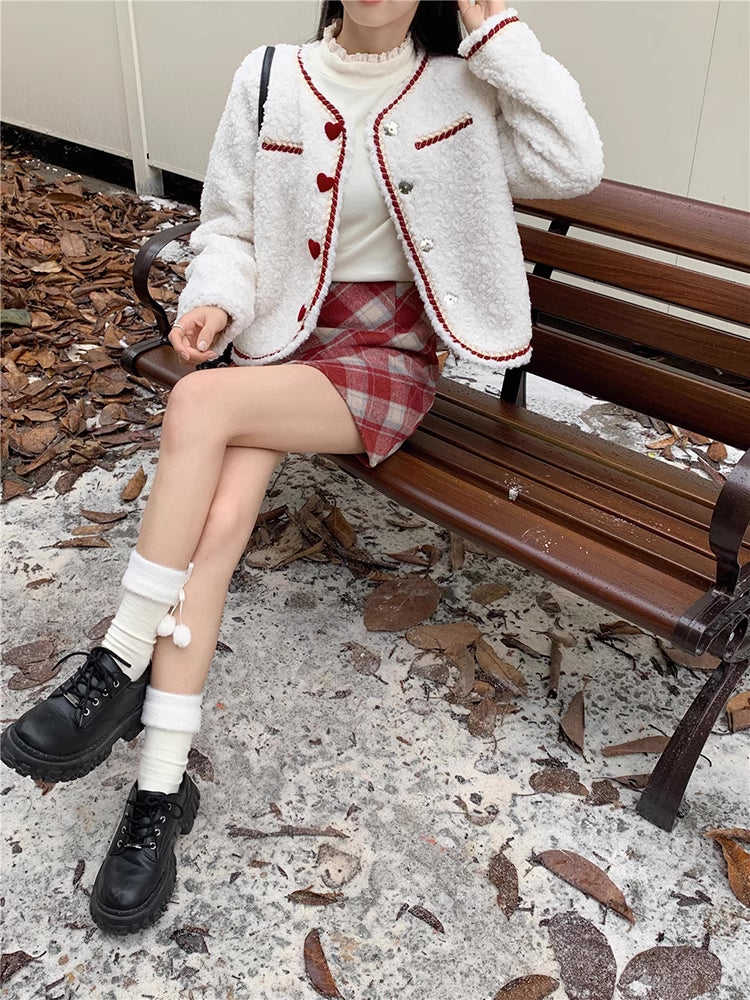 Faux sherpa jacket with a round neckline, braided tweed trims and heart snap buttons. Slightly cropped.