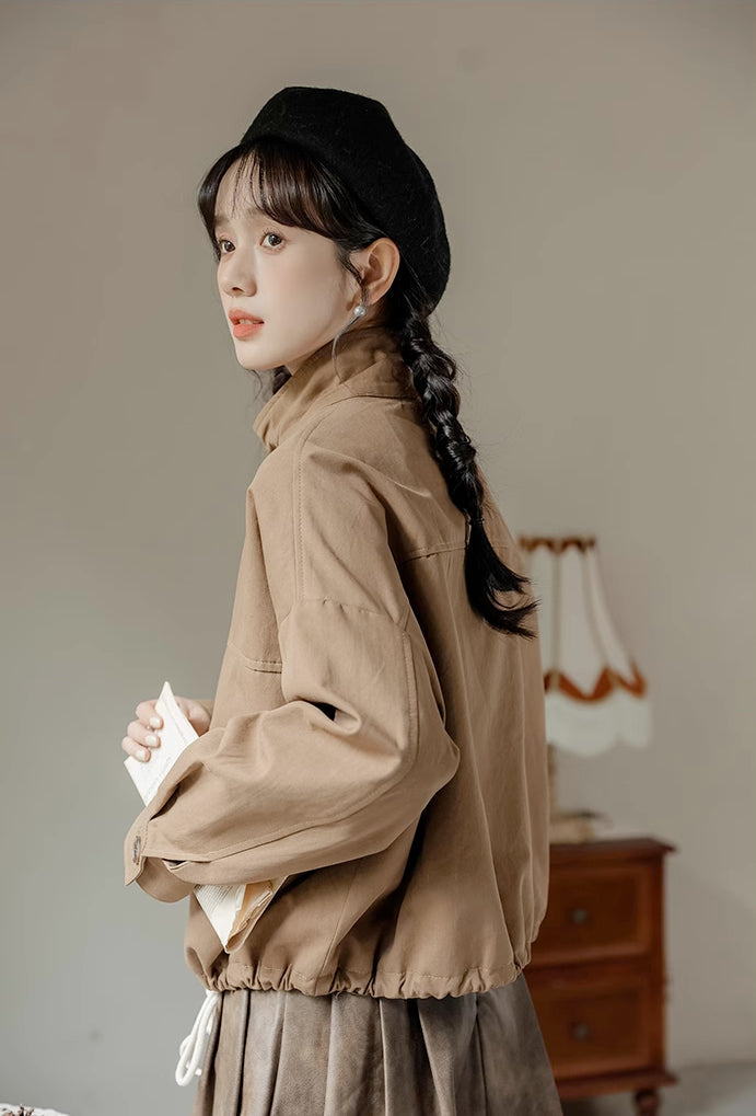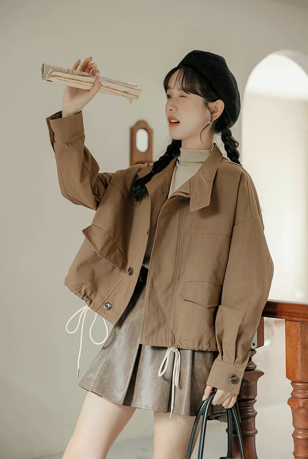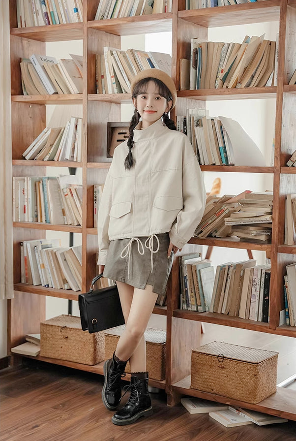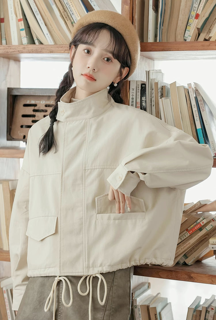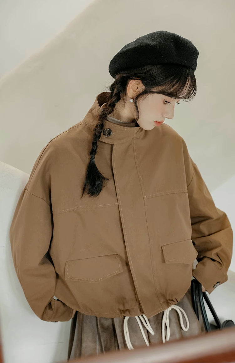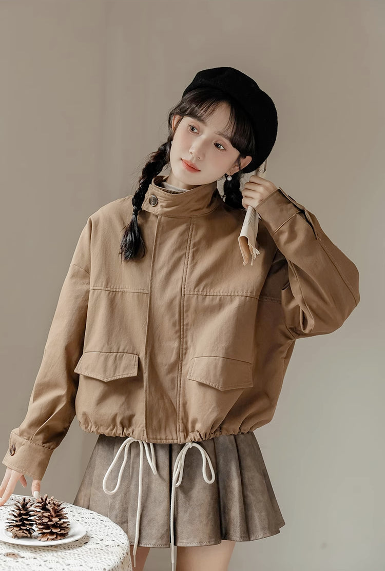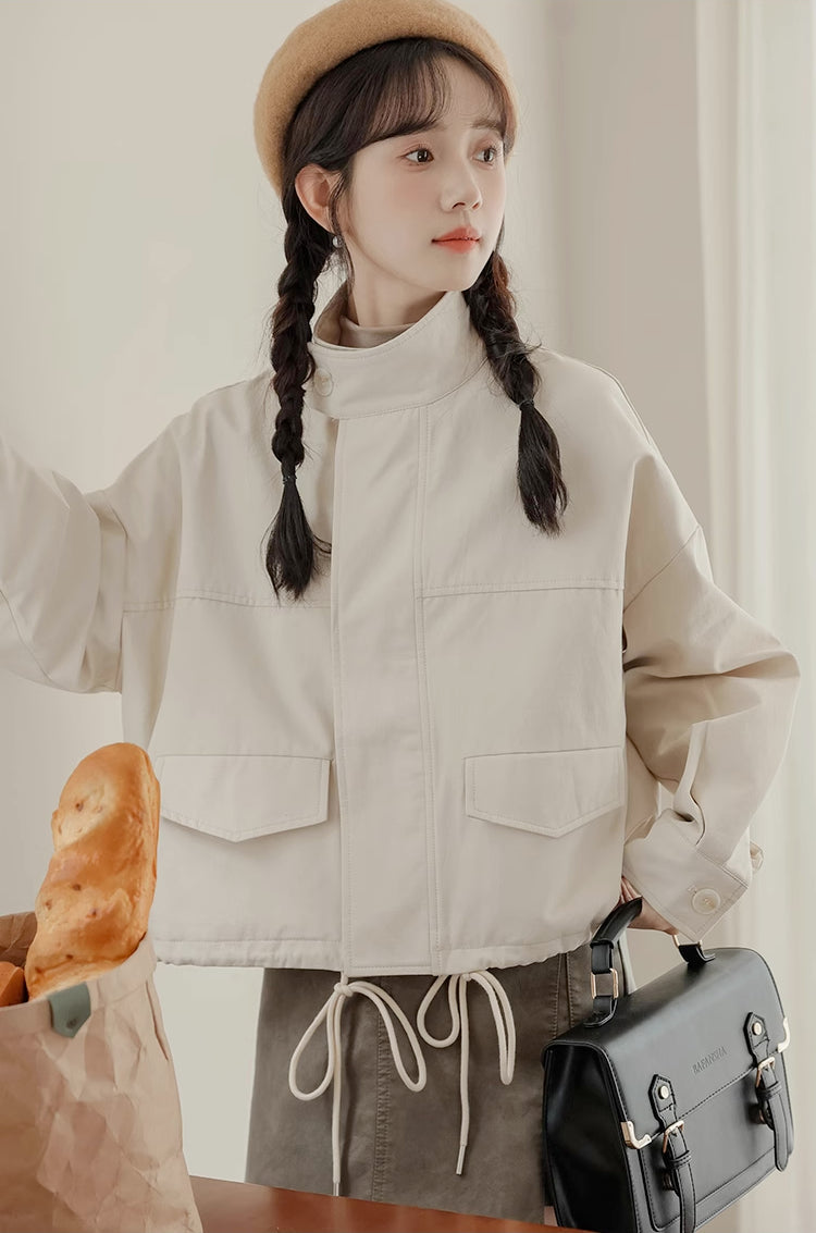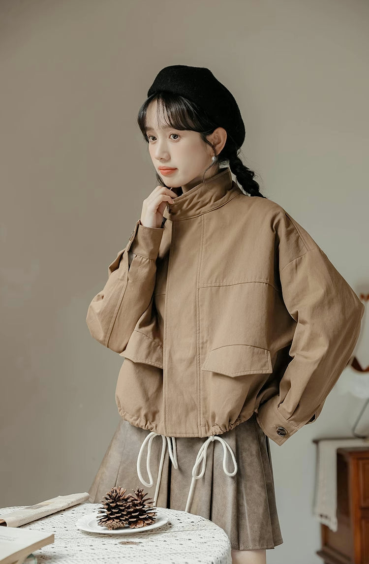 Oversized workman jacket with hidden button plackets, high collar neckline, side pockets and adjustable shoe-string hem.聽