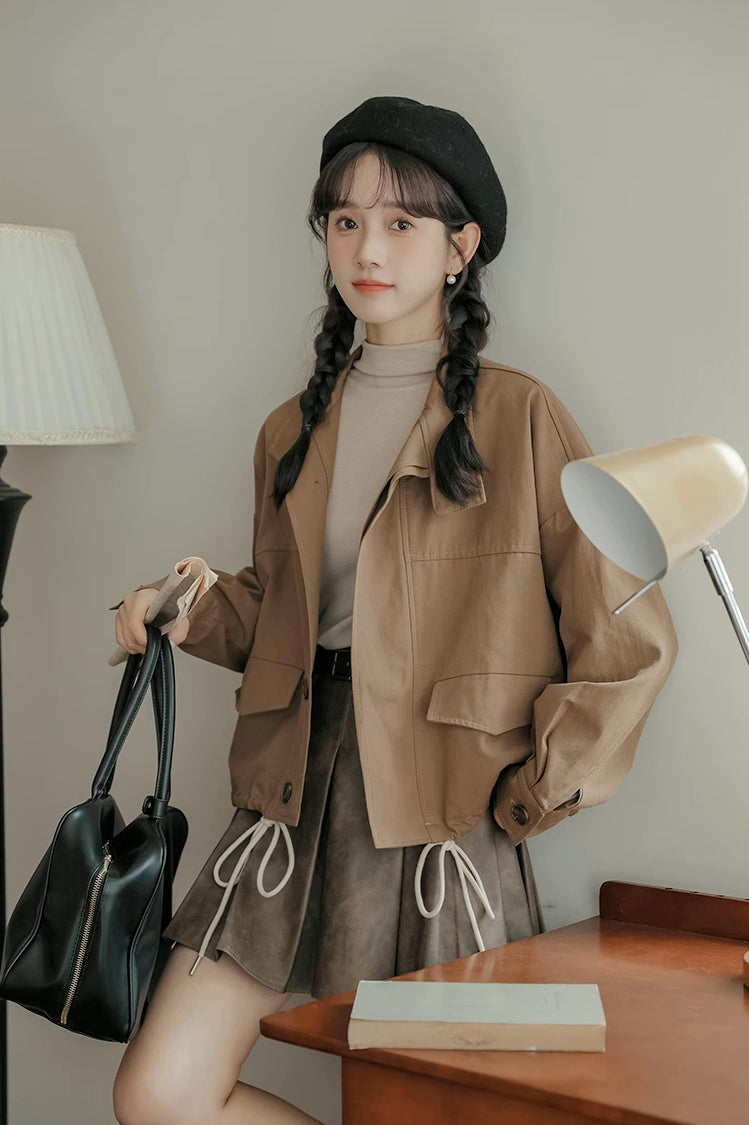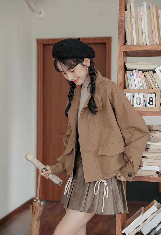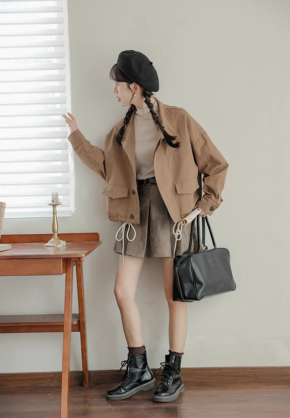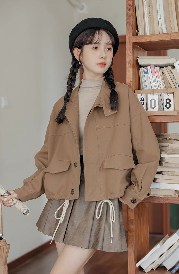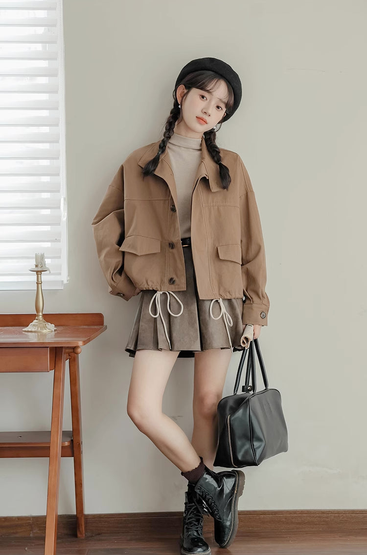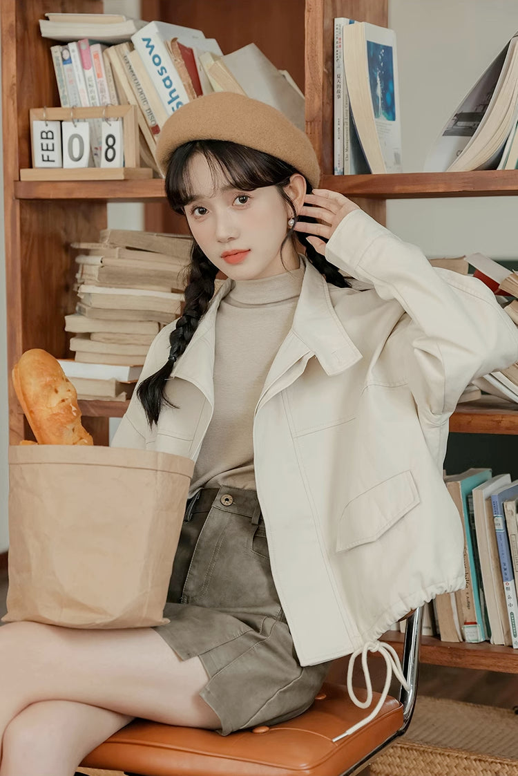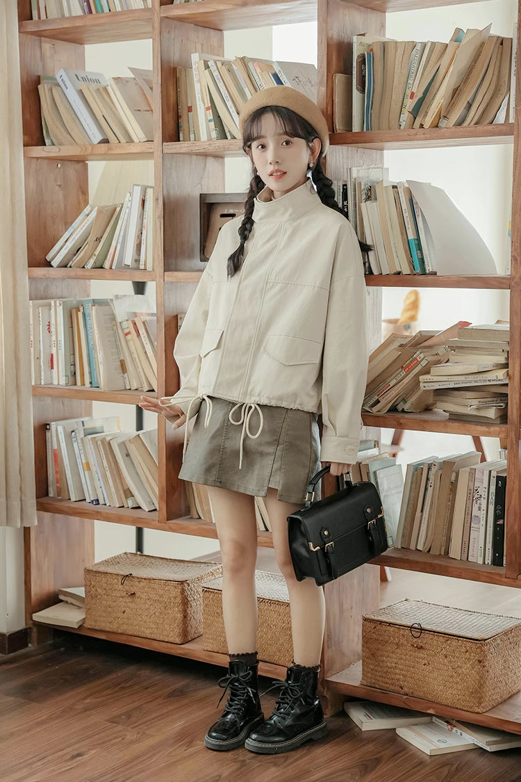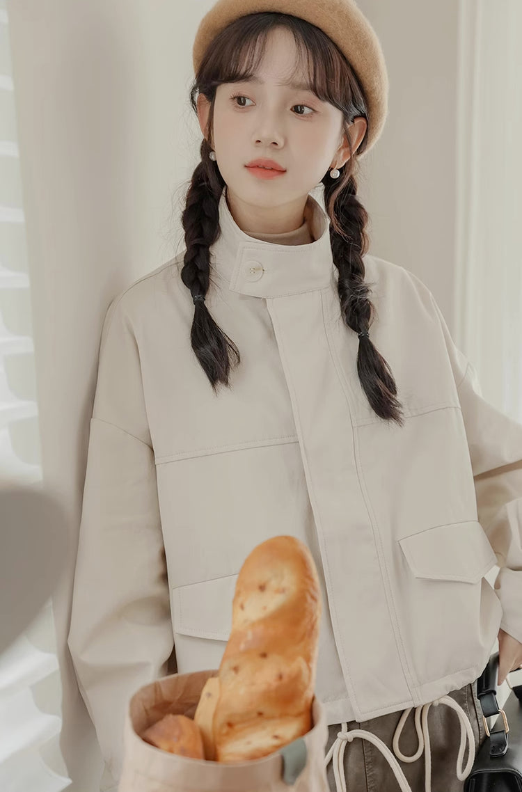 Oversized workman jacket with hidden button plackets, high collar neckline, side pockets and adjustable shoe-string hem.聽