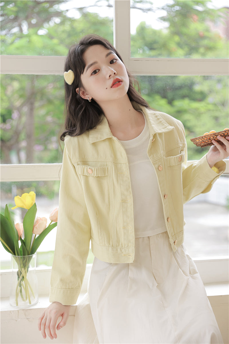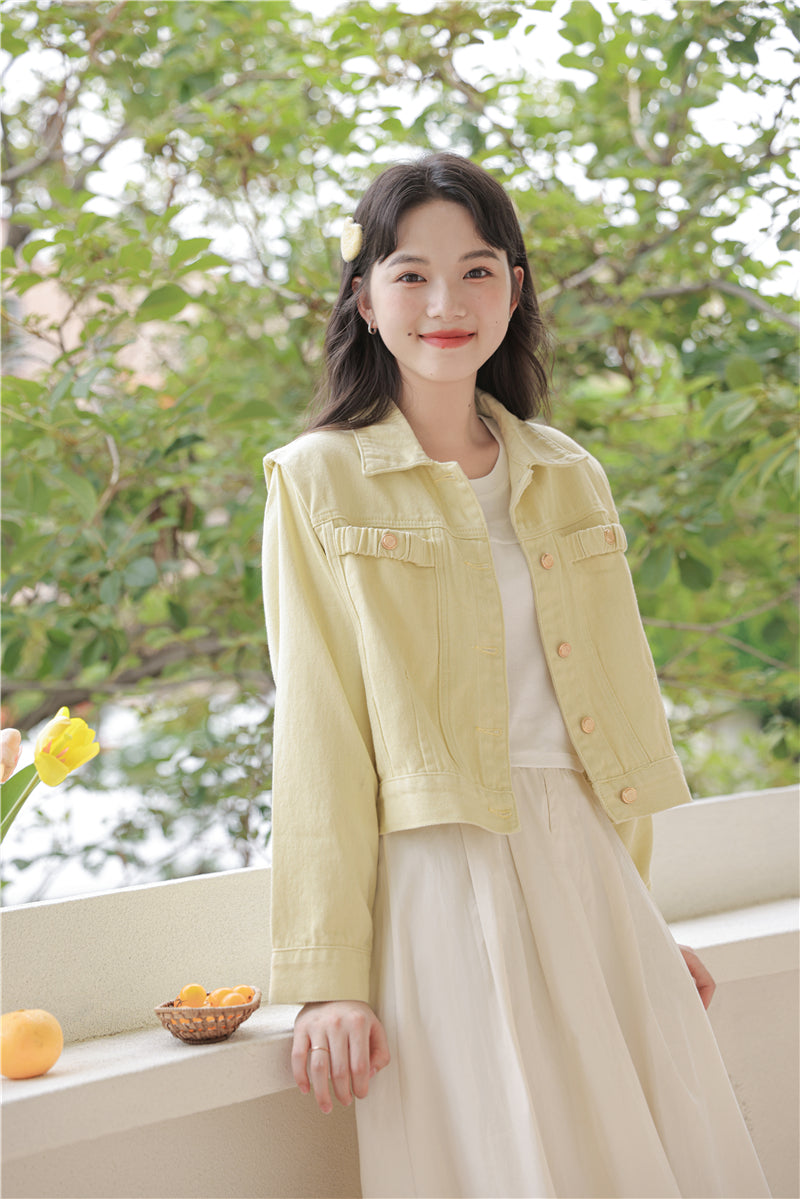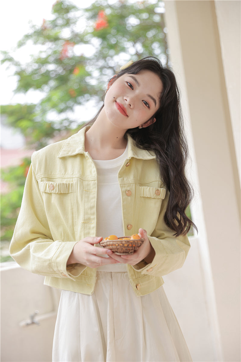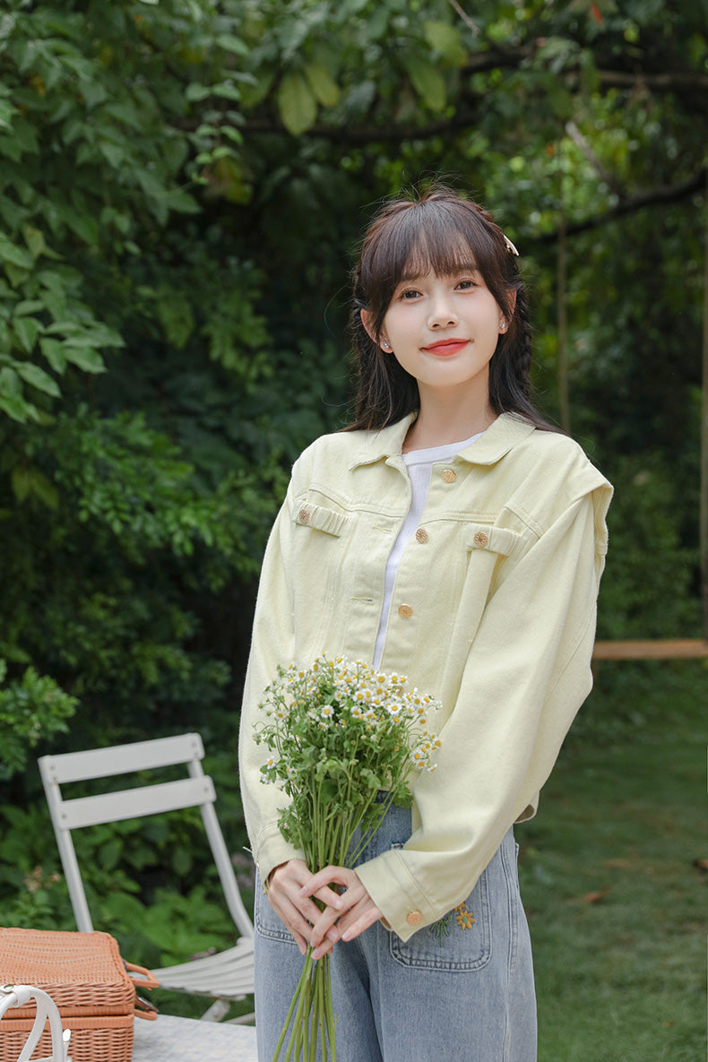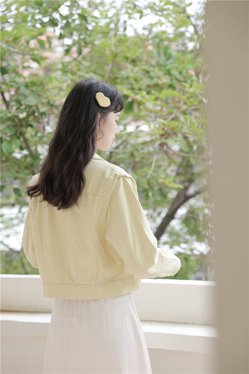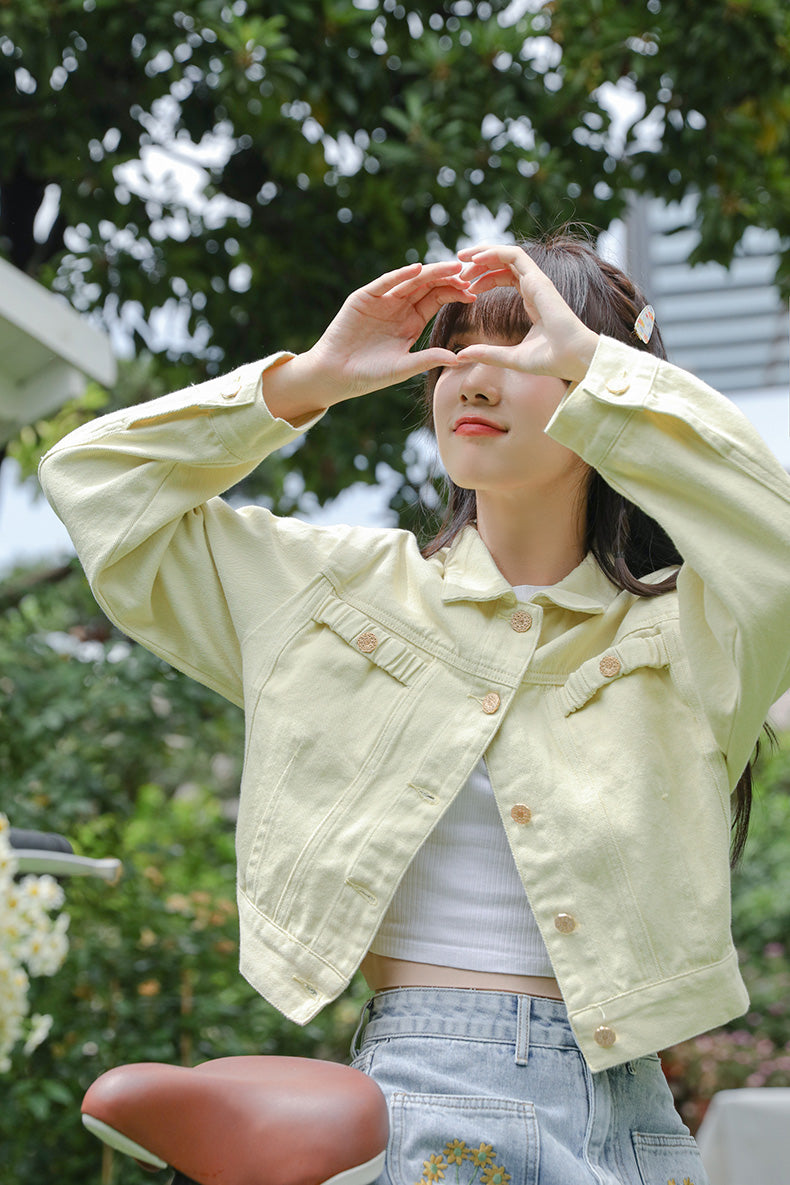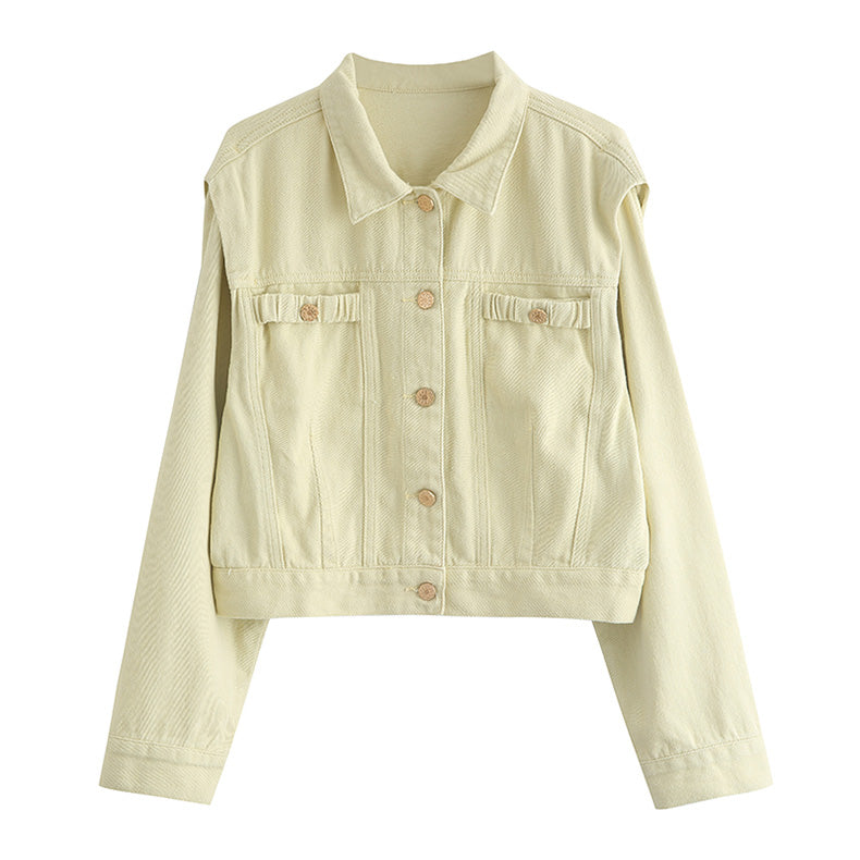 Cropped denim jacket in a light yellow with slightly accentuated shoulders and ruched pocket slits.聽