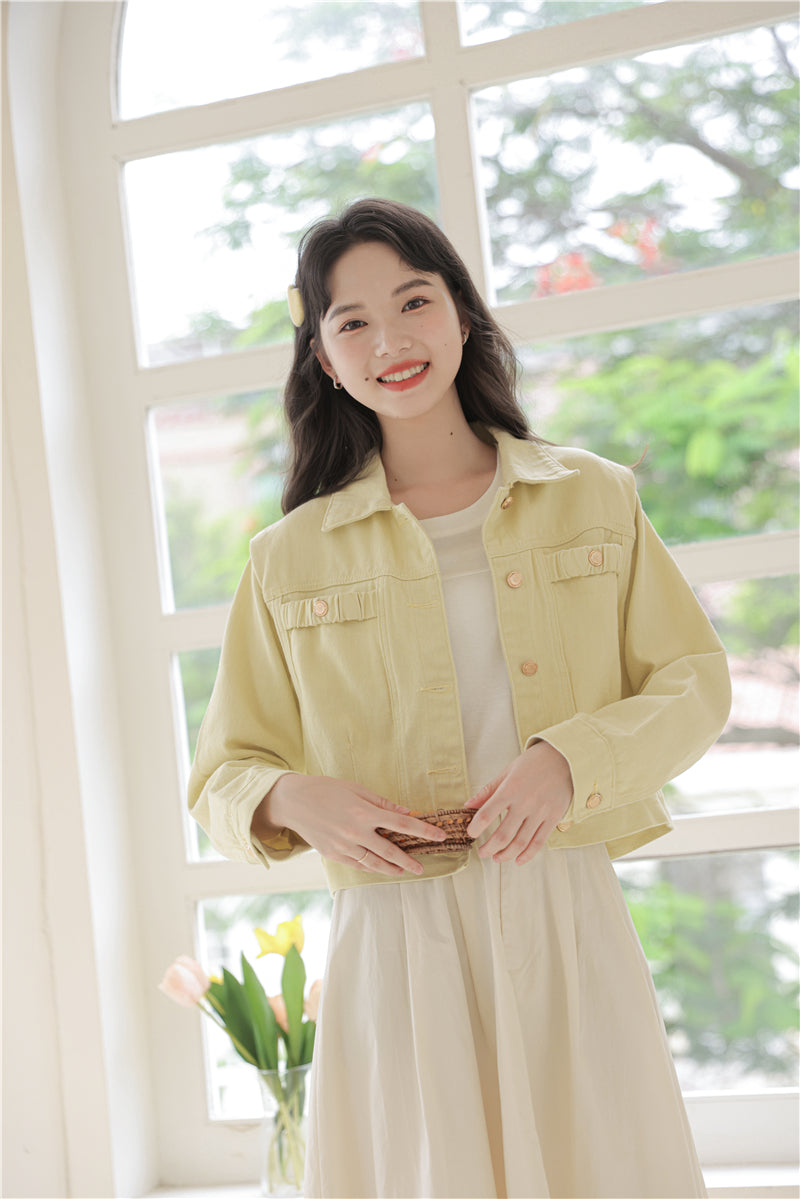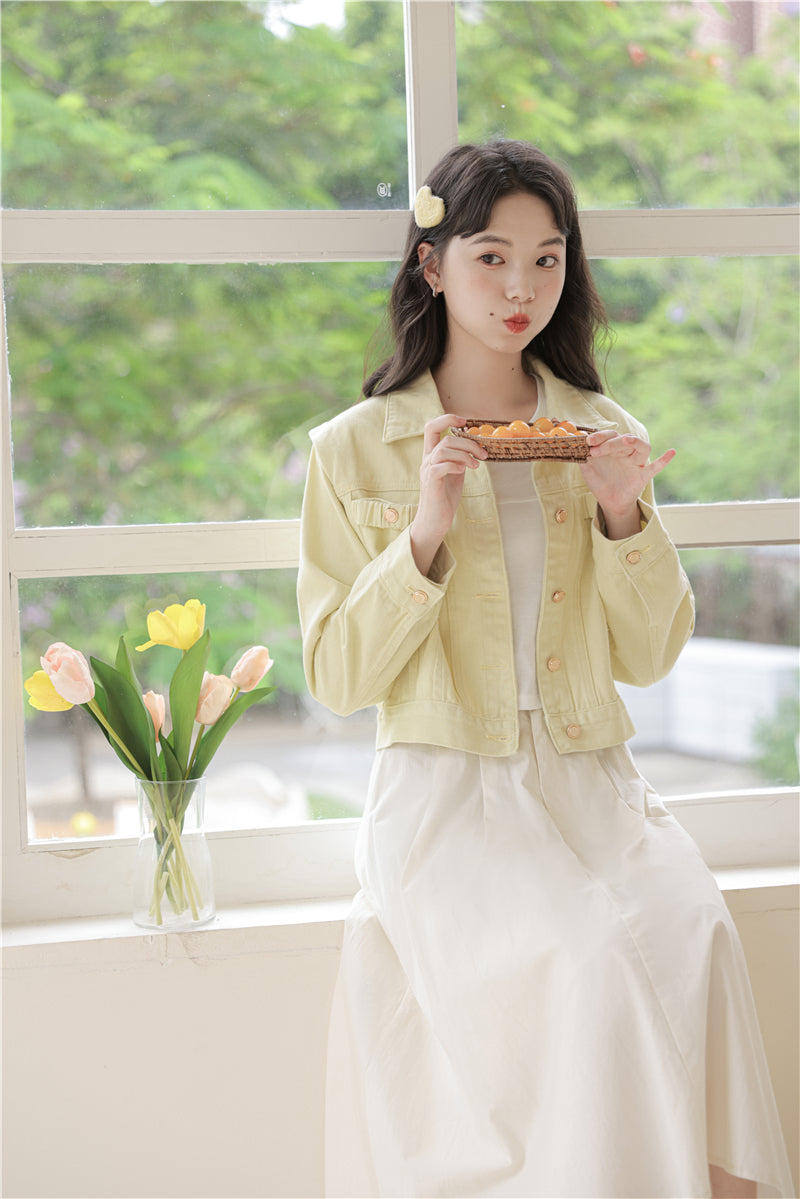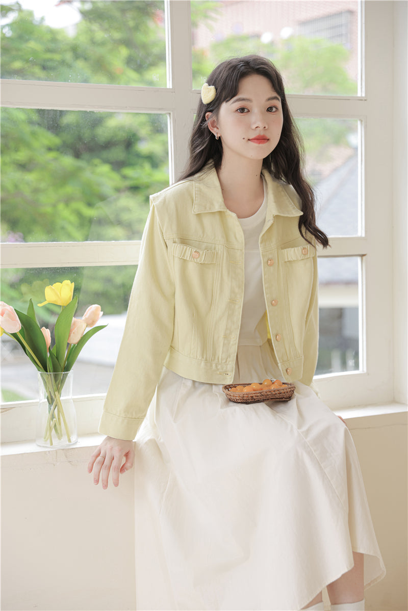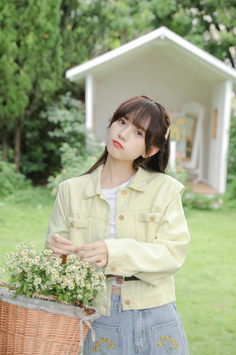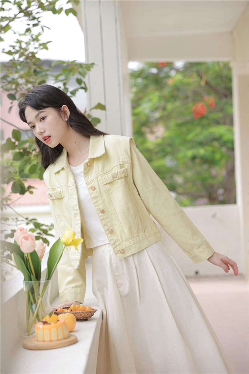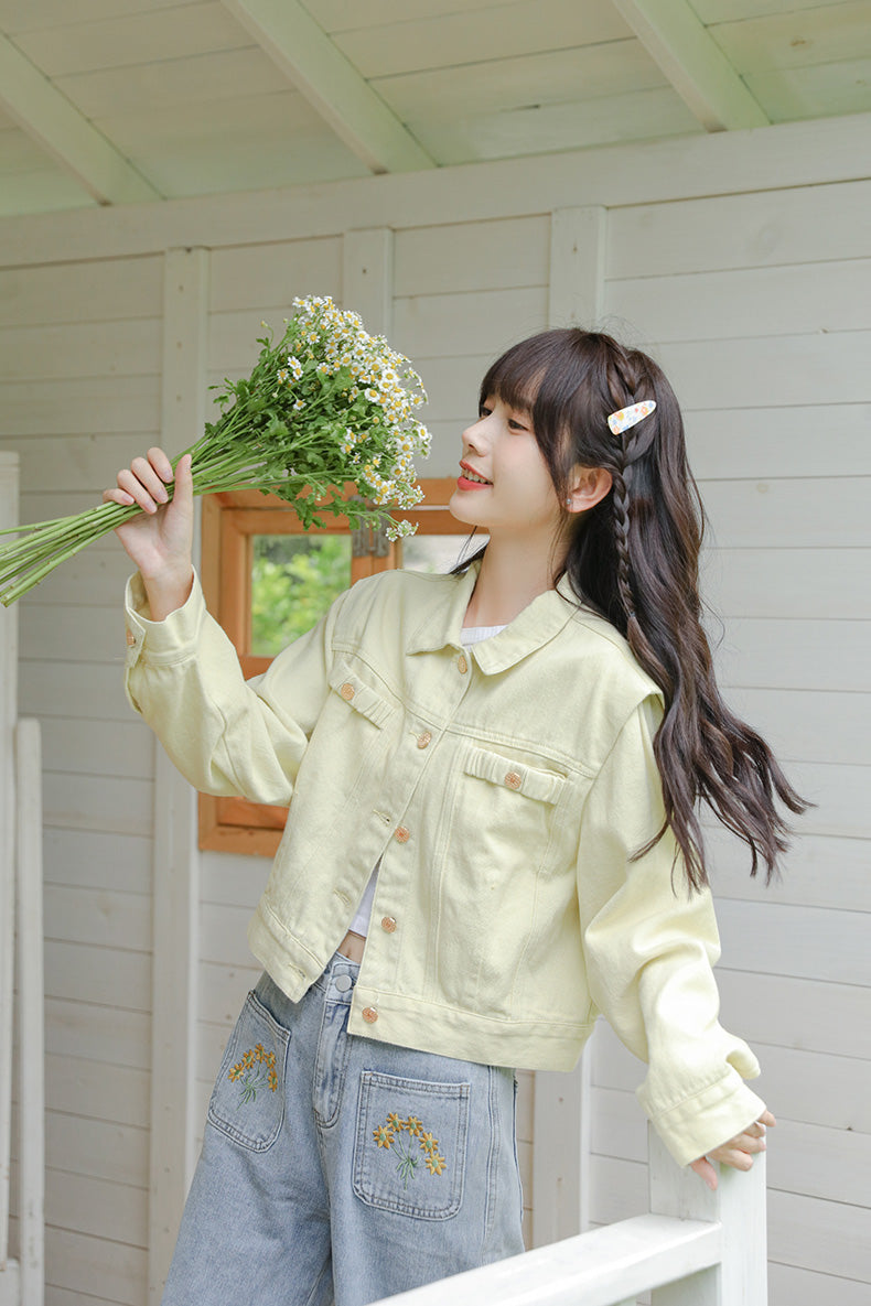 Cropped denim jacket in a light yellow with slightly accentuated shoulders and ruched pocket slits.聽