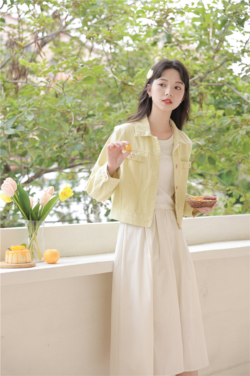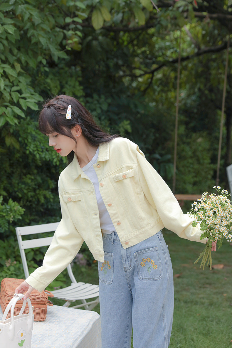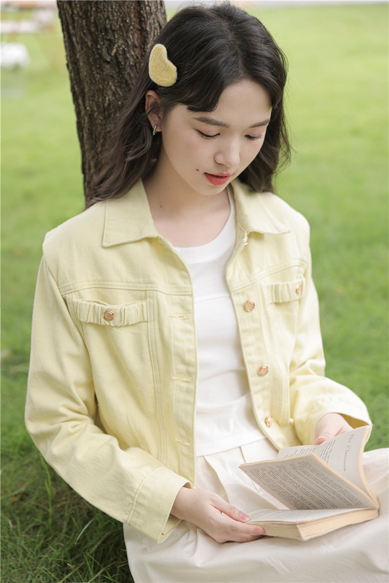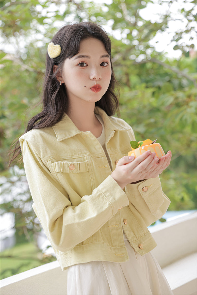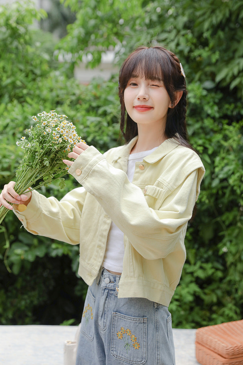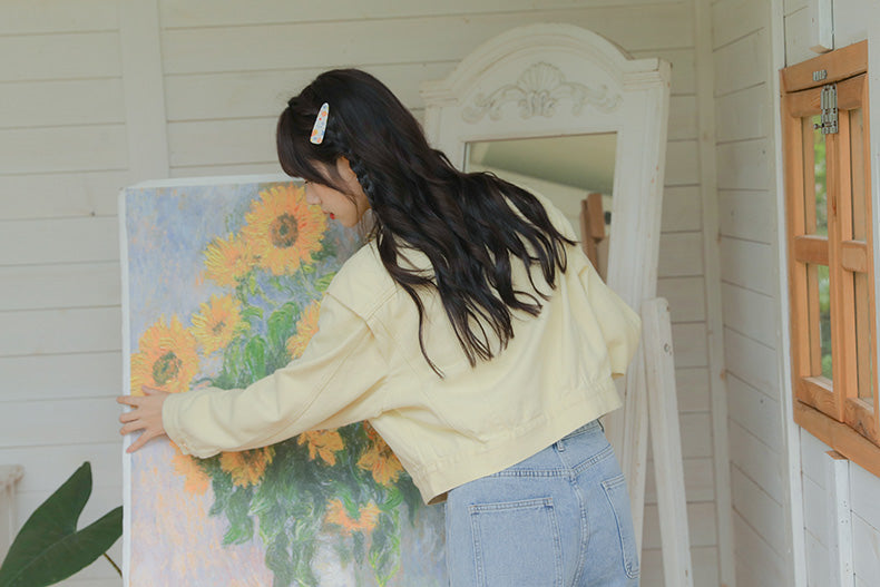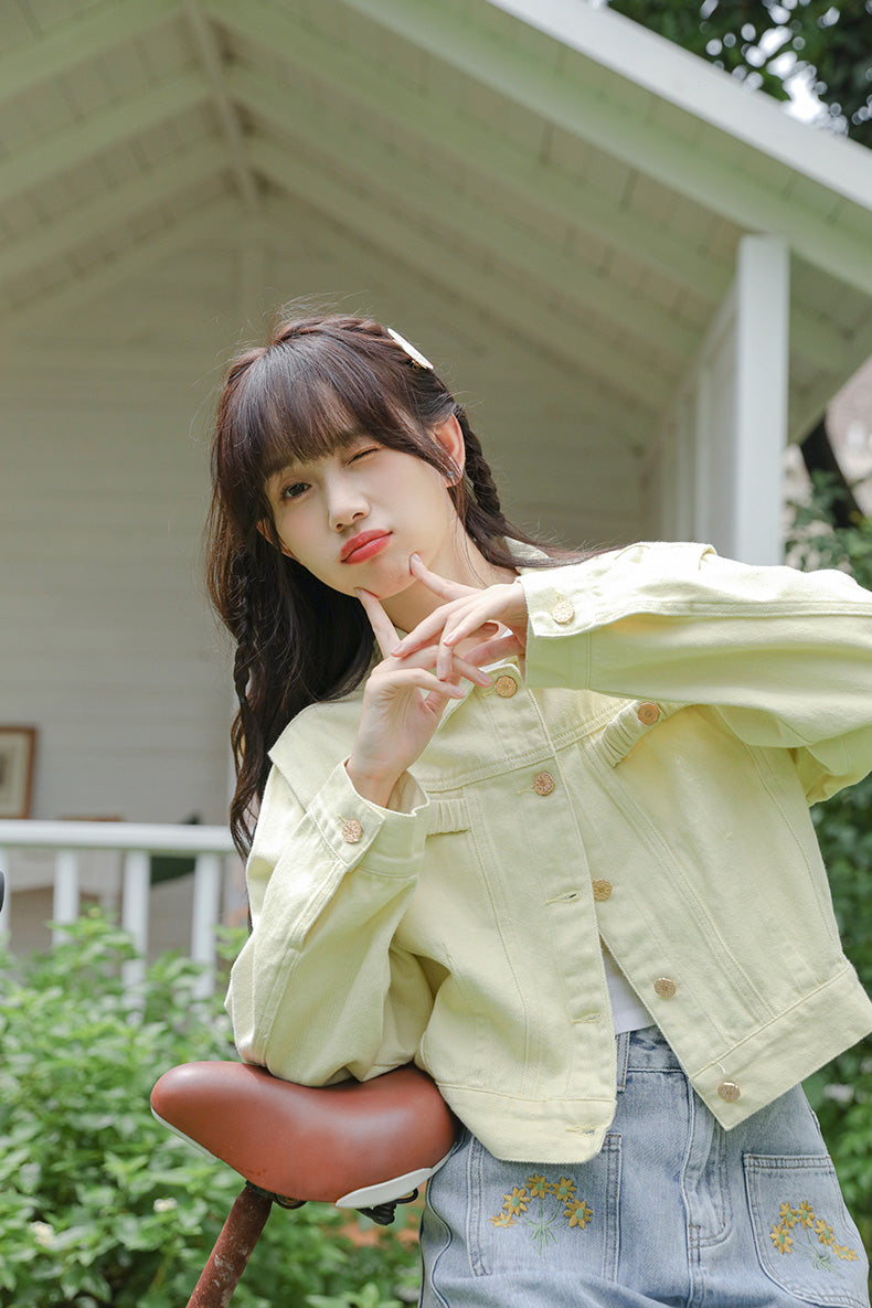 Cropped denim jacket in a light yellow with slightly accentuated shoulders and ruched pocket slits.聽