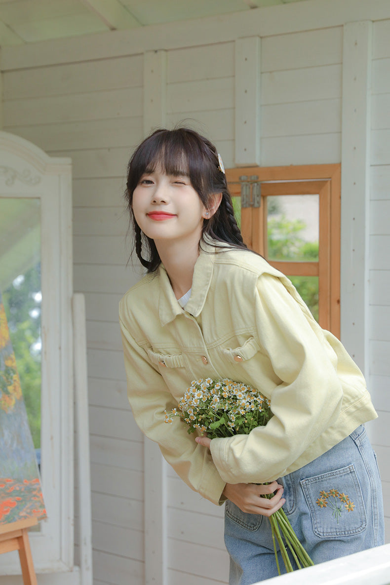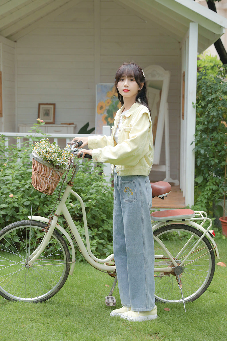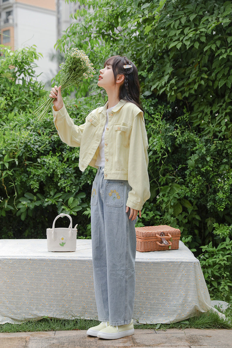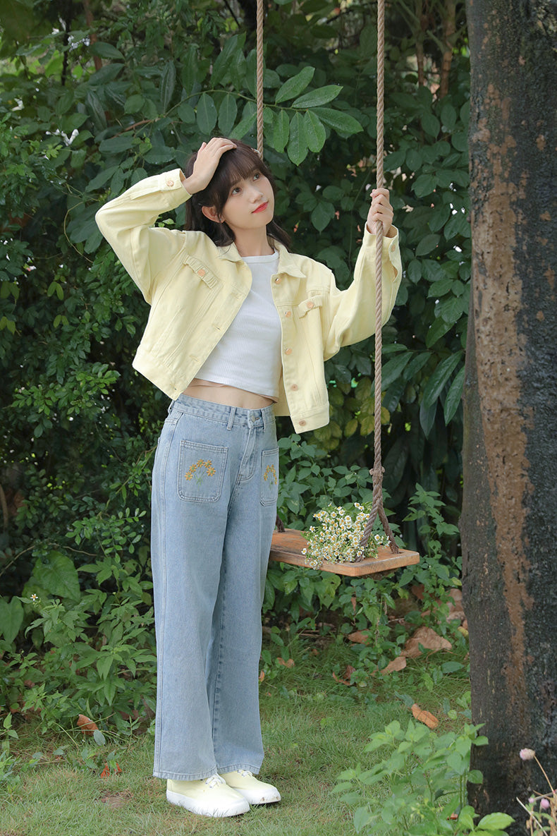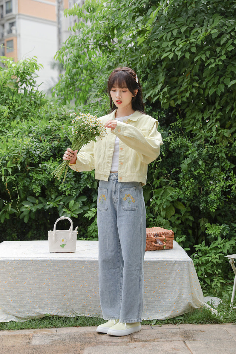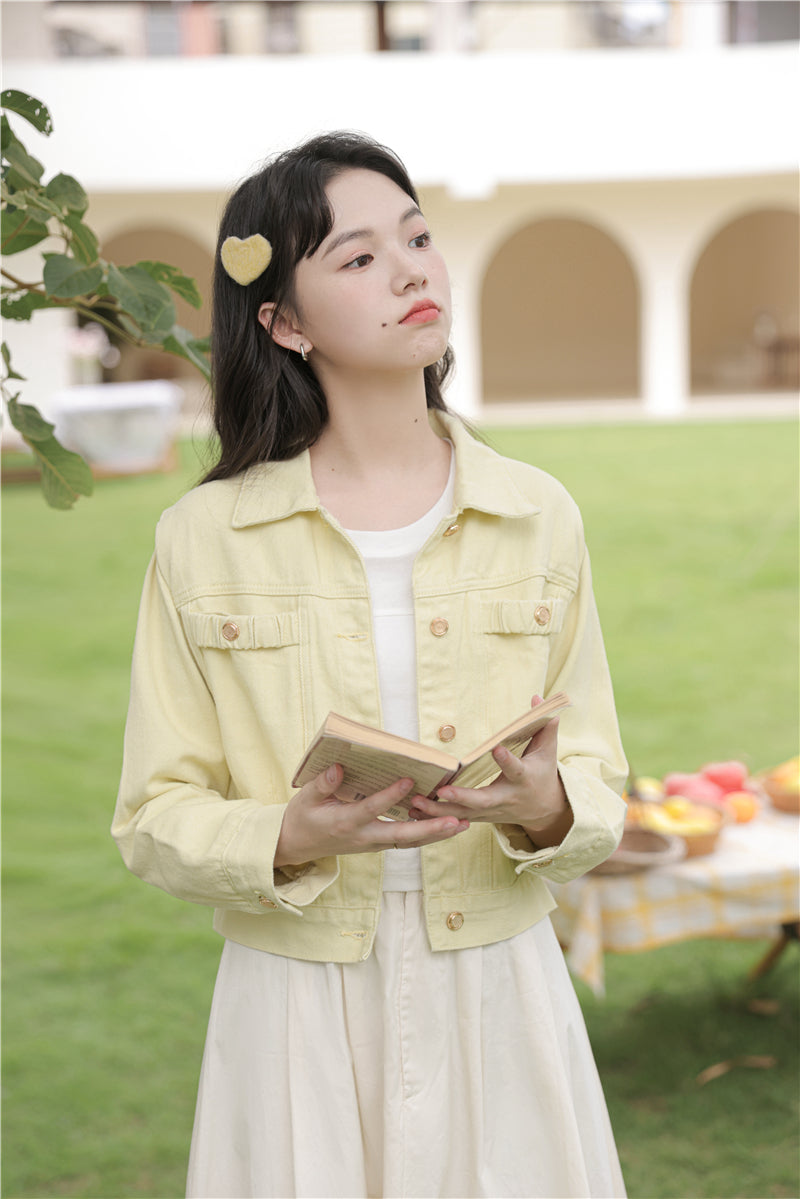 Cropped denim jacket in a light yellow with slightly accentuated shoulders and ruched pocket slits.聽