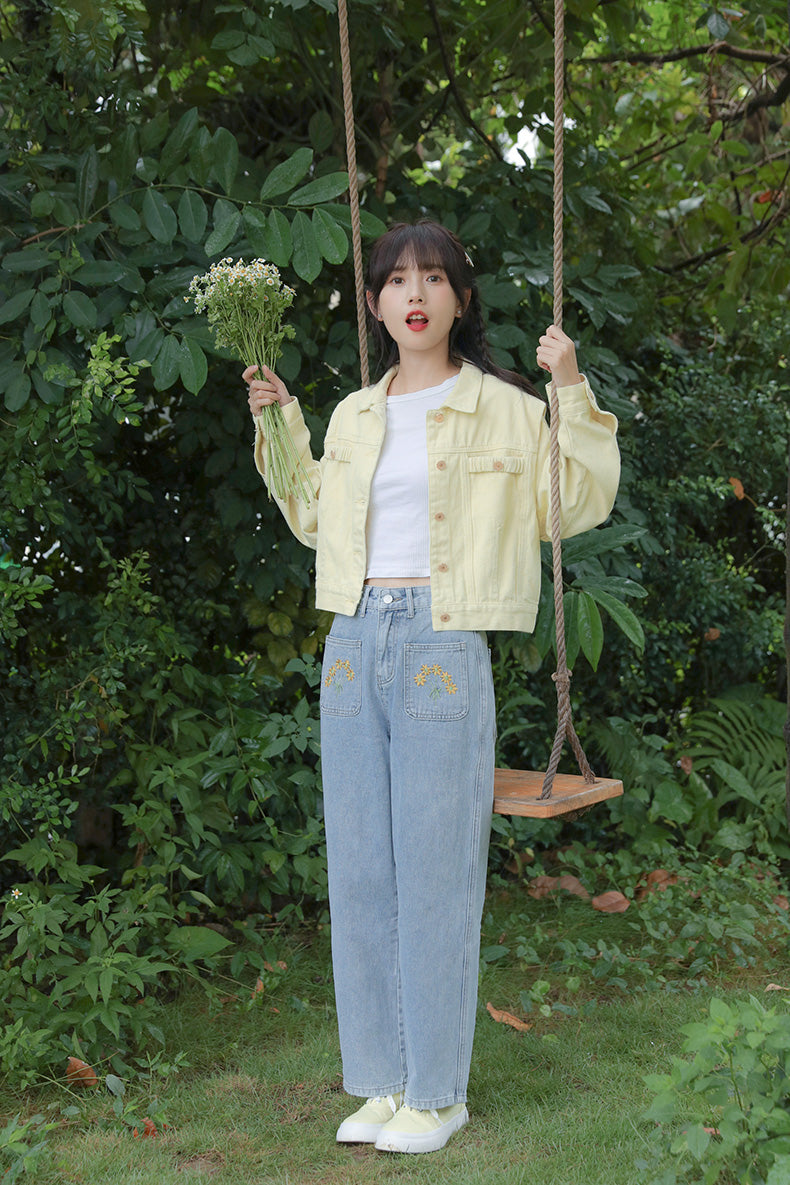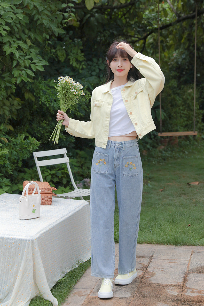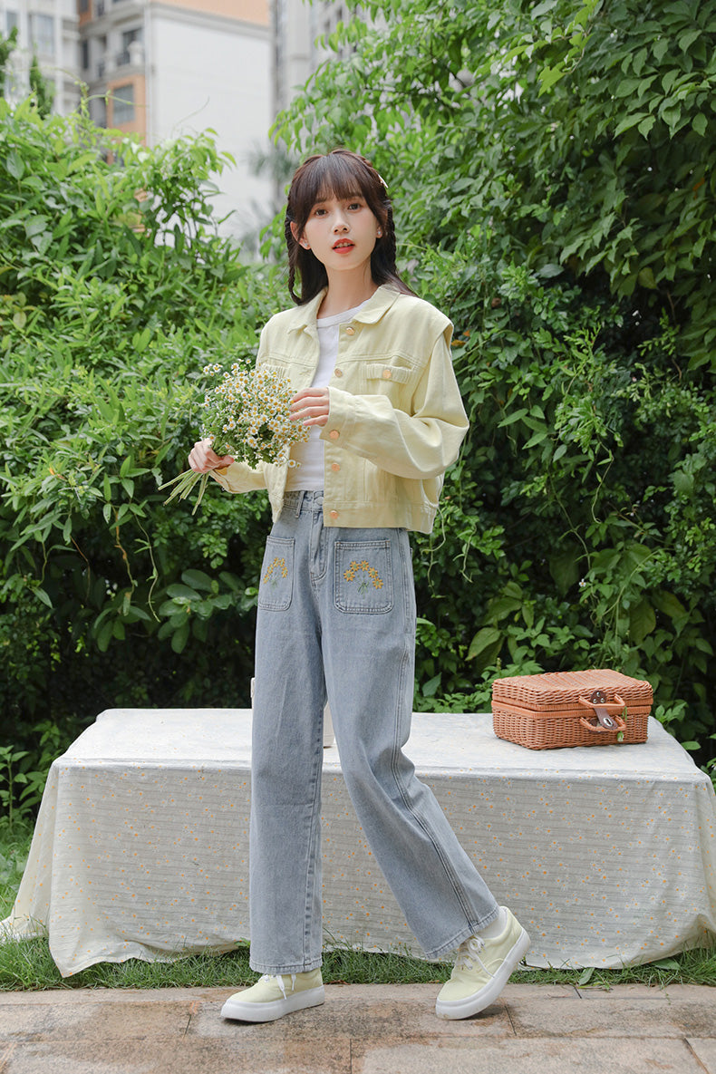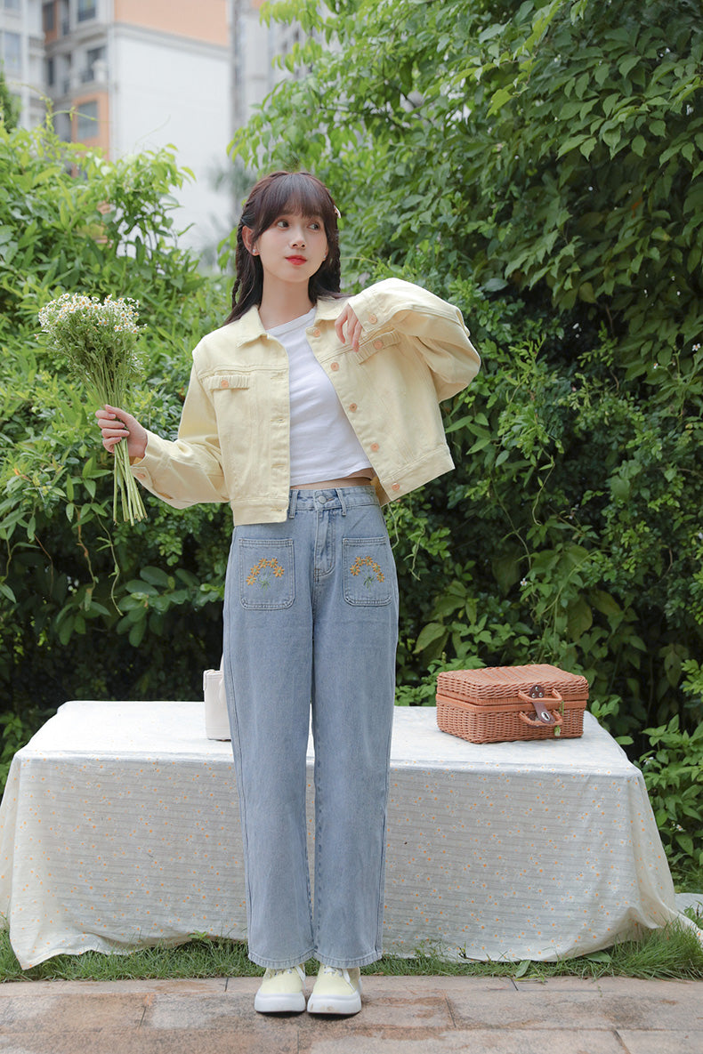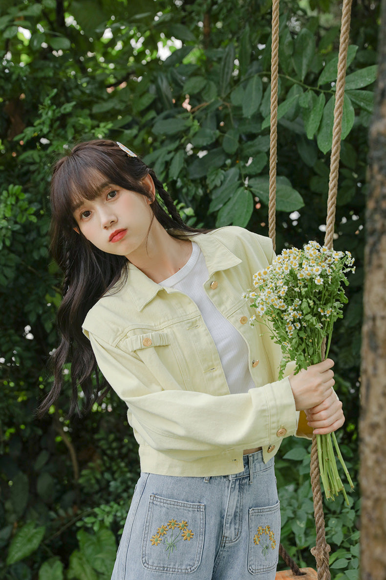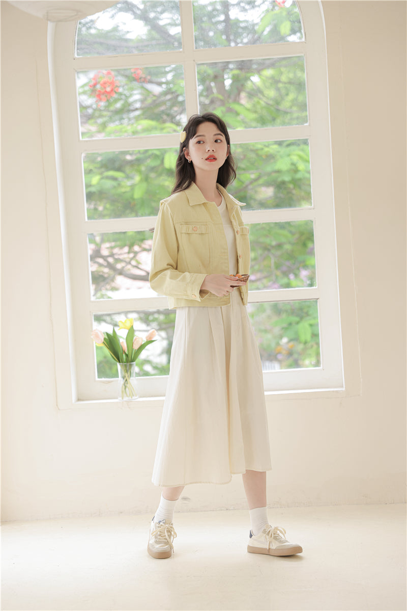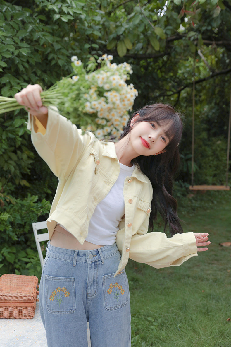 Cropped denim jacket in a light yellow with slightly accentuated shoulders and ruched pocket slits.聽