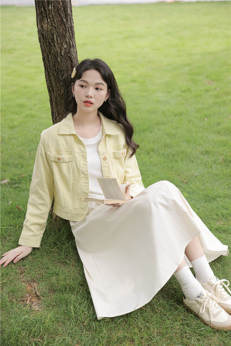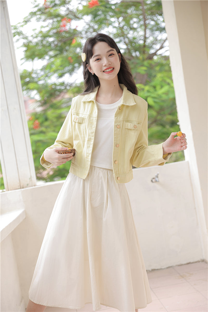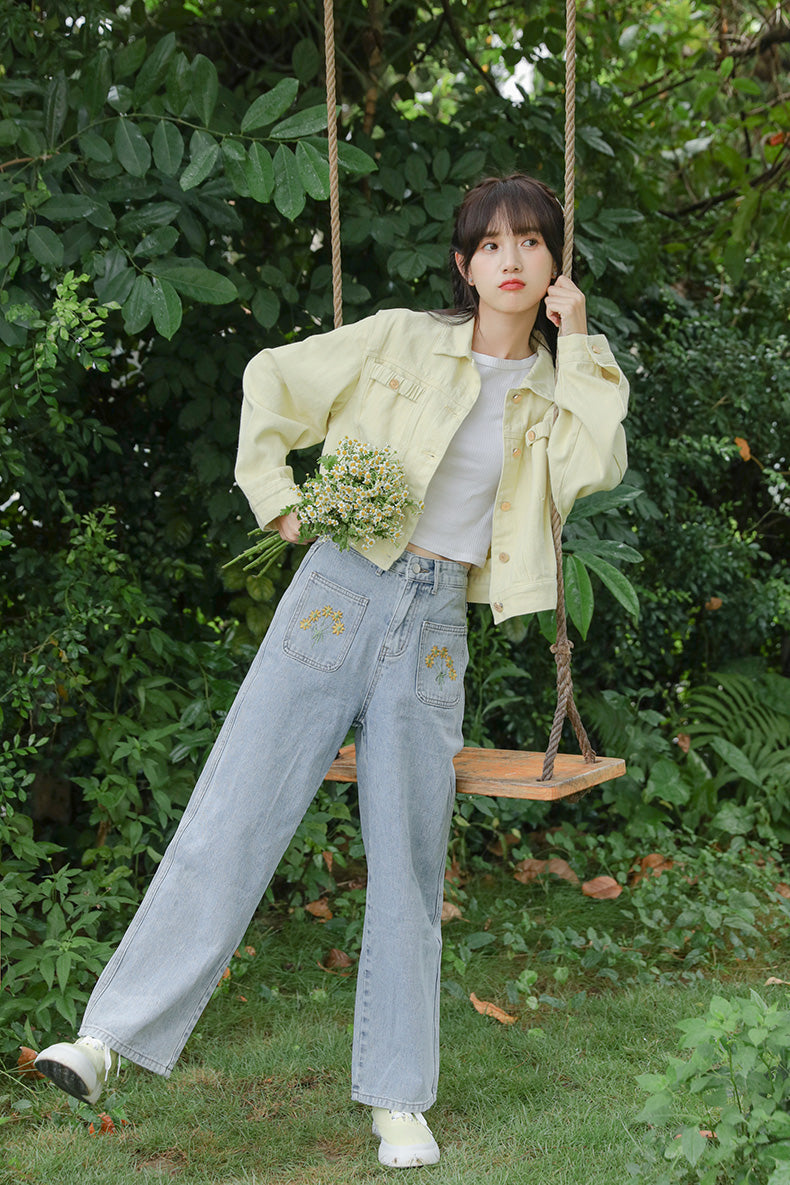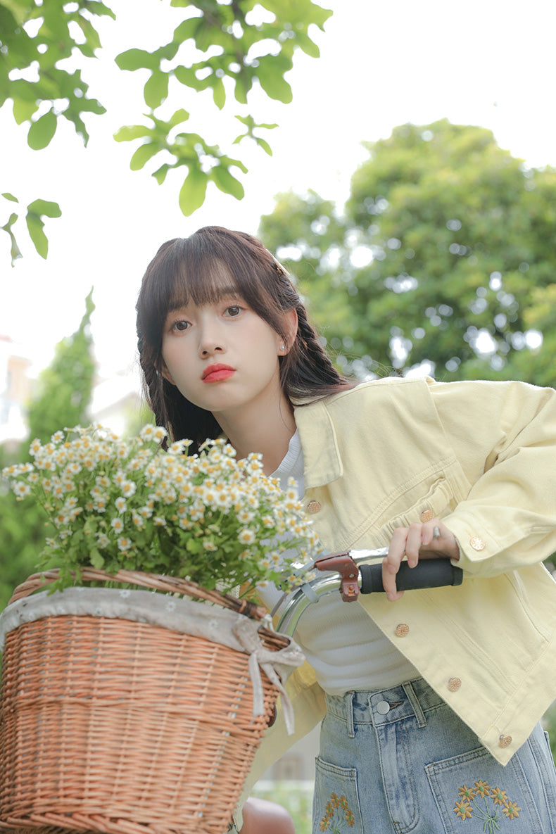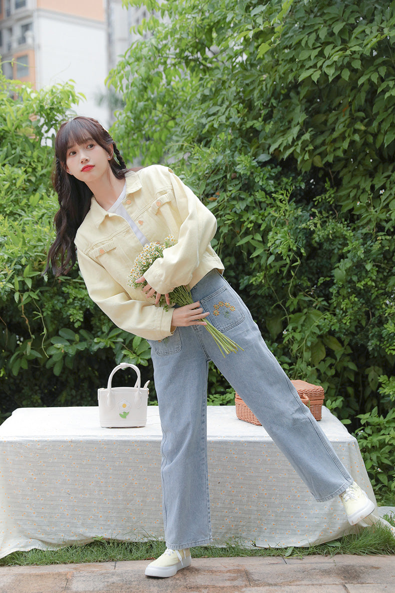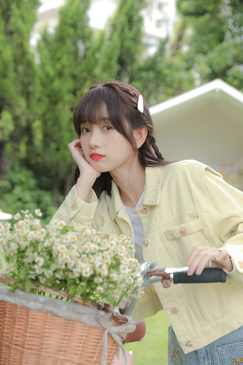 Cropped denim jacket in a light yellow with slightly accentuated shoulders and ruched pocket slits.聽