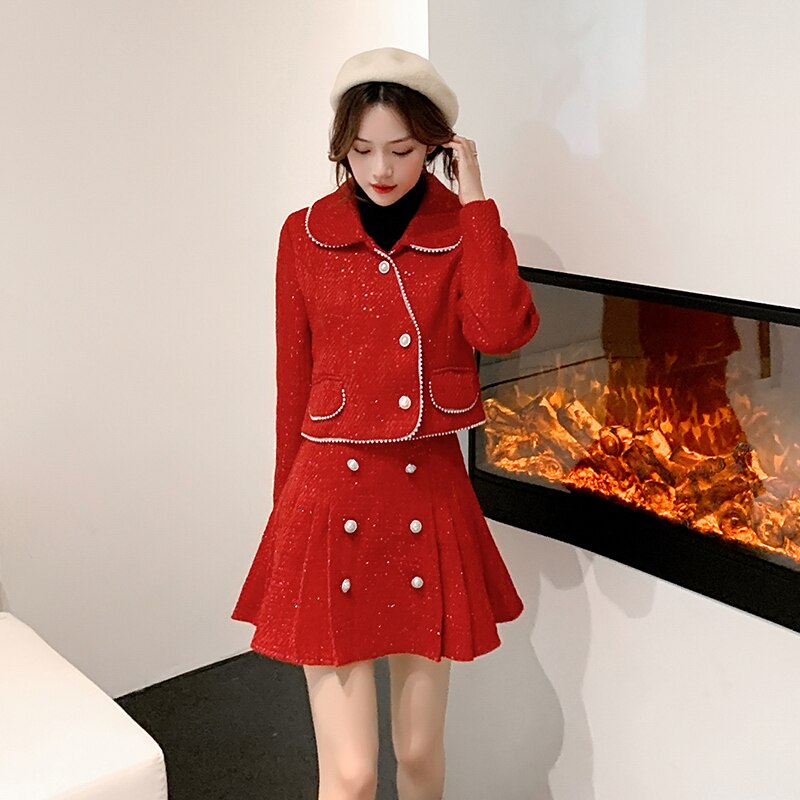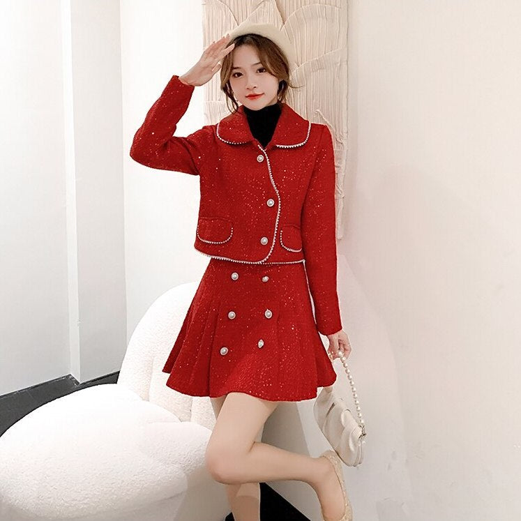 Sparkly sequin-filled tweed cropped jacket and pleated skirt set with pearl trims and bejewelled pearl buttons. Concealed back zipper. Skirt is lined with safety shorts.