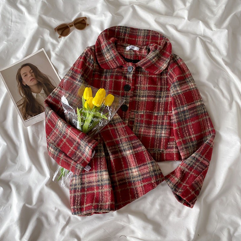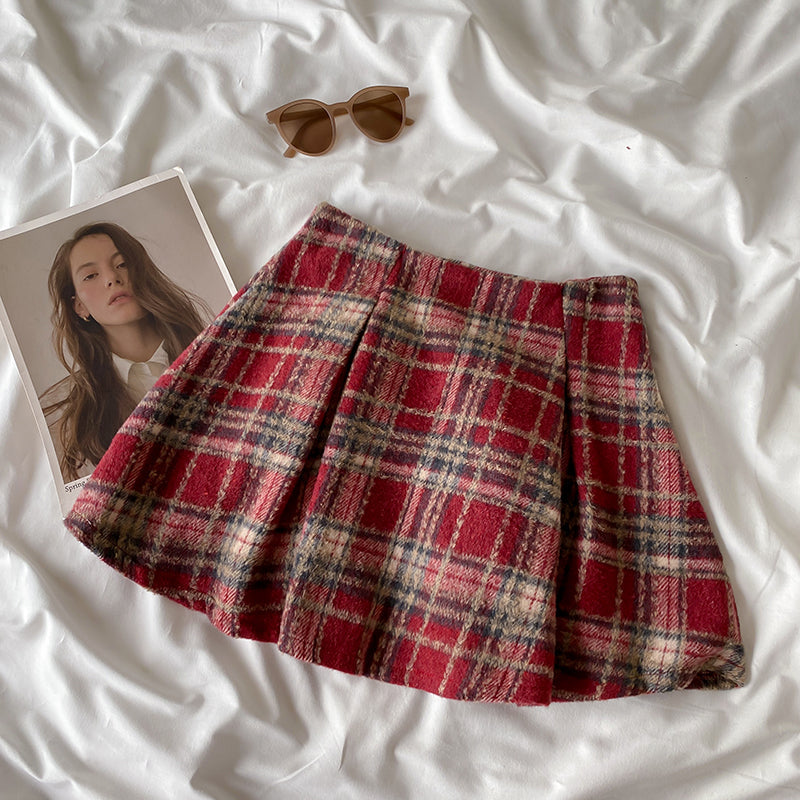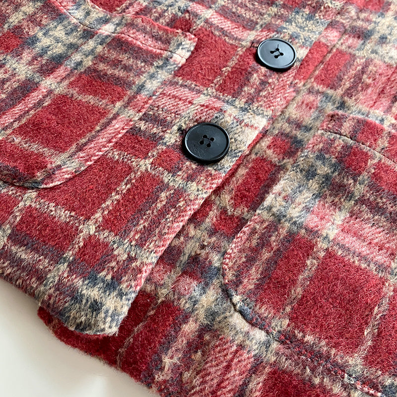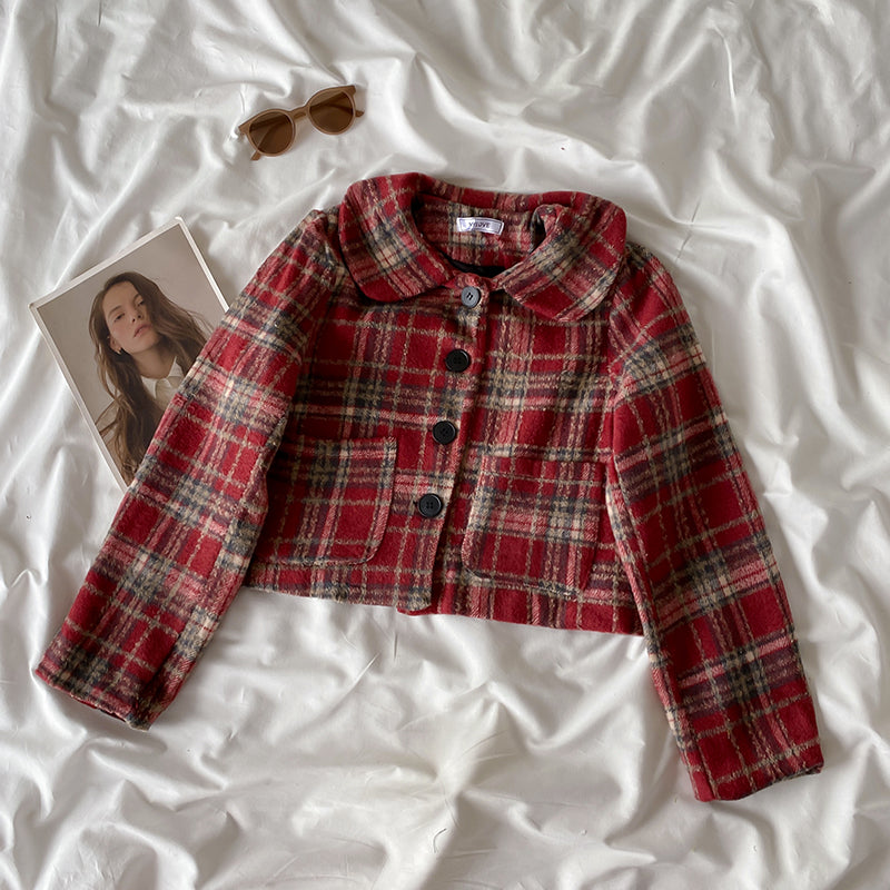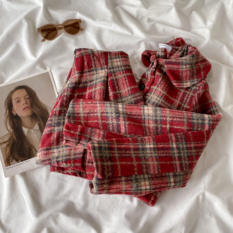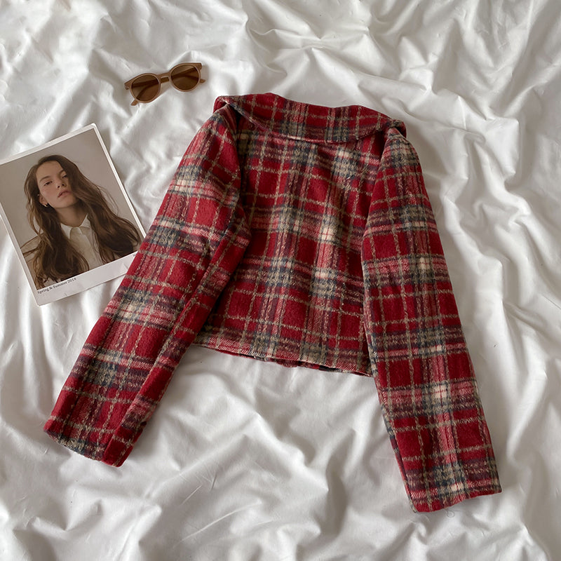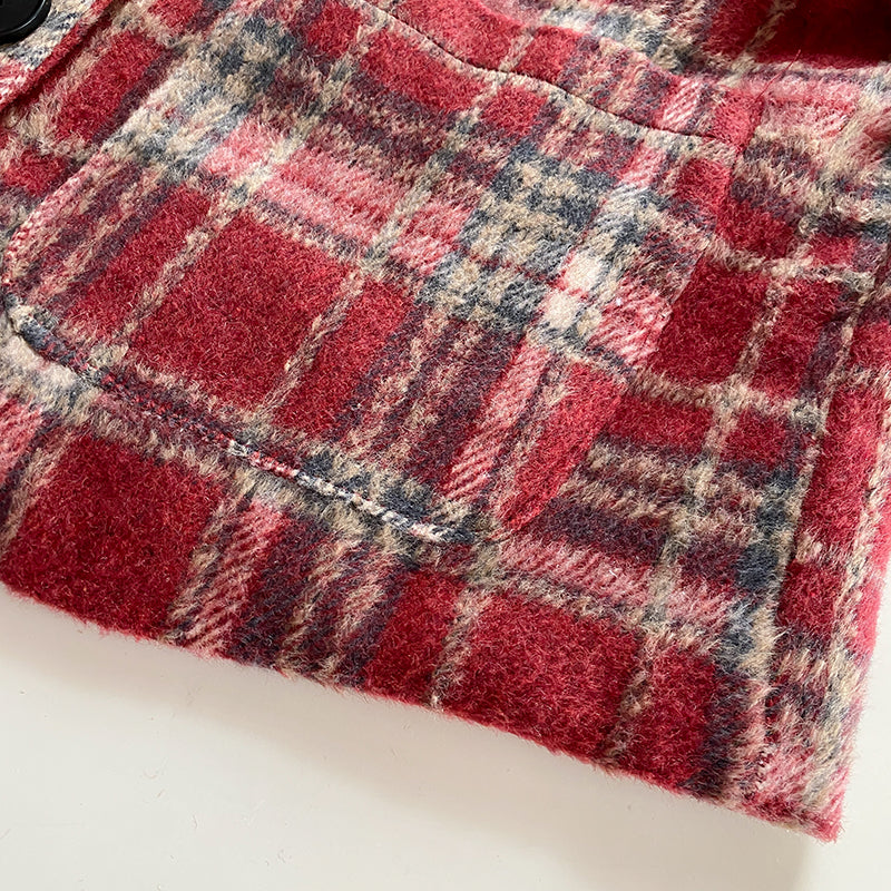 Fuzzy tweed聽knit plaid cropped jacket with a rounded collar, button up front and side pockets. Matching mini pleated skirt with concealed back zipper. Lined. Sold together as a set.