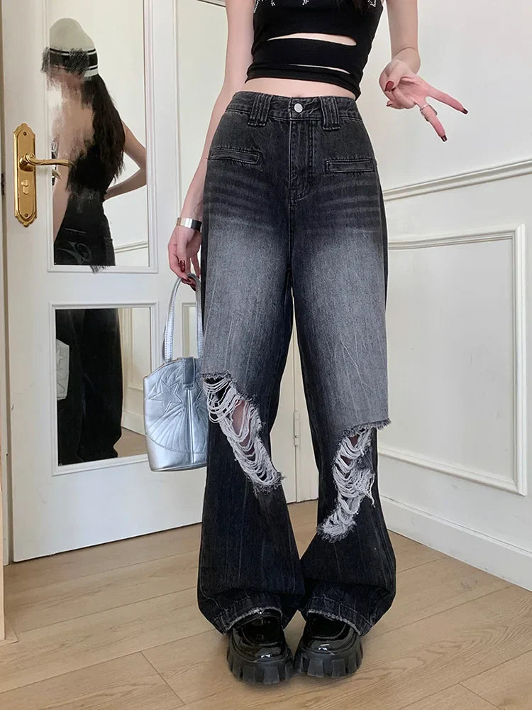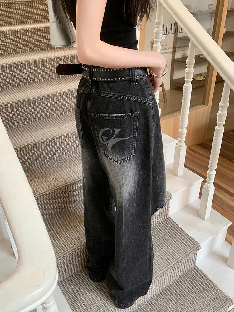 Punk Industry Washed Ripped Women Street Hip Hop Y2k Vintage Straight Without Belt Jeans