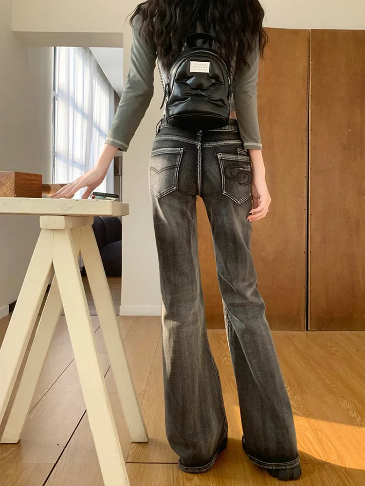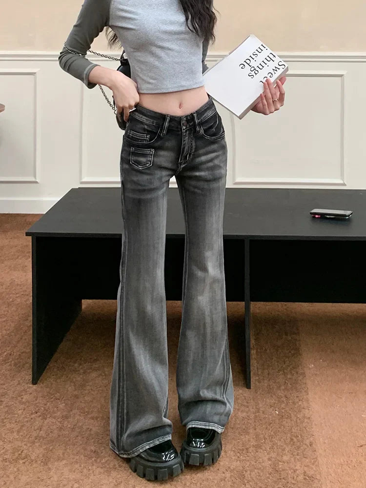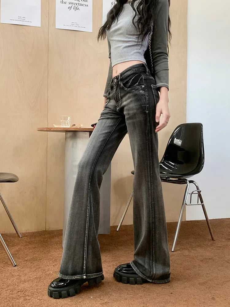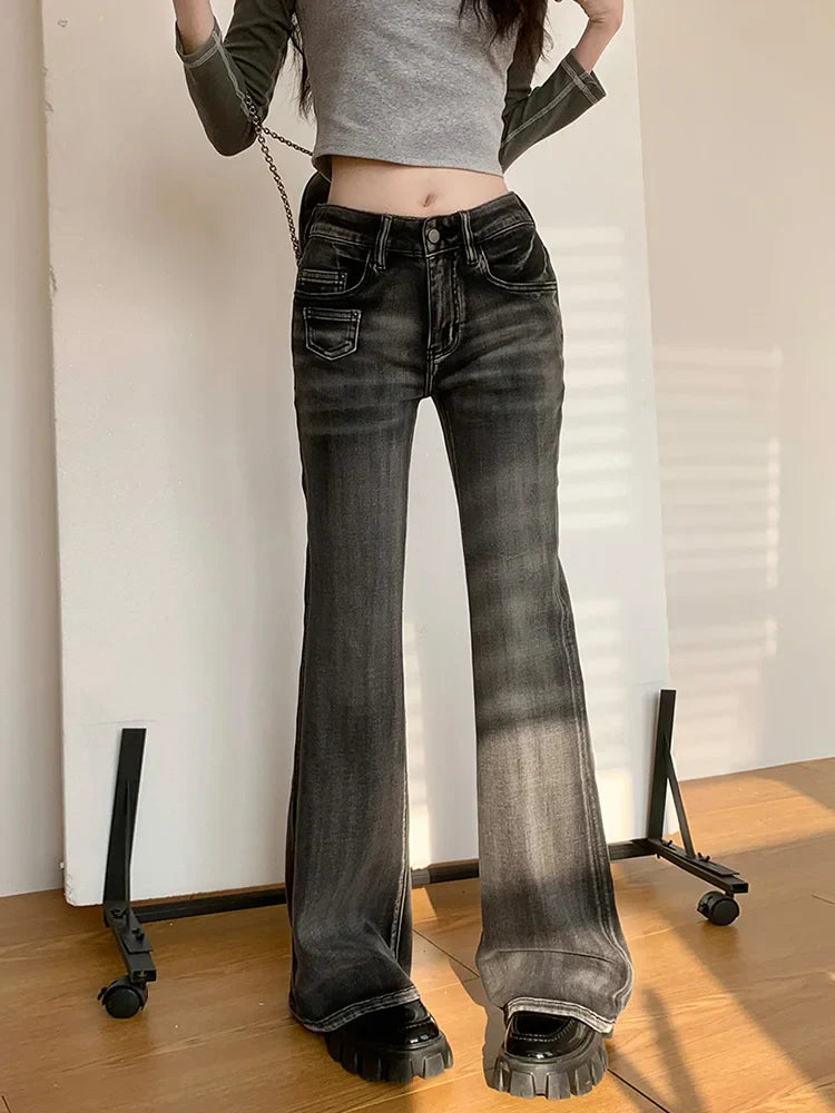 Retro Flare Women Y2k Streetwear Casual Fashion Washed Black 2025 New Jeans
