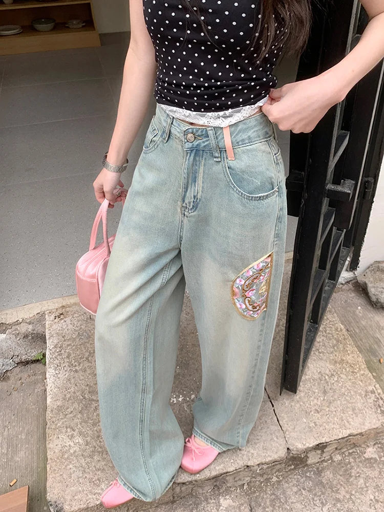 Embroidery Women's 2025 Spring Summer High Waist Loose Vintage Straight Jeans