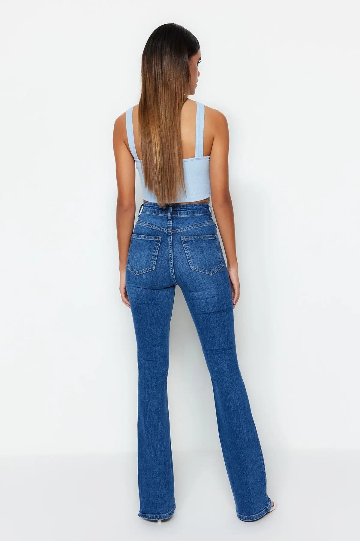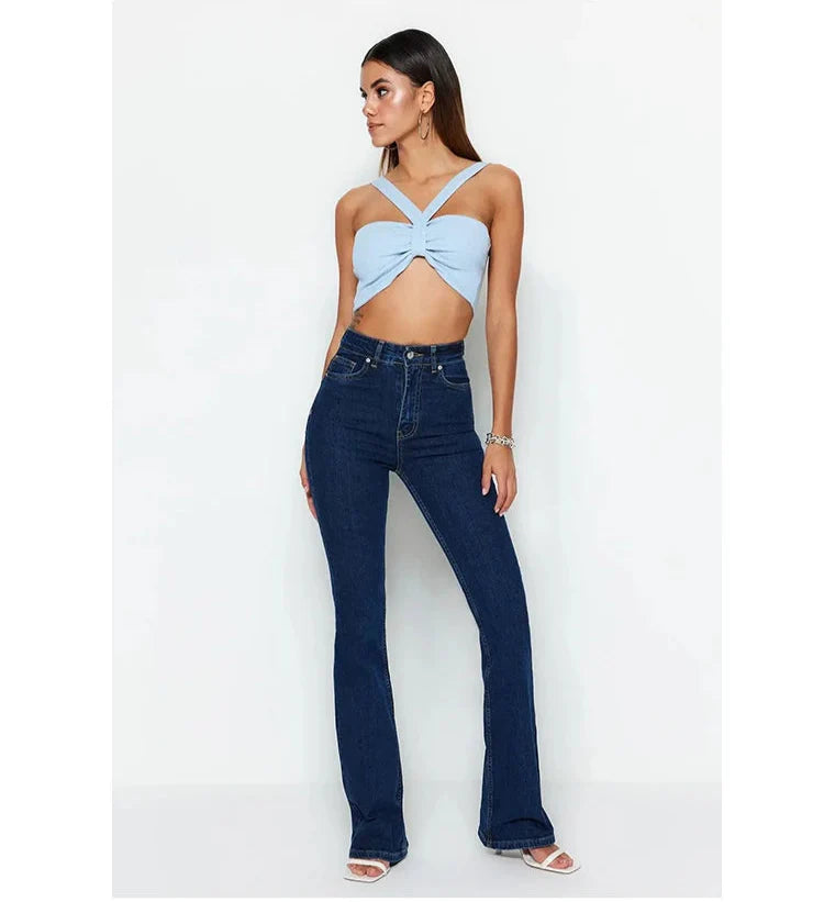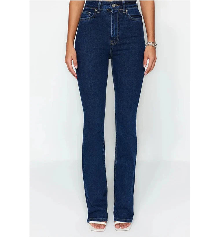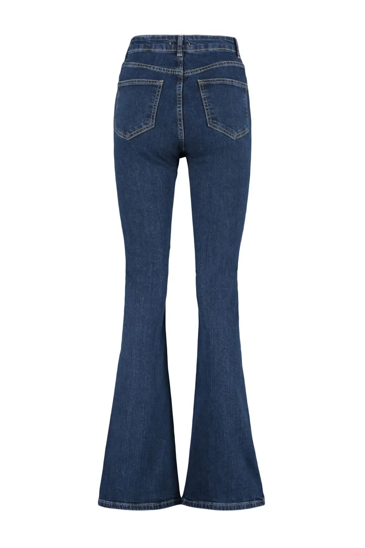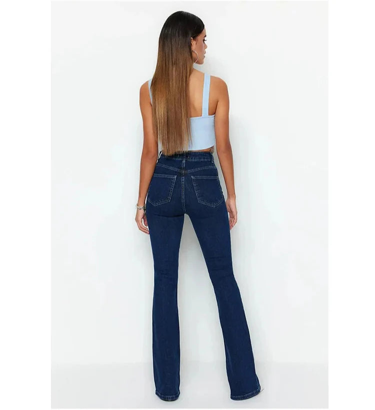 Ce jean combine confort et légère élasticité pour une coupe skinny flatteuse. La taille haute et la coupe évasée ajoutent une touche de style tout en offrant un maintien optimal, idéal pour toutes les saisons.