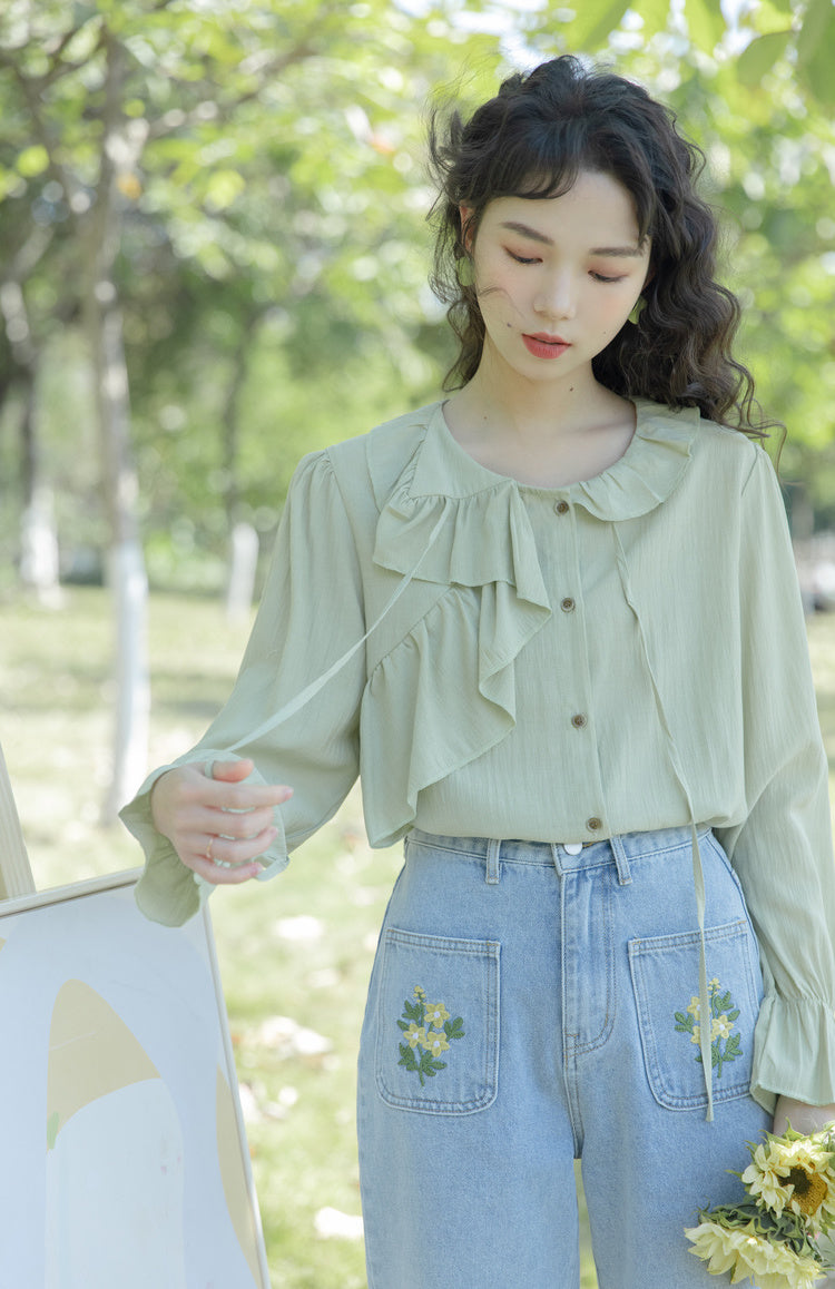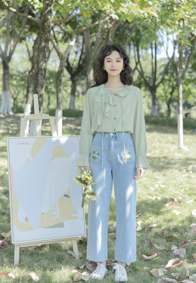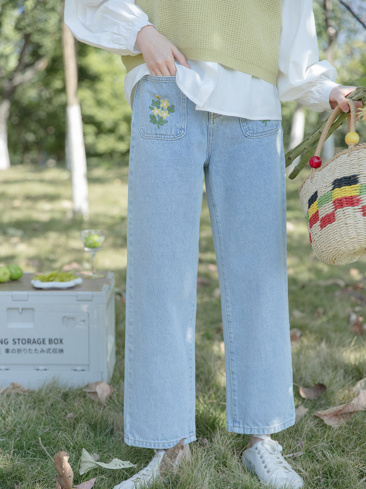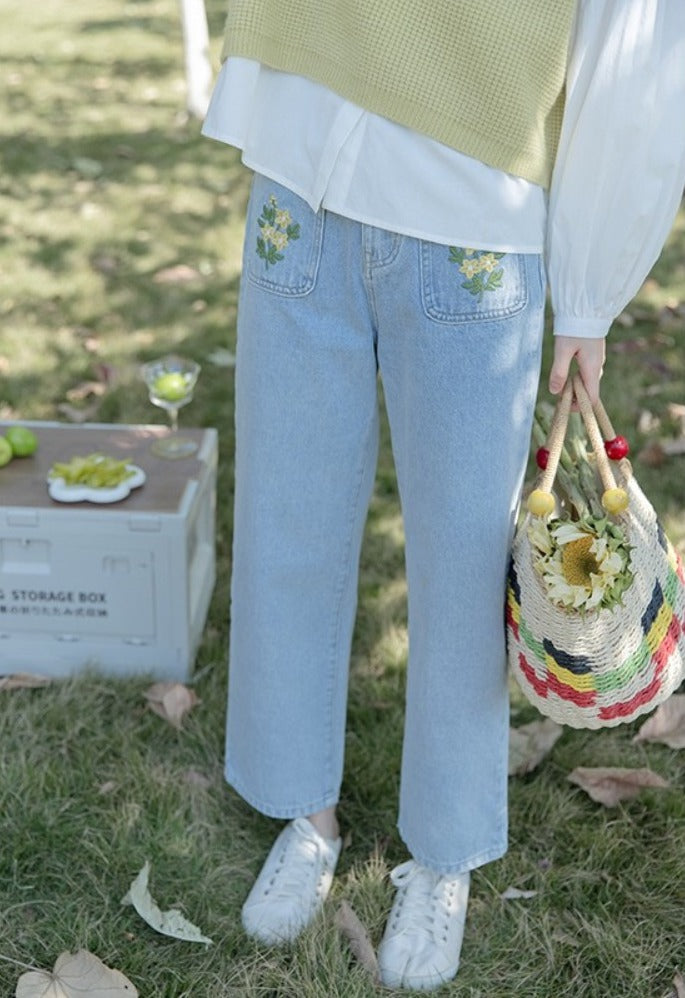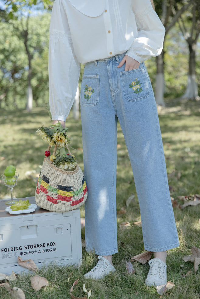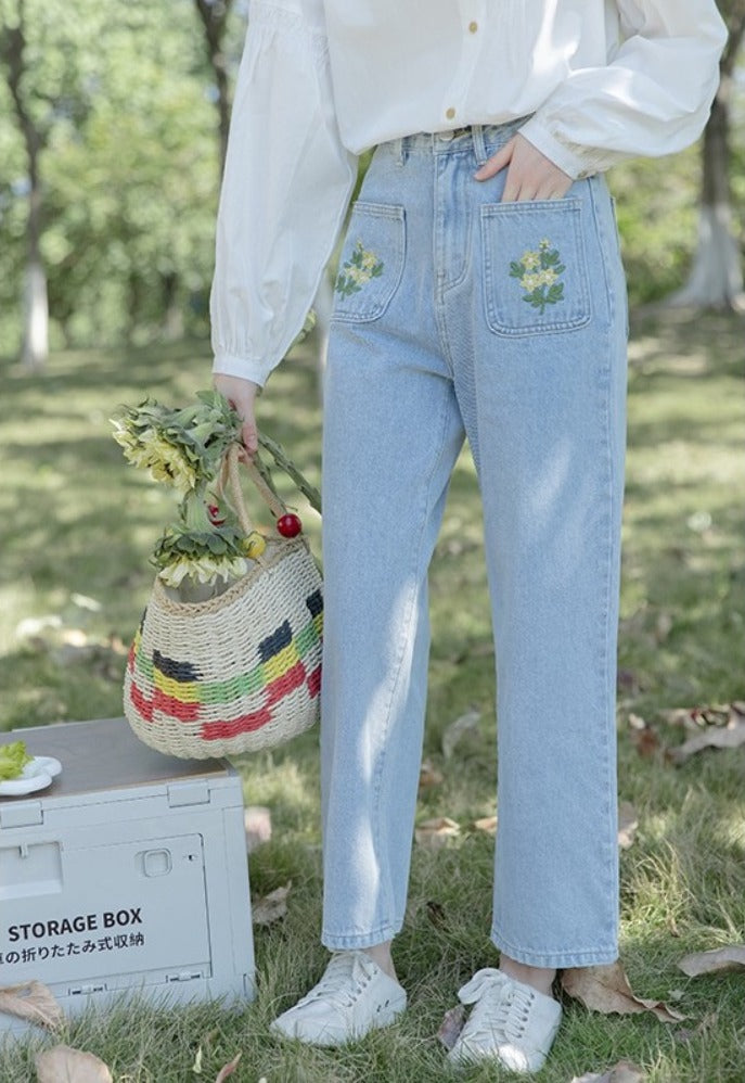 Vintage inspired denim jeans with pockets on the front, cute floral embroidery, high waisted fit and relaxed straight legs. Button and zip up closure with belt loops and back pockets.