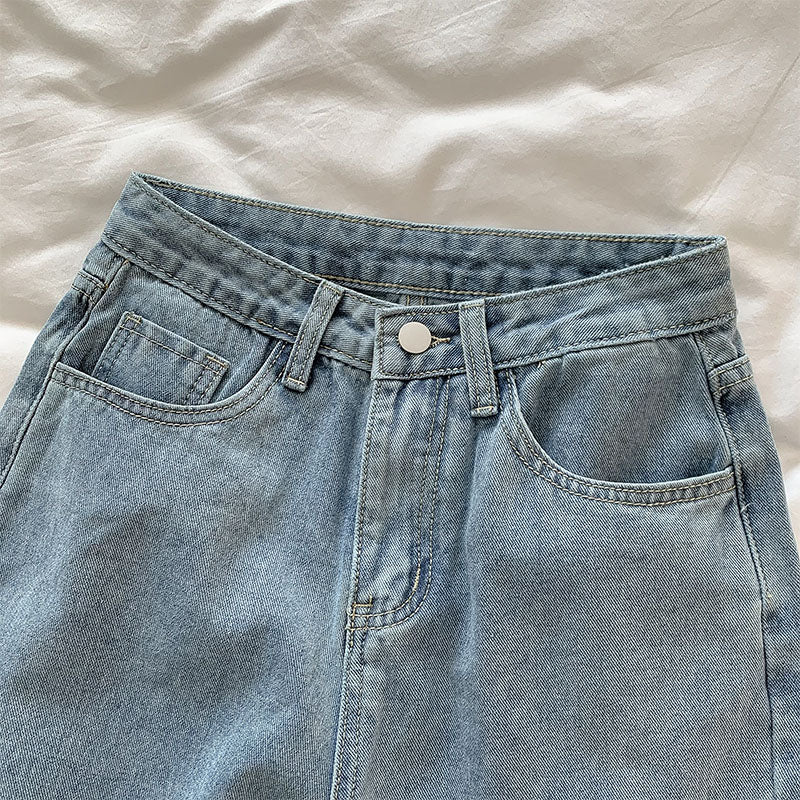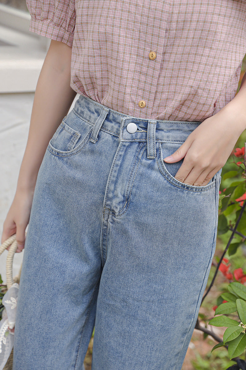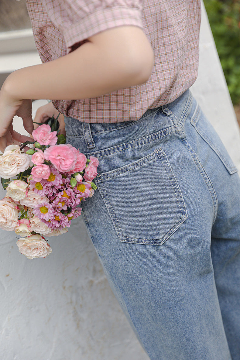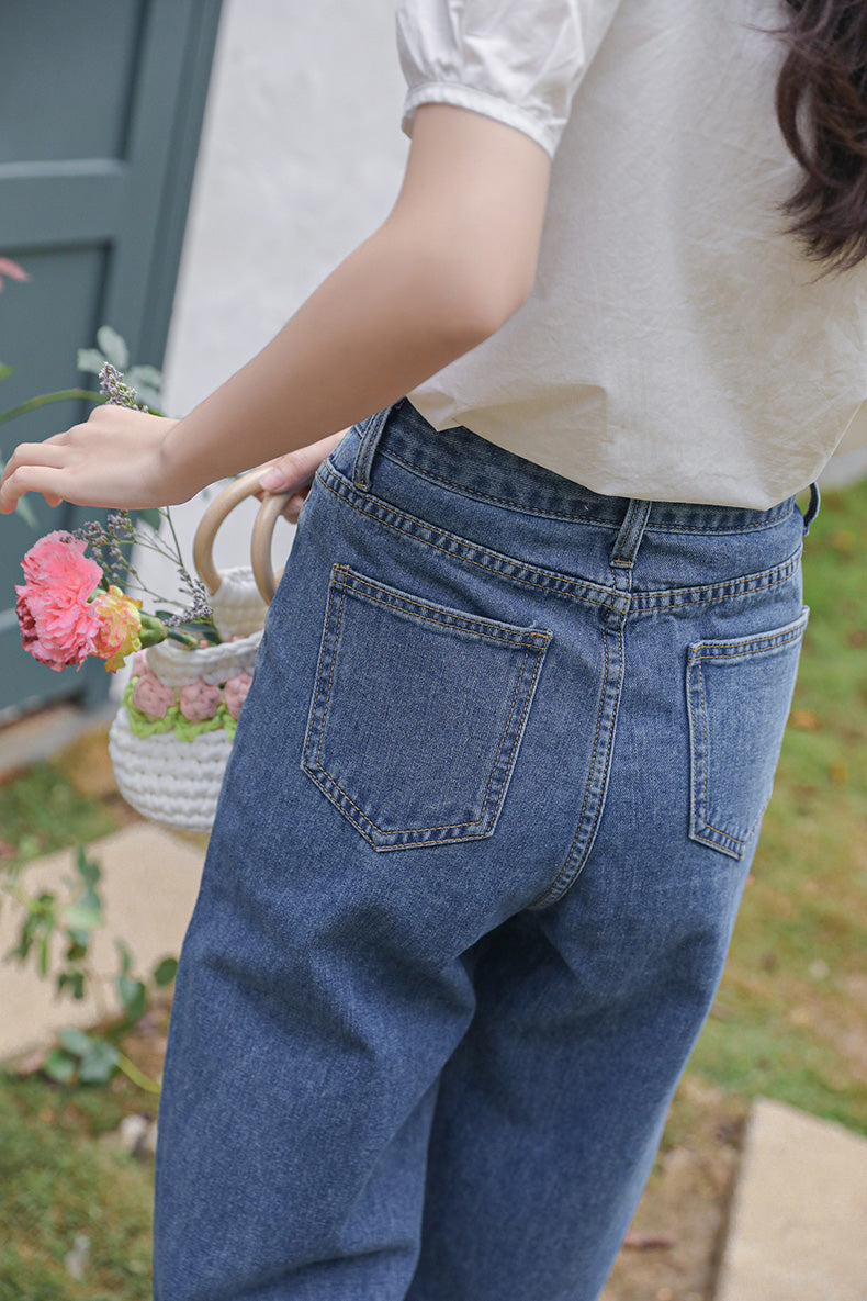 Vintage inspired denim mom jeans with cute floral embroidery at the ankles, high waisted fit and tapered legs. Button and zip up closure with belt loops and back pockets.