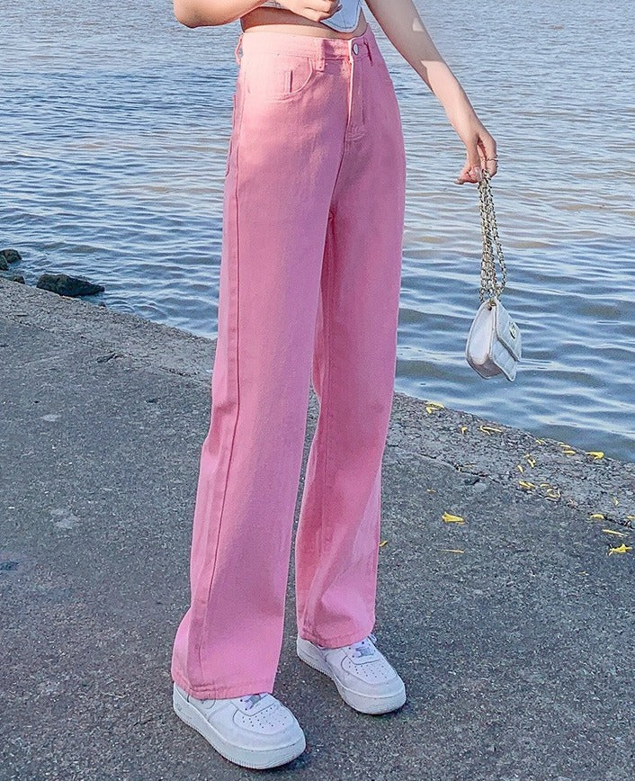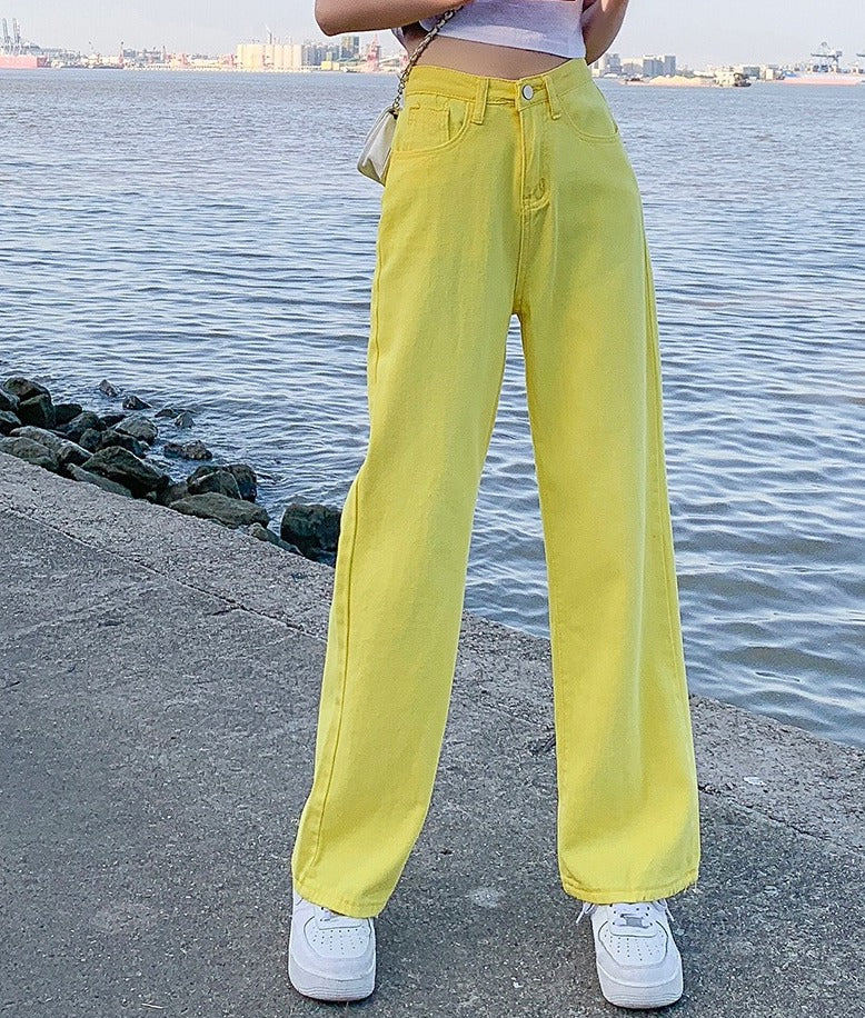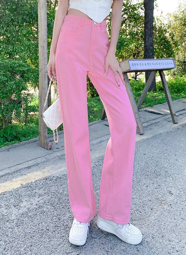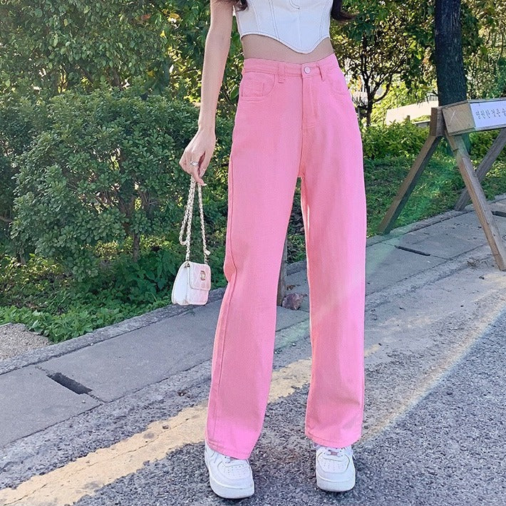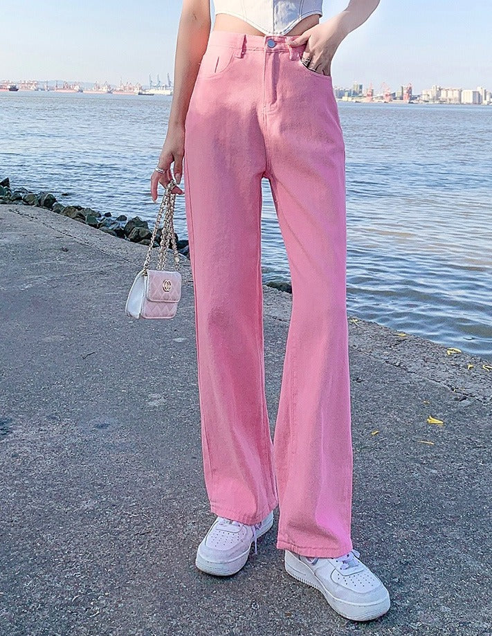 Classic high waist and straight leg jeans in yummy ice cream colors. Features a button and zip up front, belt loops, side pockets and back pockets.