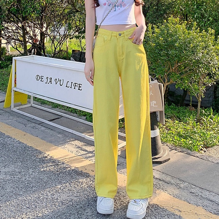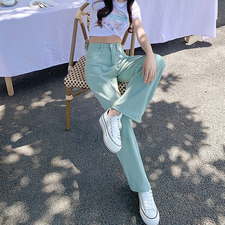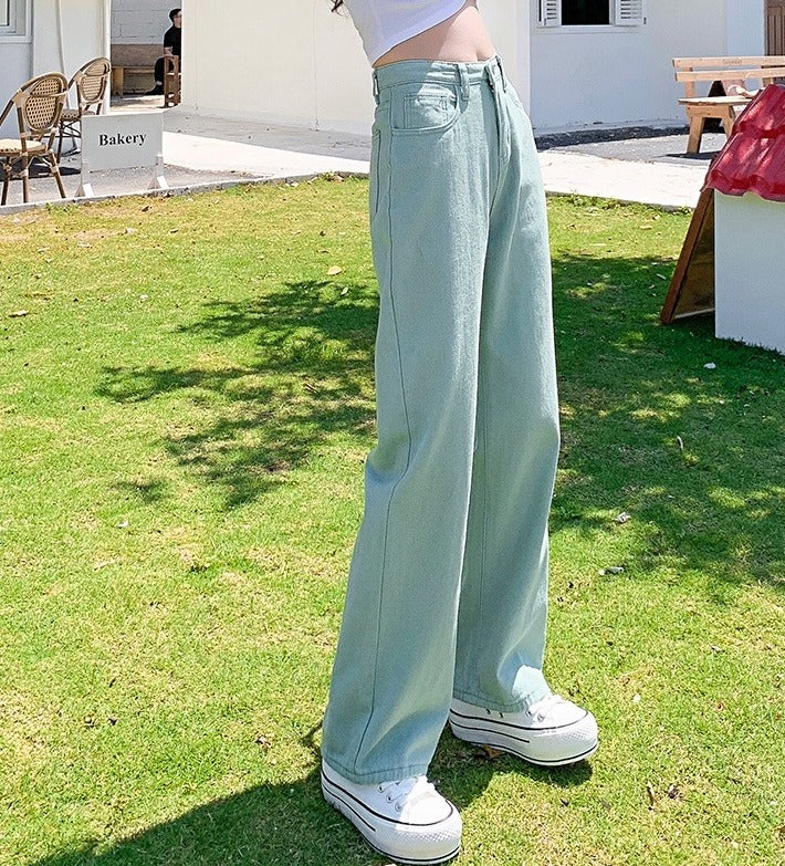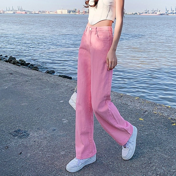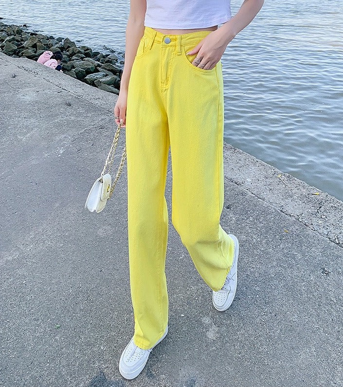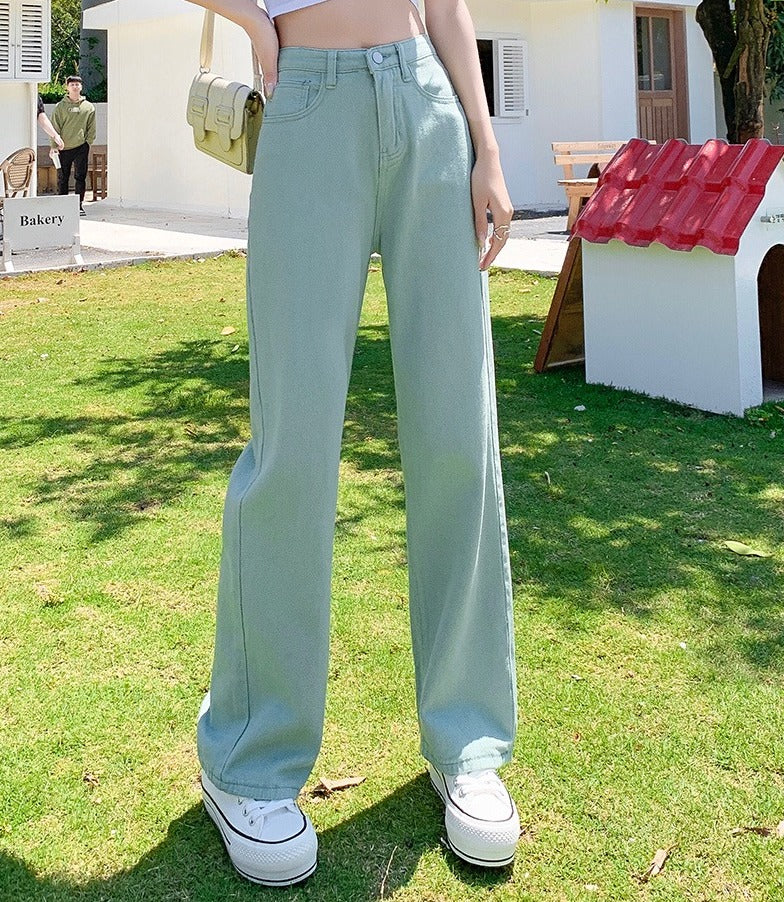 Classic high waist and straight leg jeans in yummy ice cream colors. Features a button and zip up front, belt loops, side pockets and back pockets.