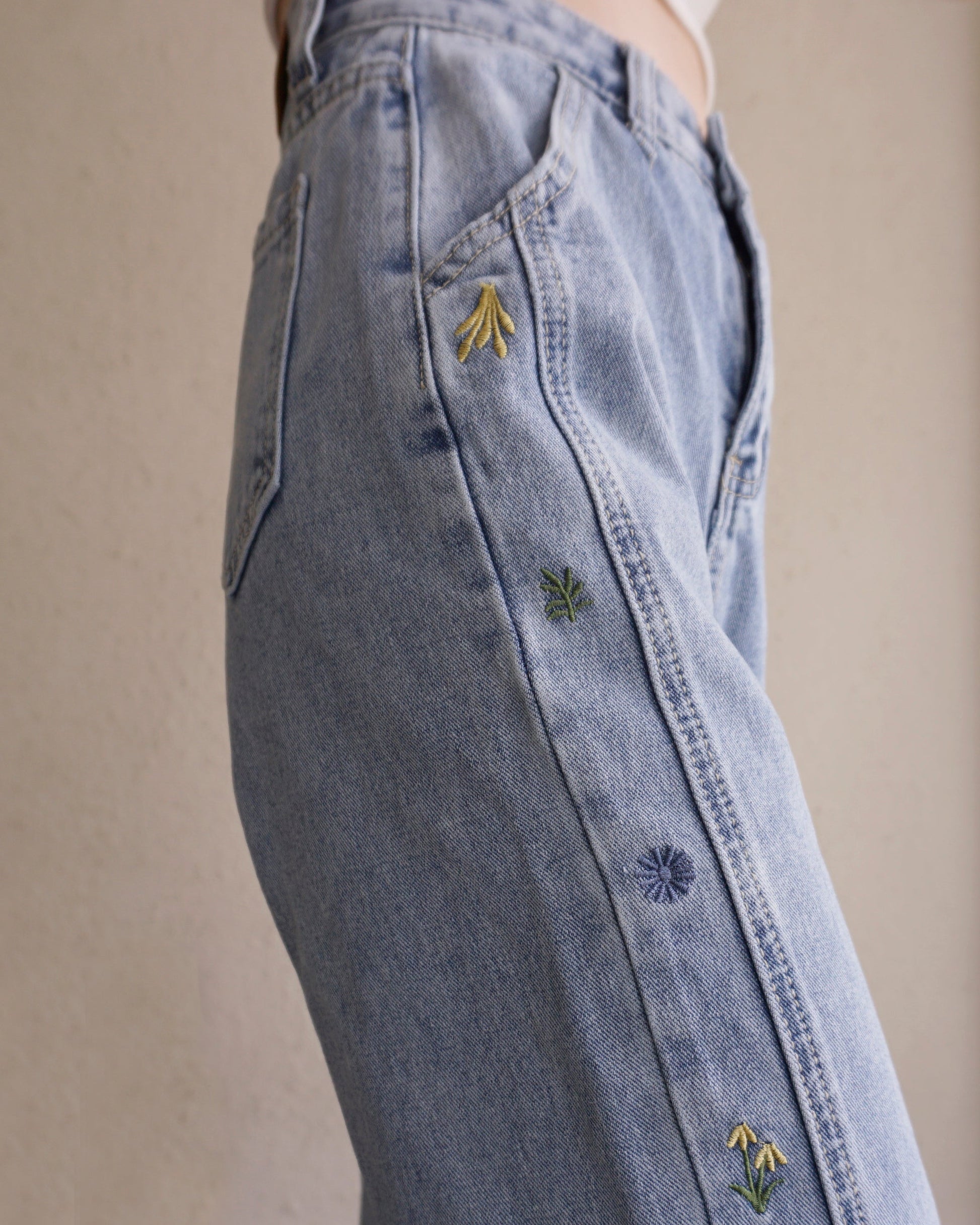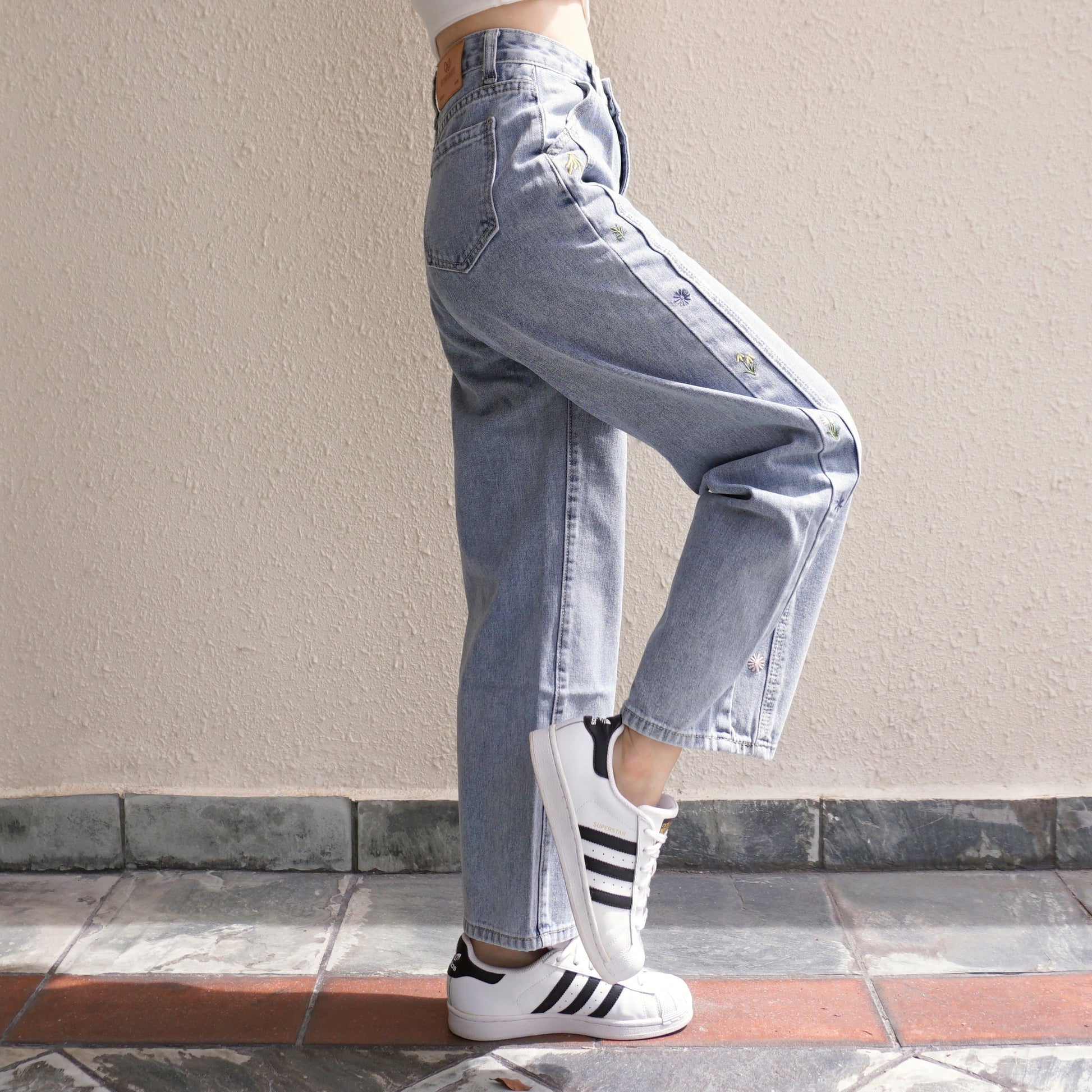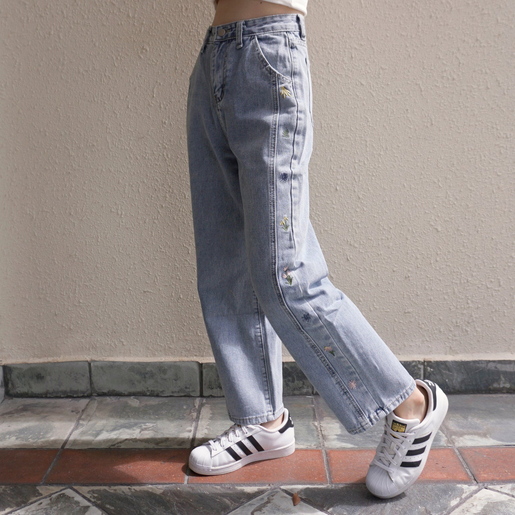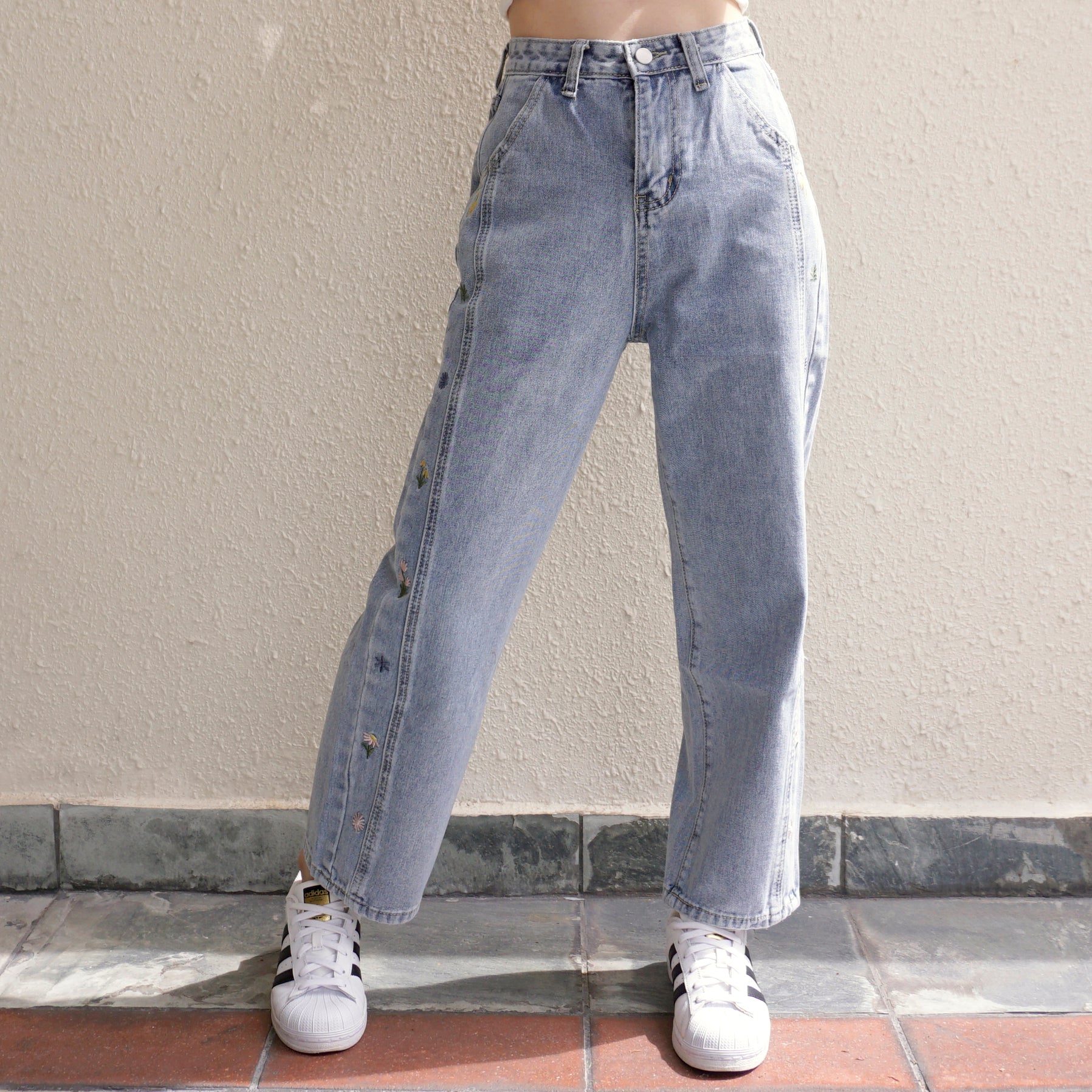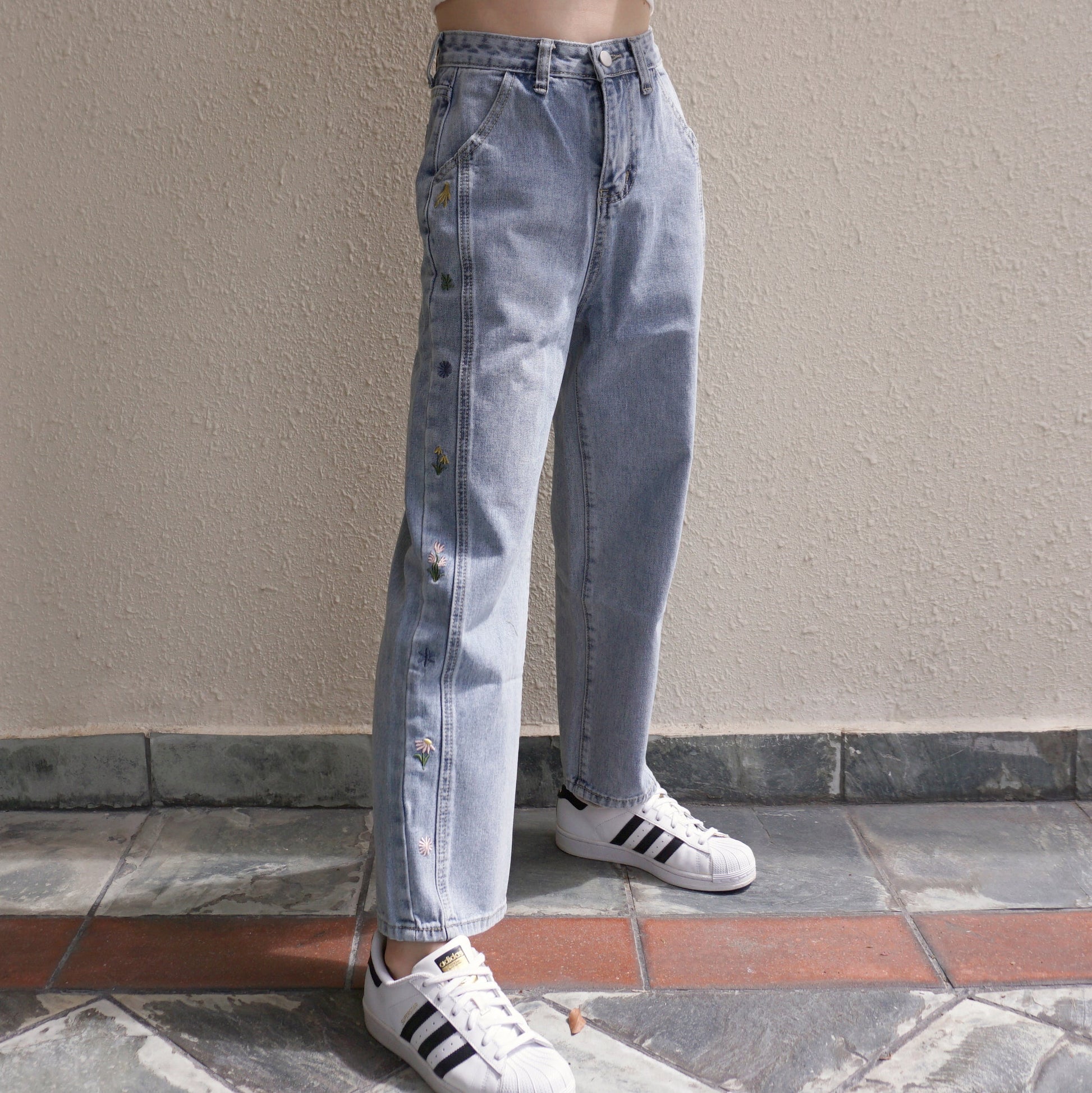 High waist denim mom jeans with embroidered flowers along the side. Button and zip up closure with belt loops, side pockets and back pockets. Cut open button hole with scissors.