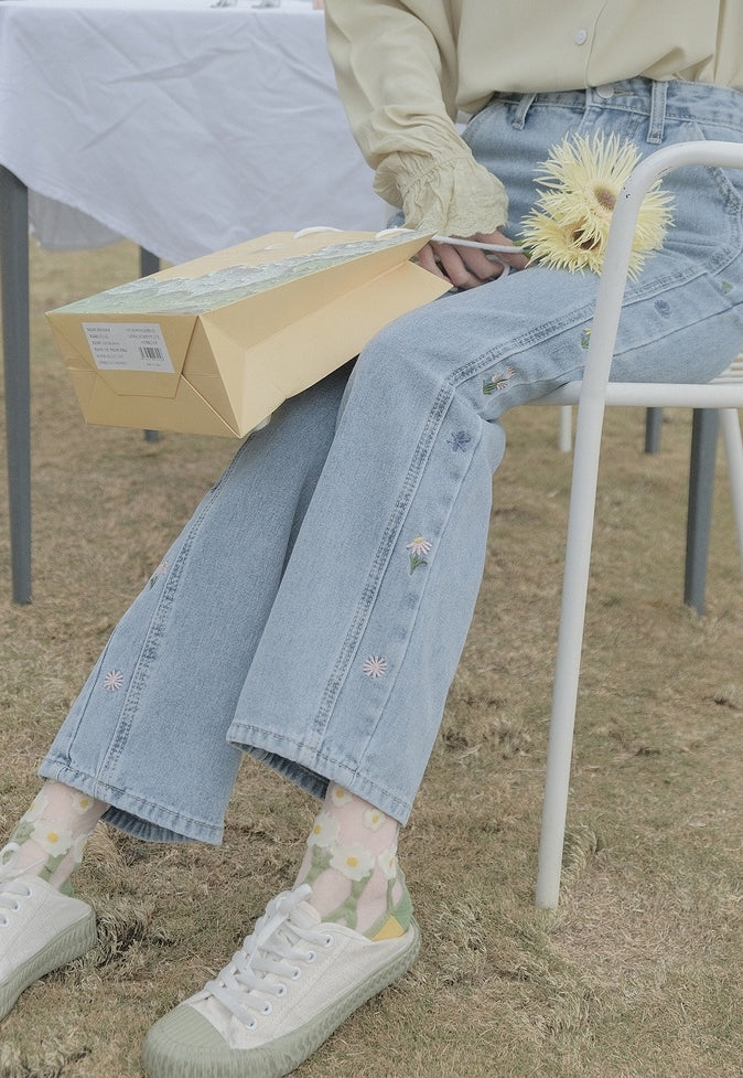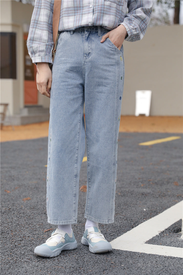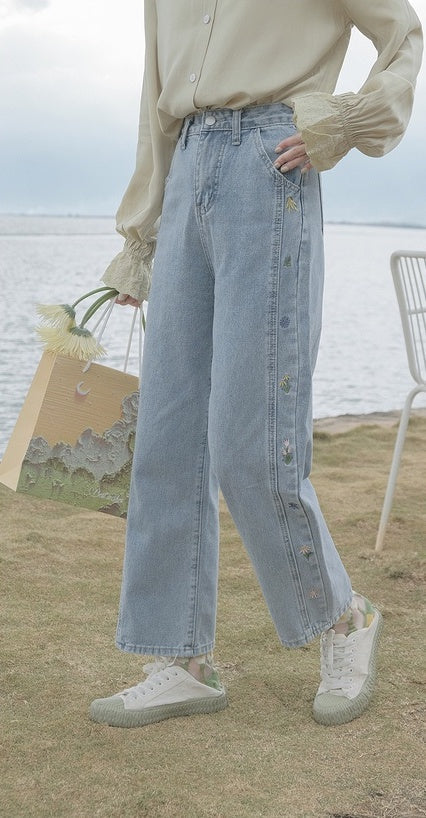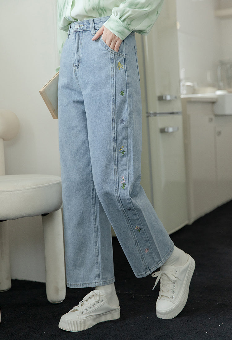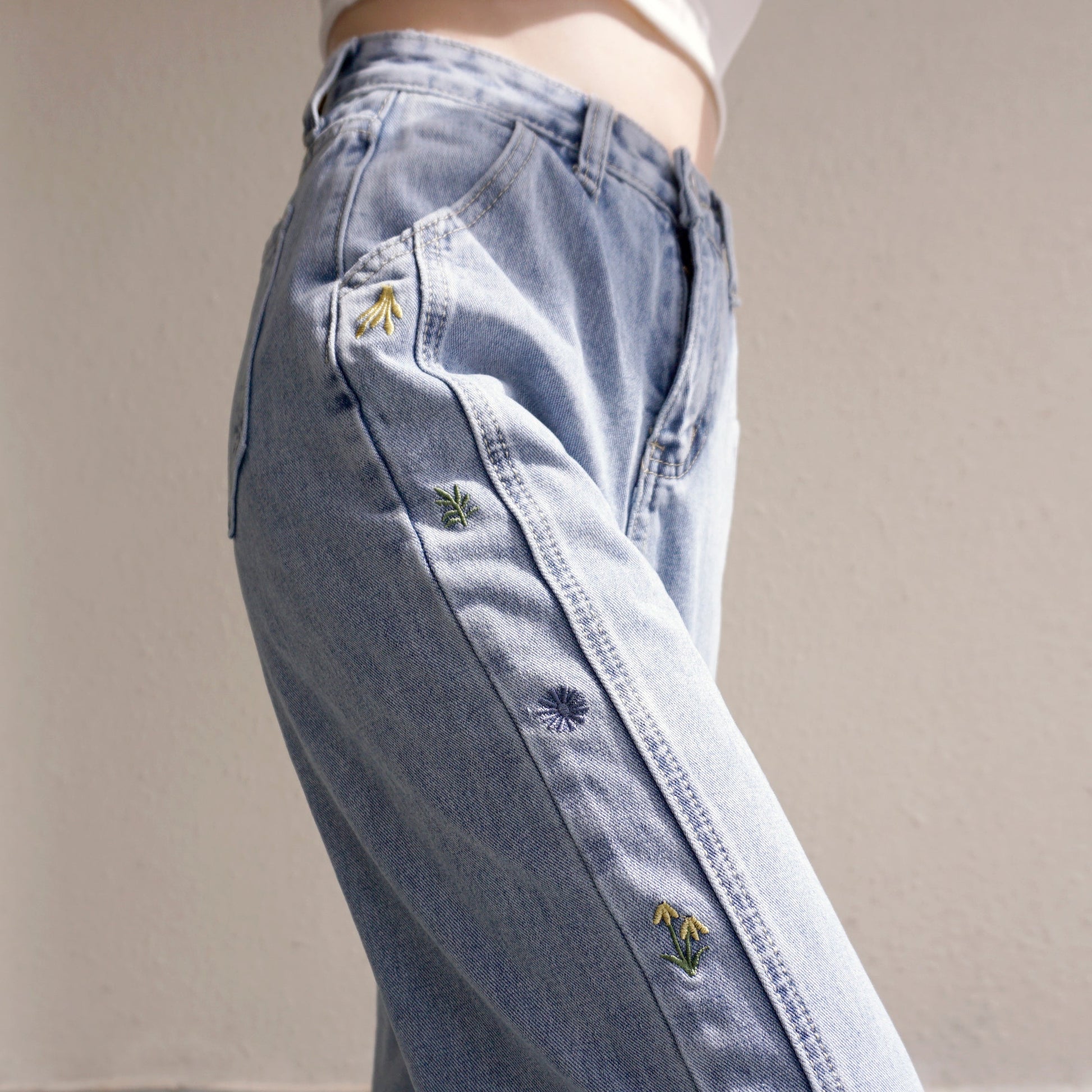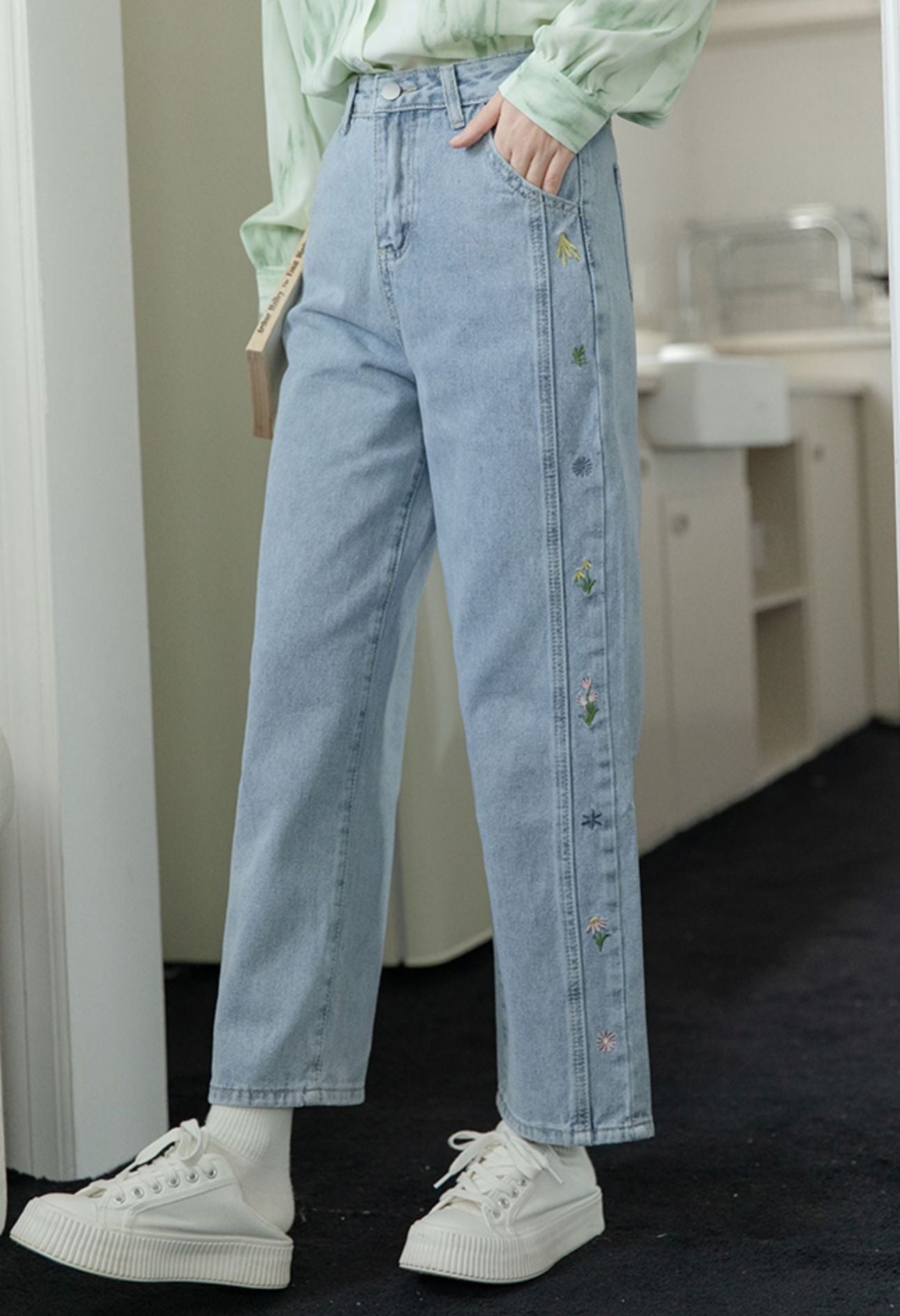 High waist denim mom jeans with embroidered flowers along the side. Button and zip up closure with belt loops, side pockets and back pockets. Cut open button hole with scissors.