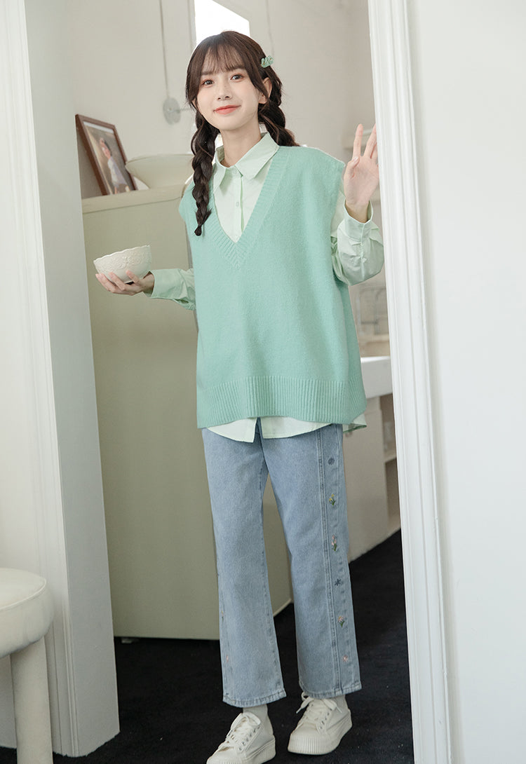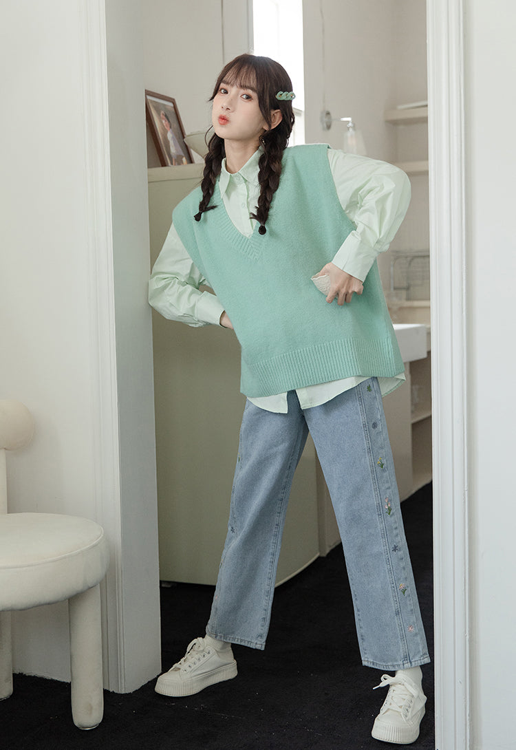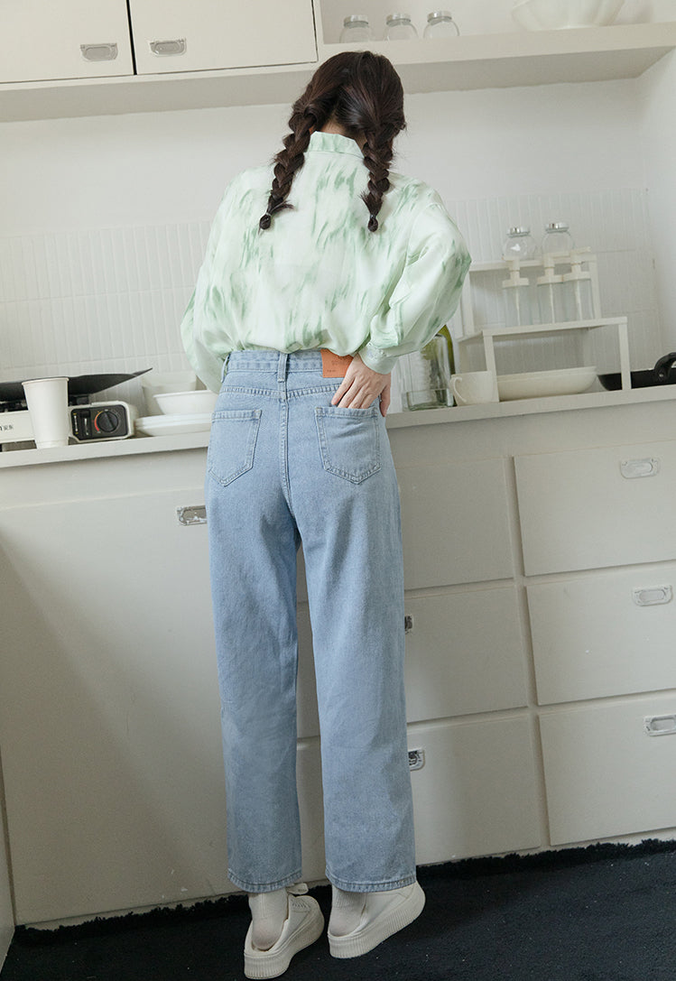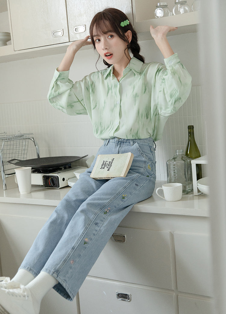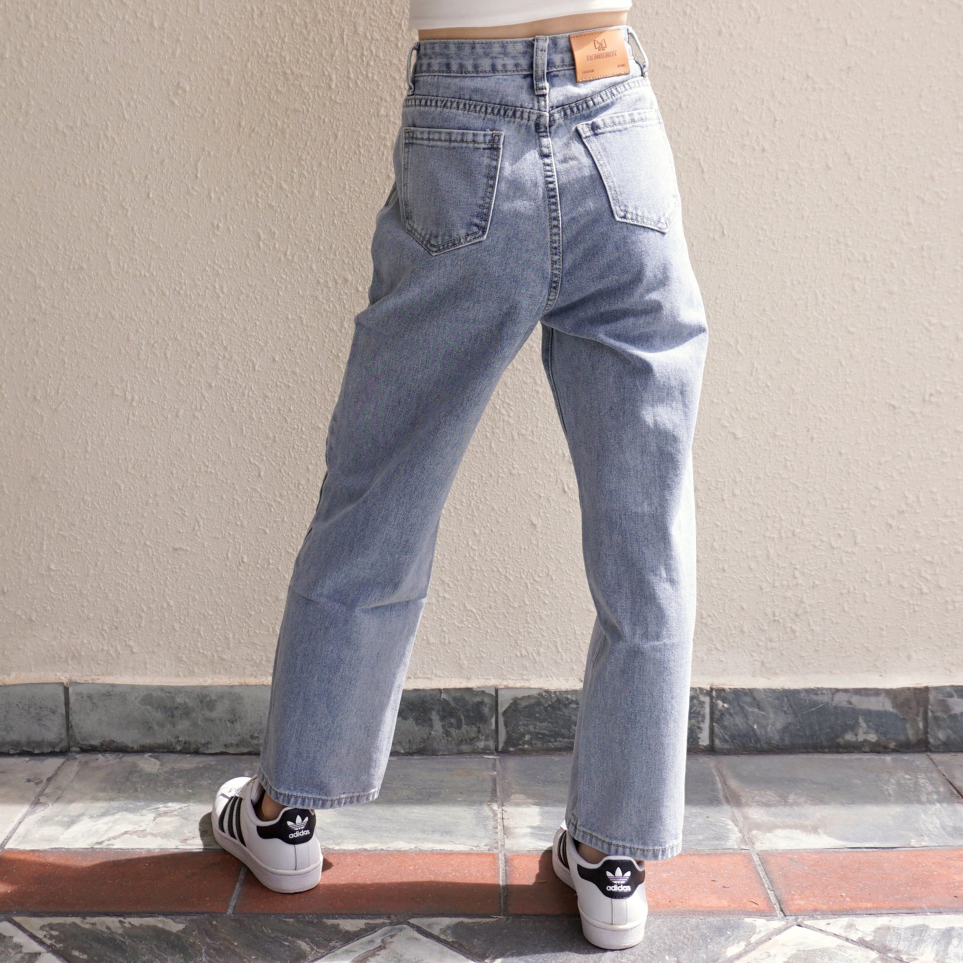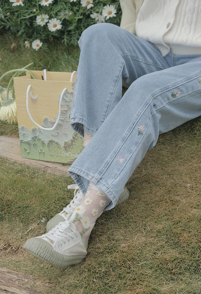 High waist denim mom jeans with embroidered flowers along the side. Button and zip up closure with belt loops, side pockets and back pockets. Cut open button hole with scissors.