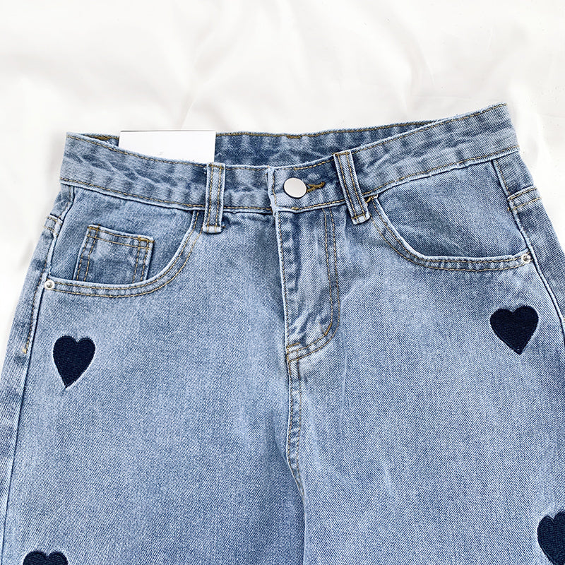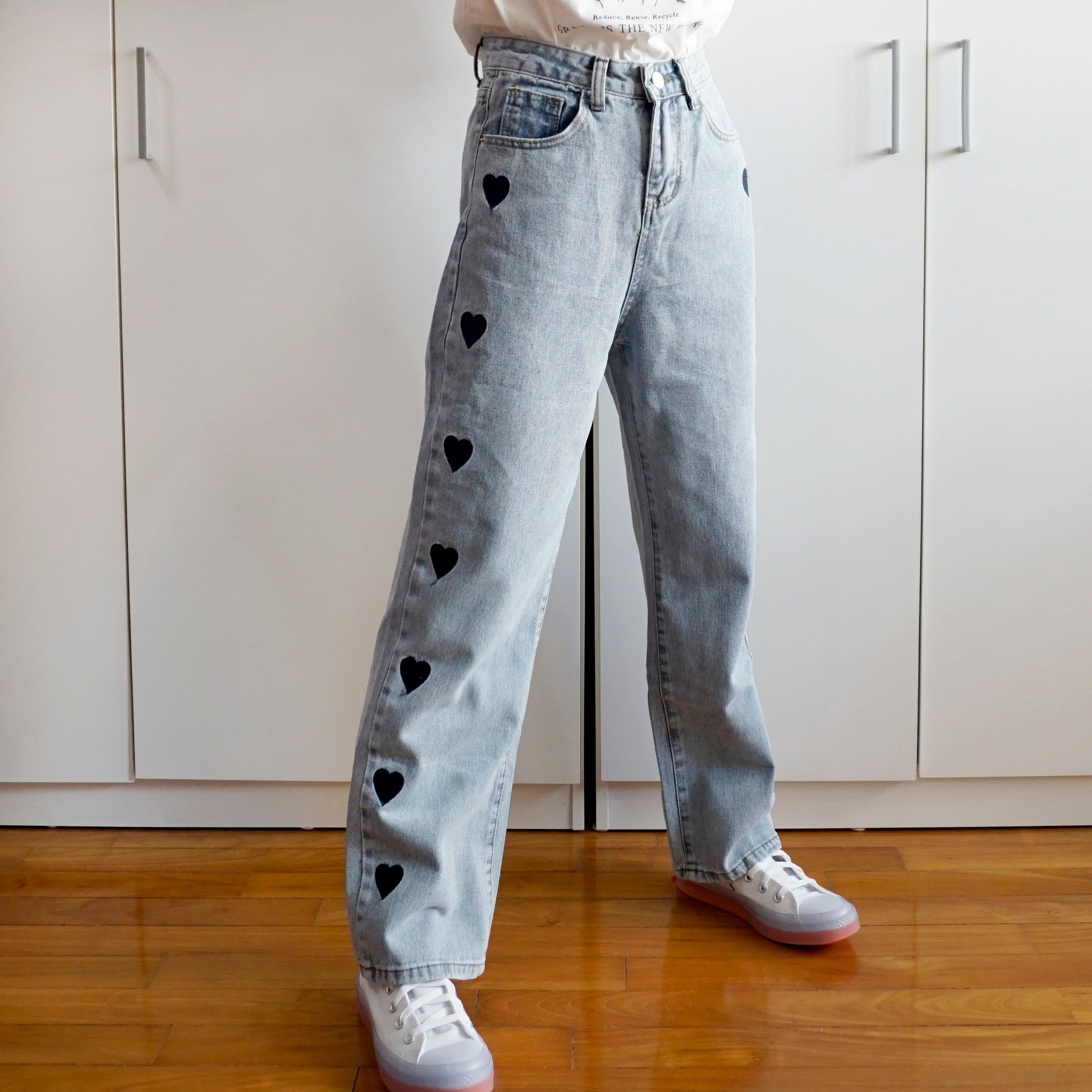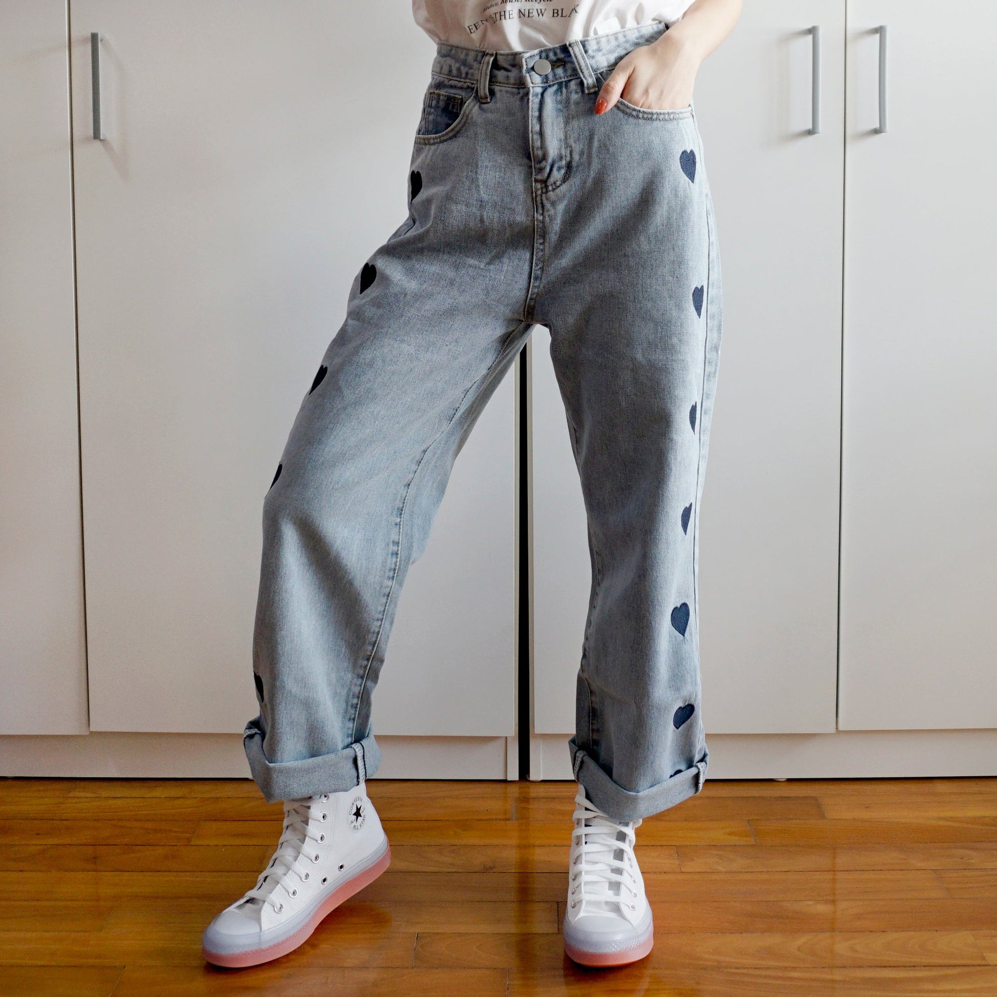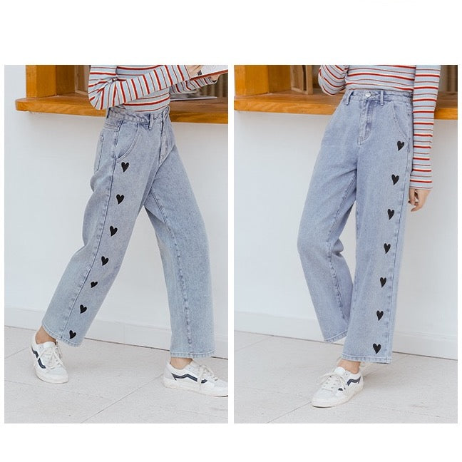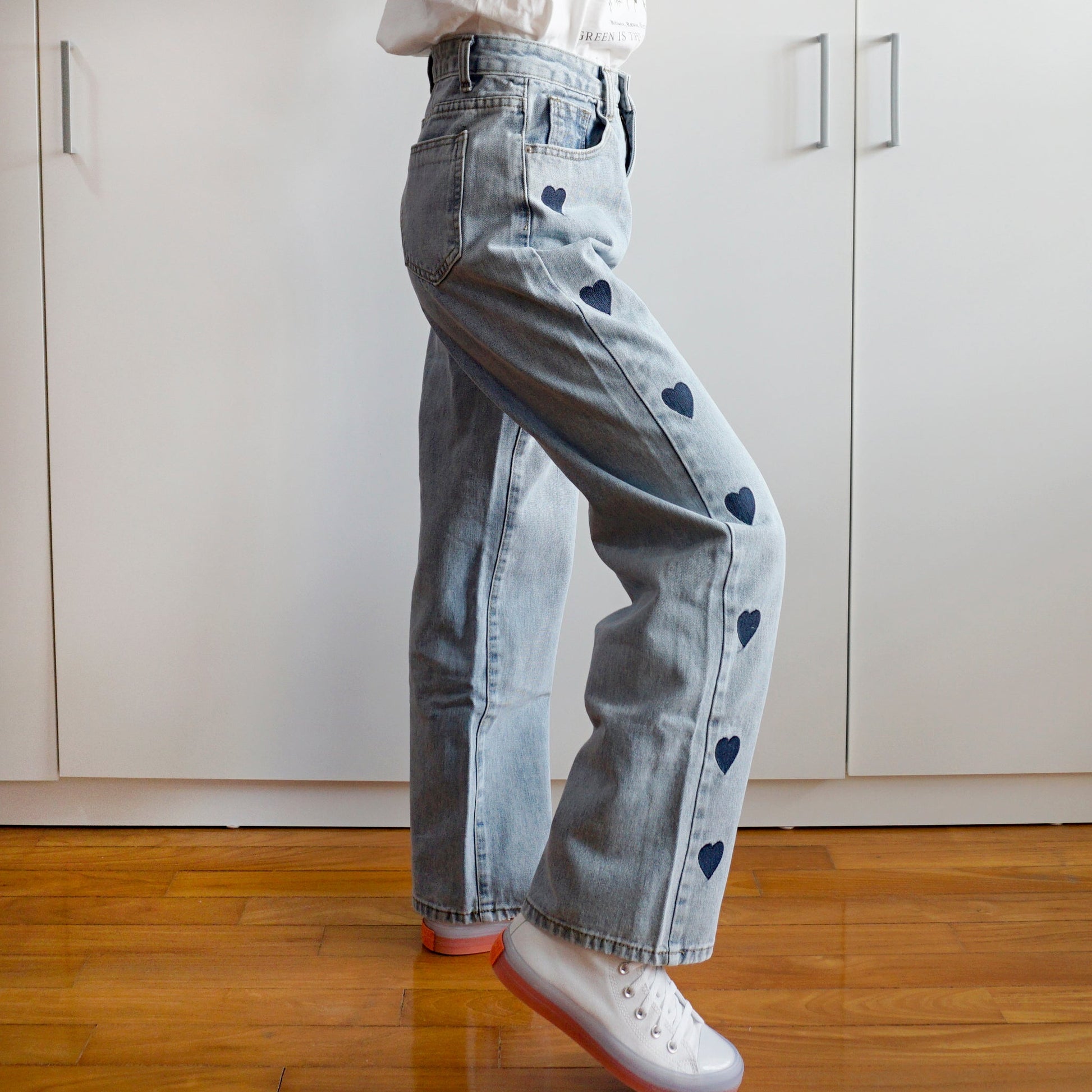 High waist straight leg denim jeans with embroidered hearts running down the sides.