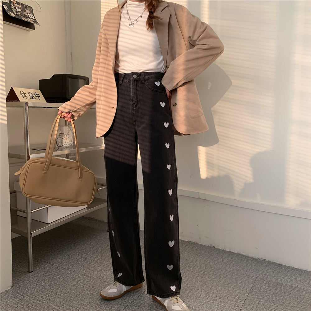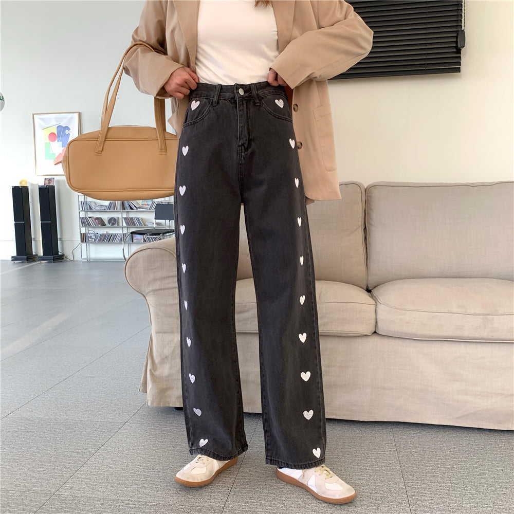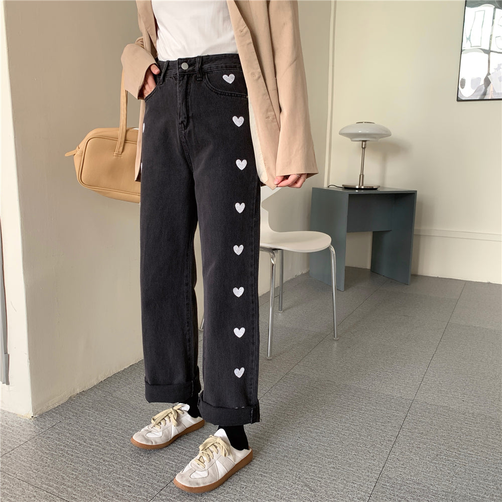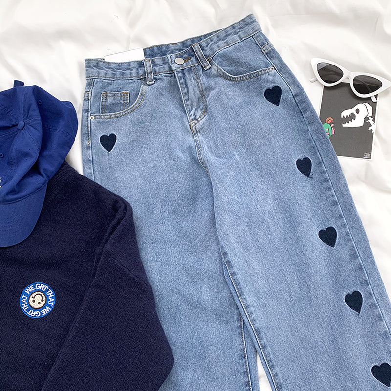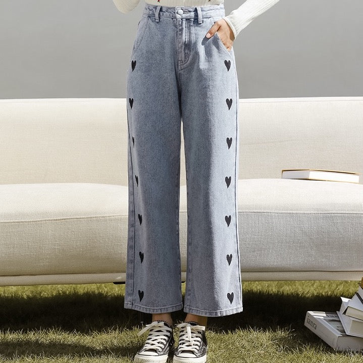 High waist straight leg denim jeans with embroidered hearts running down the sides.
