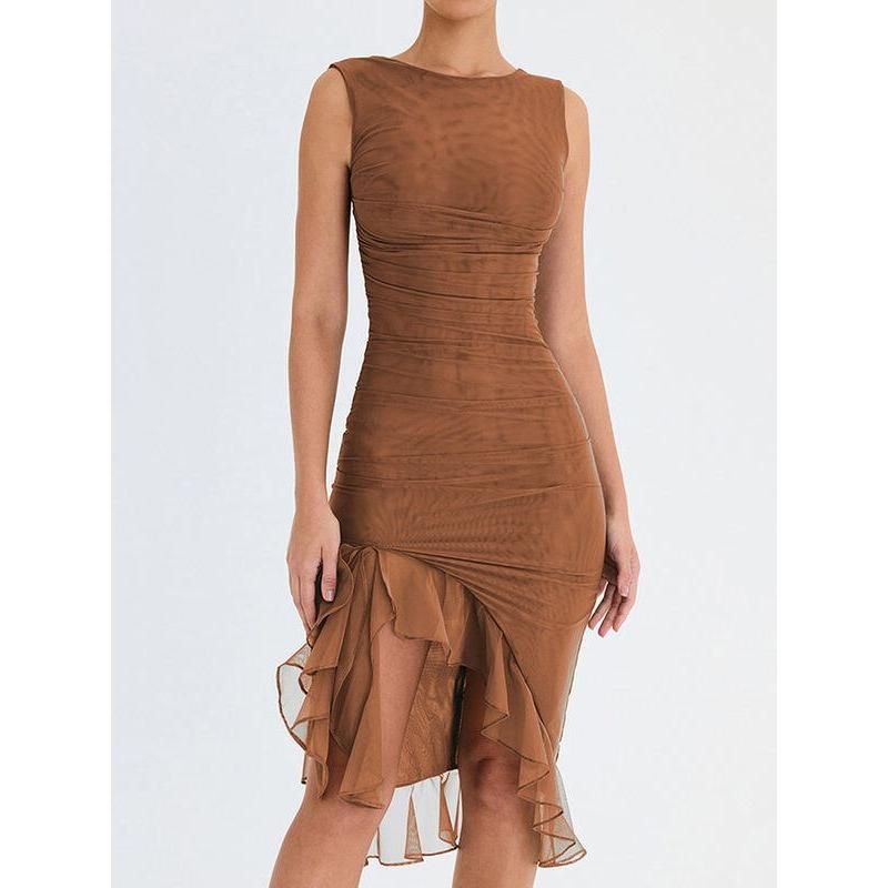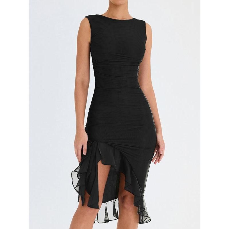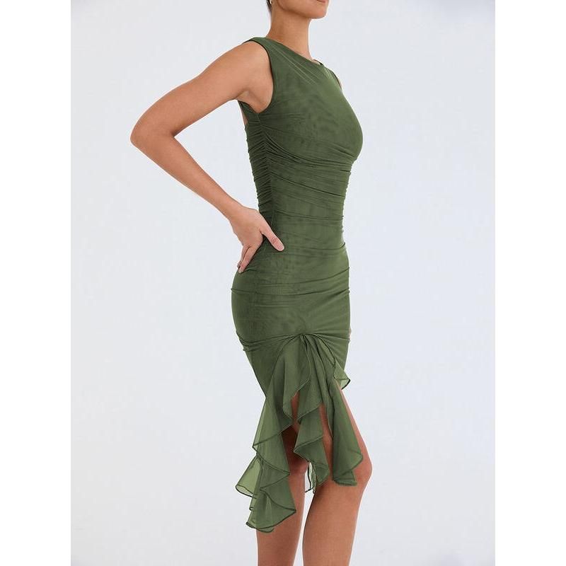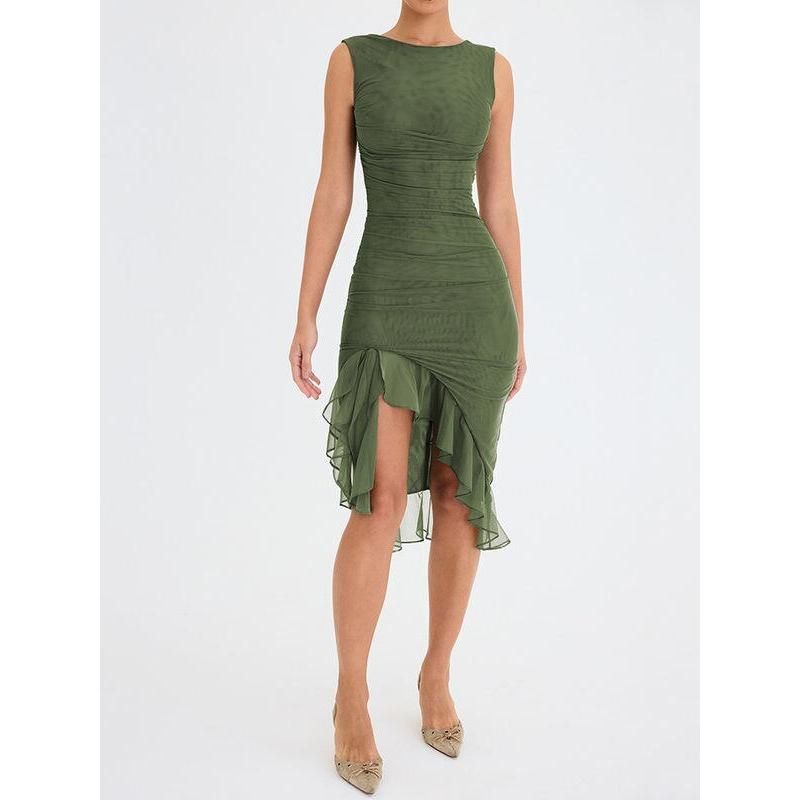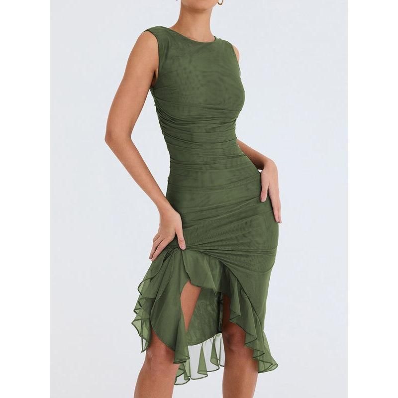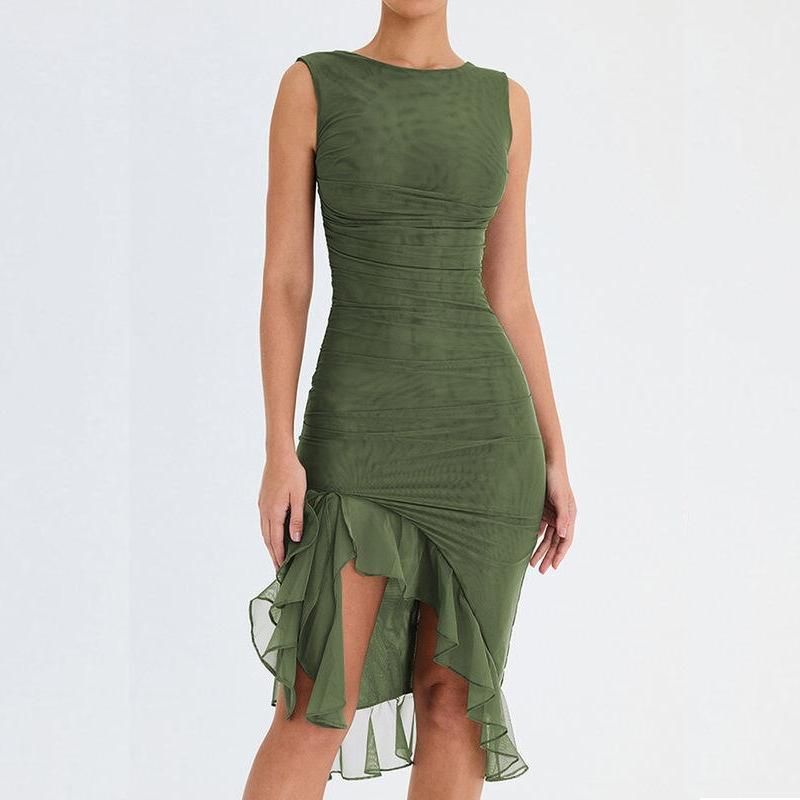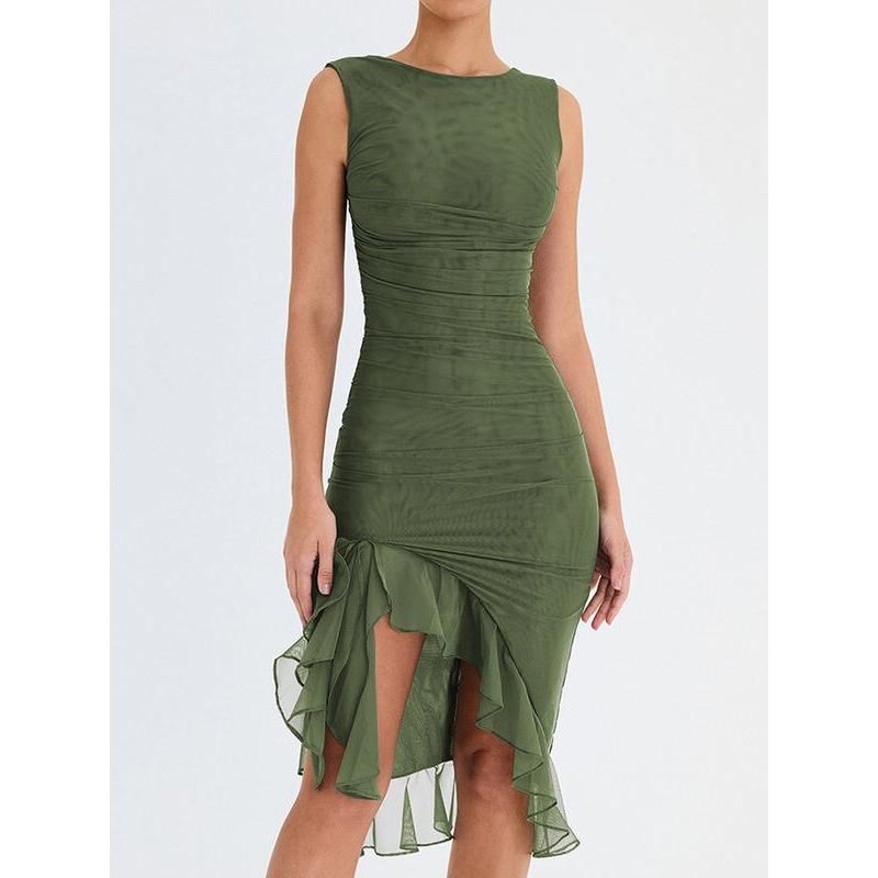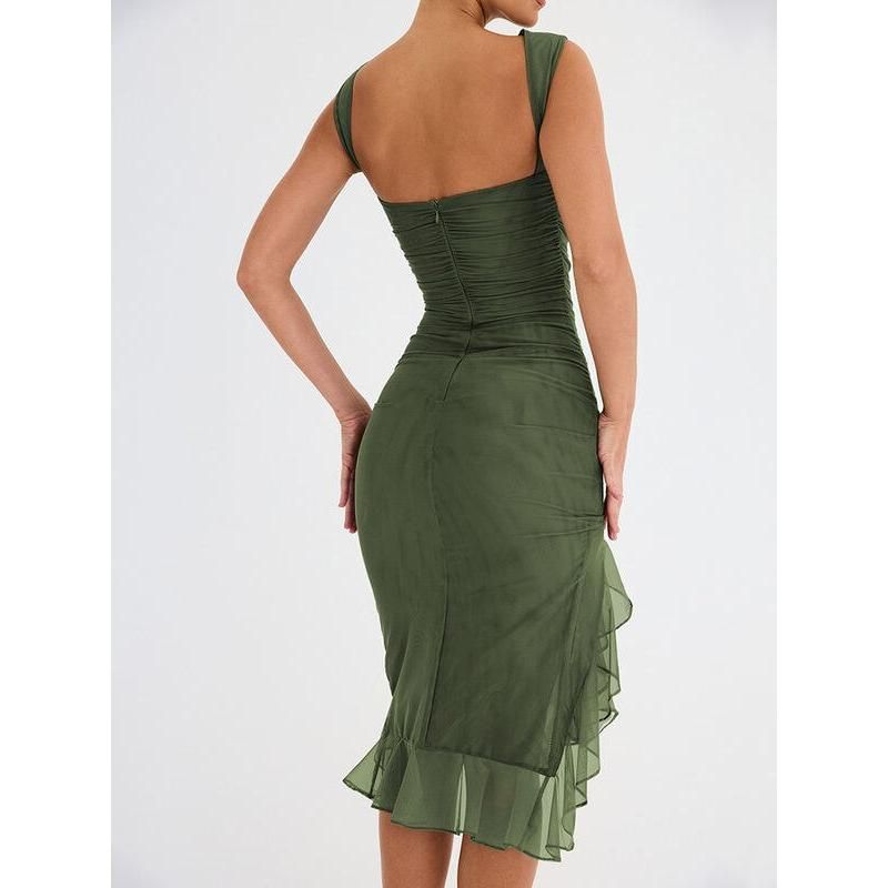 Step into the season with confidence in our Elegant Backless Ruffle Midi Dress. Perfect for middle-aged women who adore a blend of elegance and allure, this dress is your ticket to making a memorable statement at any club party or social gathering. Its sleeveless design and knee-length cut offer a chic yet comfortable fit, ideal for those warm spring and summer days.