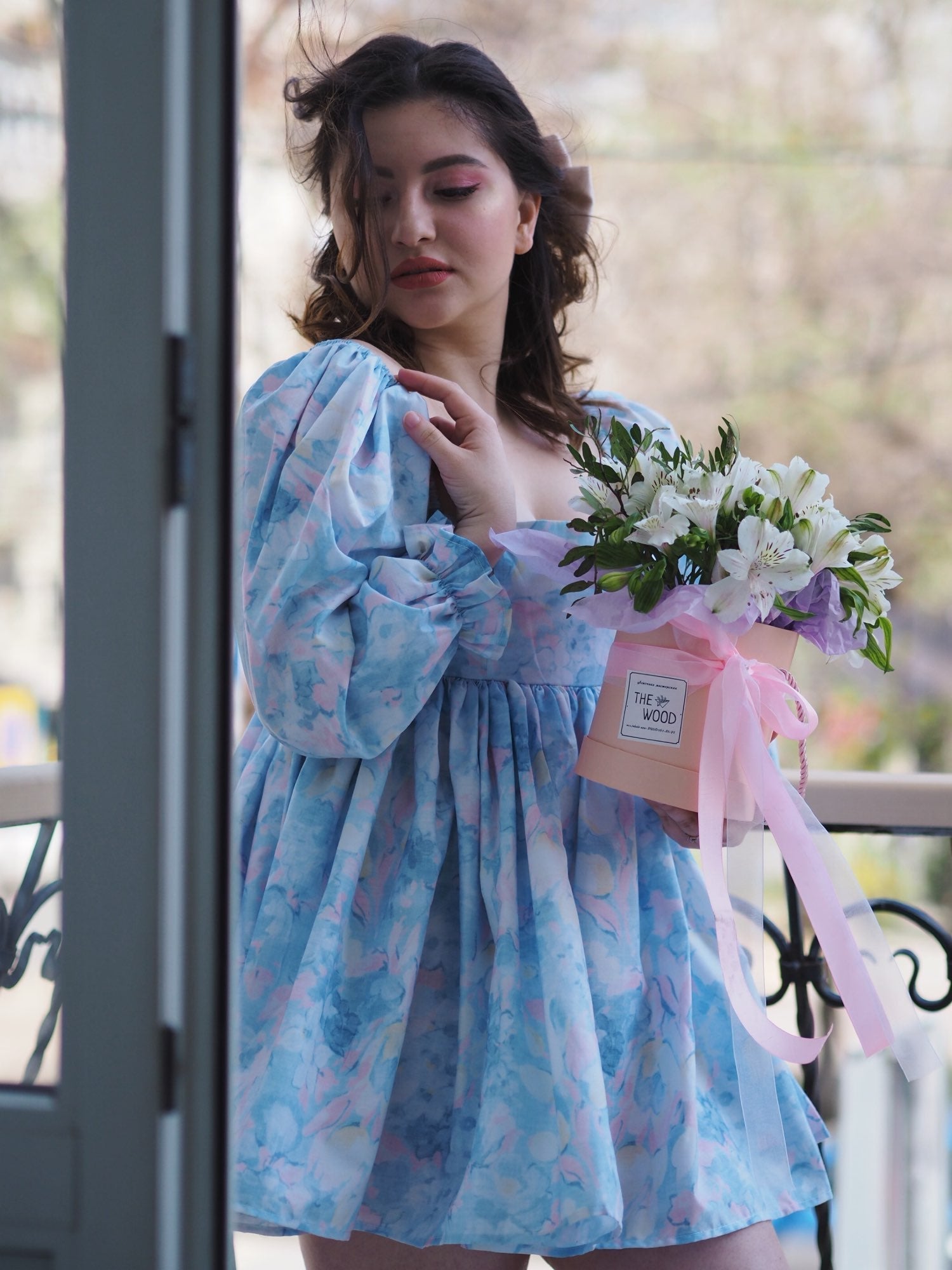 WENDY DOLL MINI DRESS has mini length, puff sleeves, blue&baby pink floral pattern. Can be wear like off-shoulder.