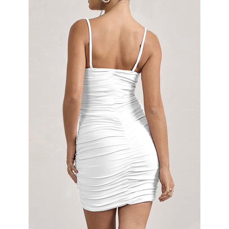 The dress features a flattering sweetheart neckline and spaghetti straps, creating a look that's both chic and timeless. The high-stretch synthetic fiber blend of cotton, polyester, and spandex ensures a snug yet comfortable fit that adapts to your body shape. With its above-knee length and pleated silhouette, this dress promises an elegant and sensual appearance.