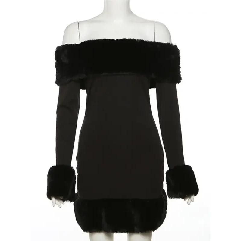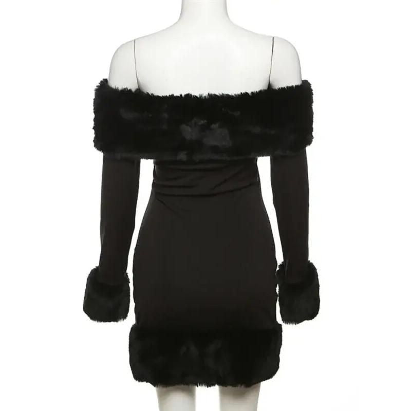 Embrace your inner elegance with our Off-Shoulder Fur-Trimmed Bodycon Mini Dress. It's more than just a dress; it's a statement of style and confidence. Don't miss the chance to make a lasting impression. Add this stunning piece to your wardrobe today and step out in unparalleled style this season!