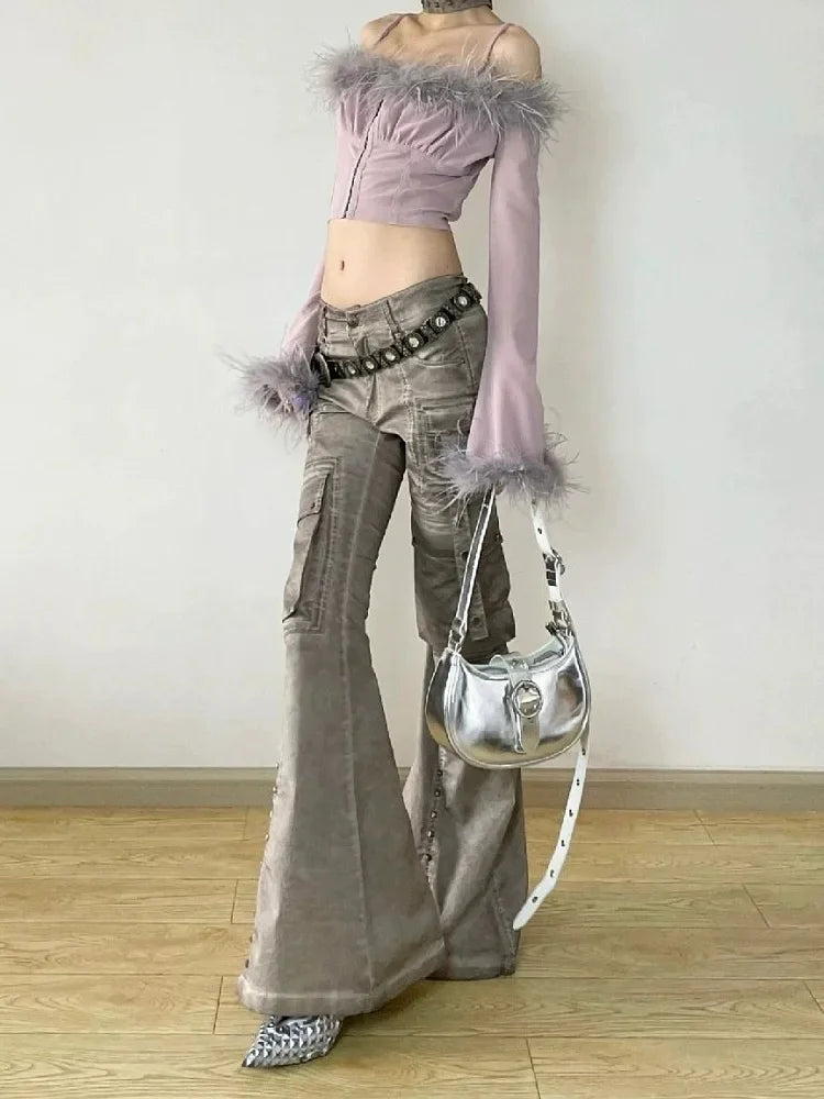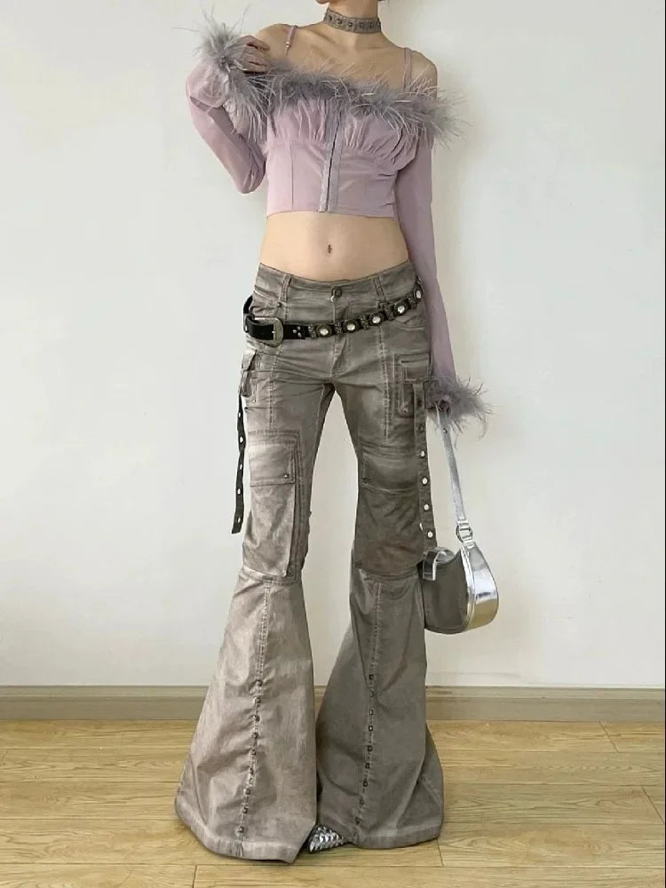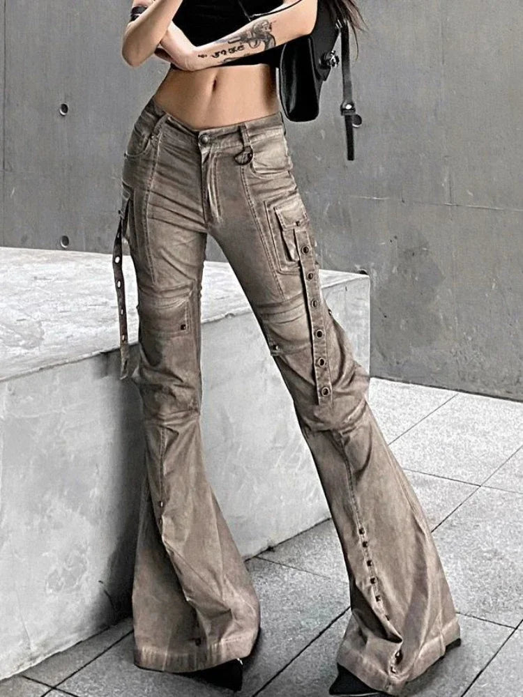 Cargo Flared Jeans Women Oversize Pocket Low Waist Denim Pants