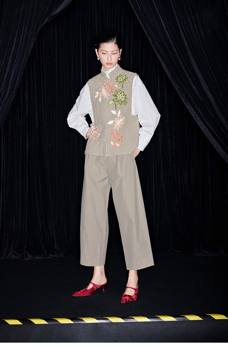 M essential Mackay Puli linen embroidered stand collar gilet vest pant set - Eight Treasures sedum