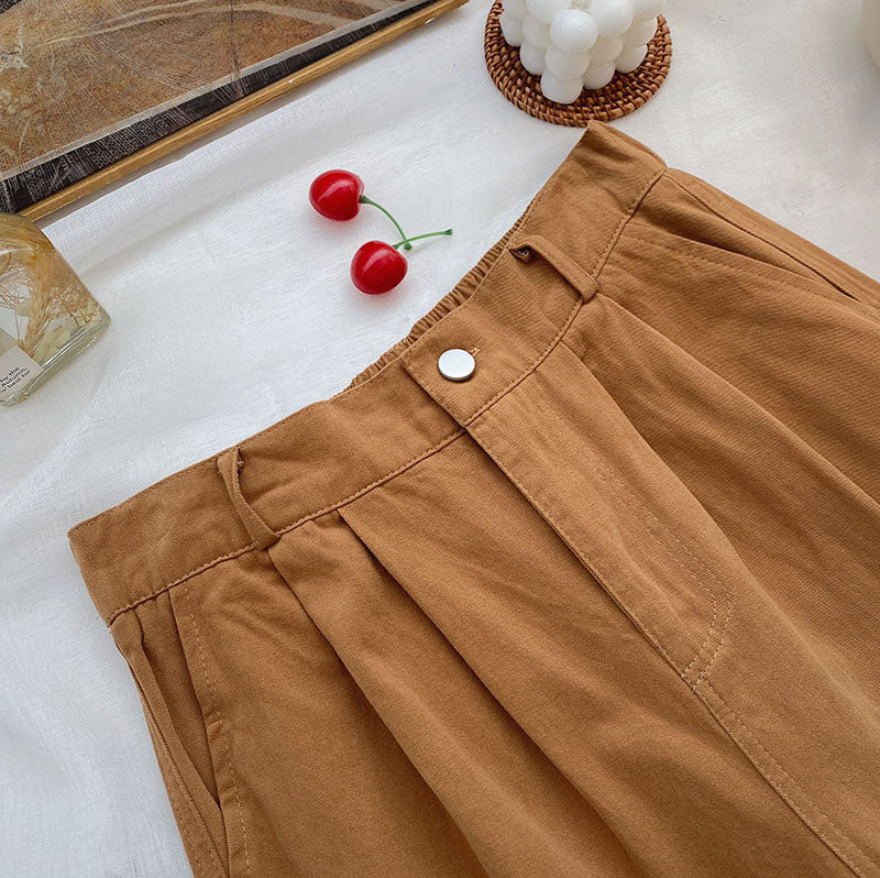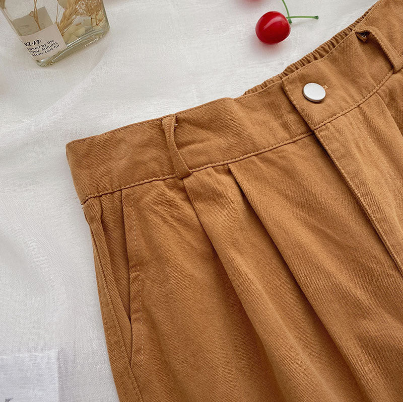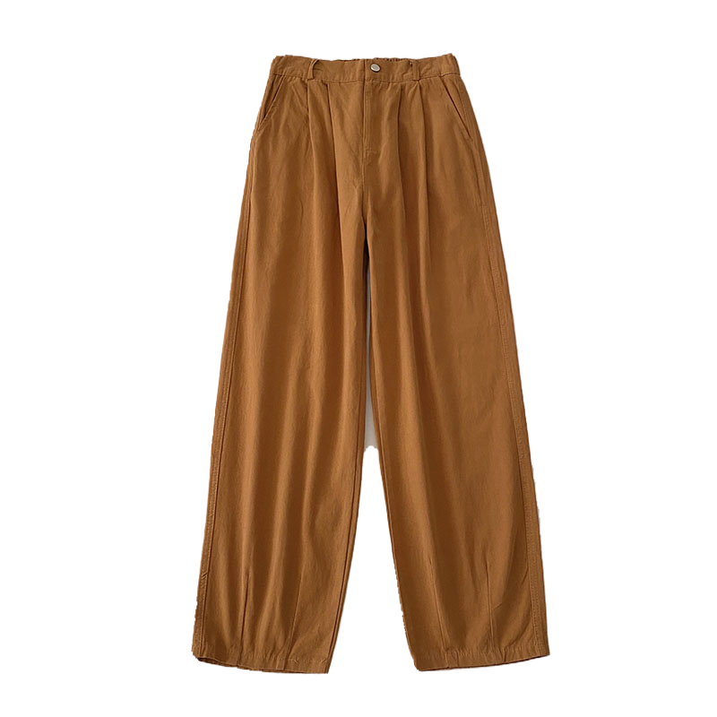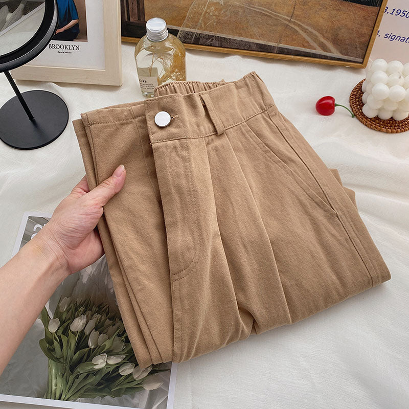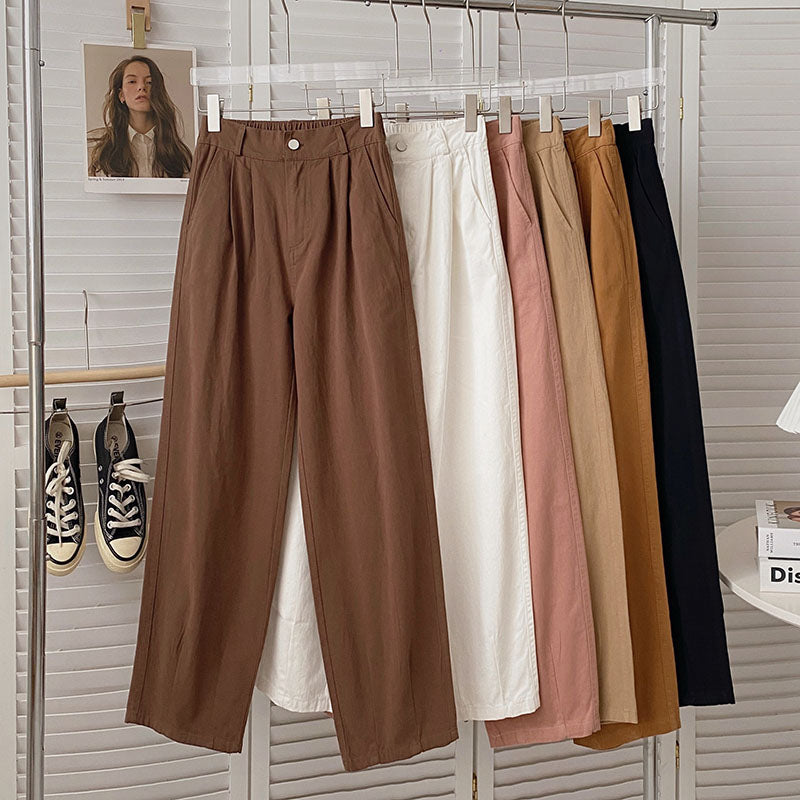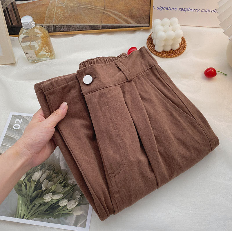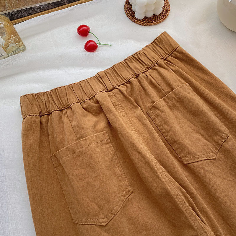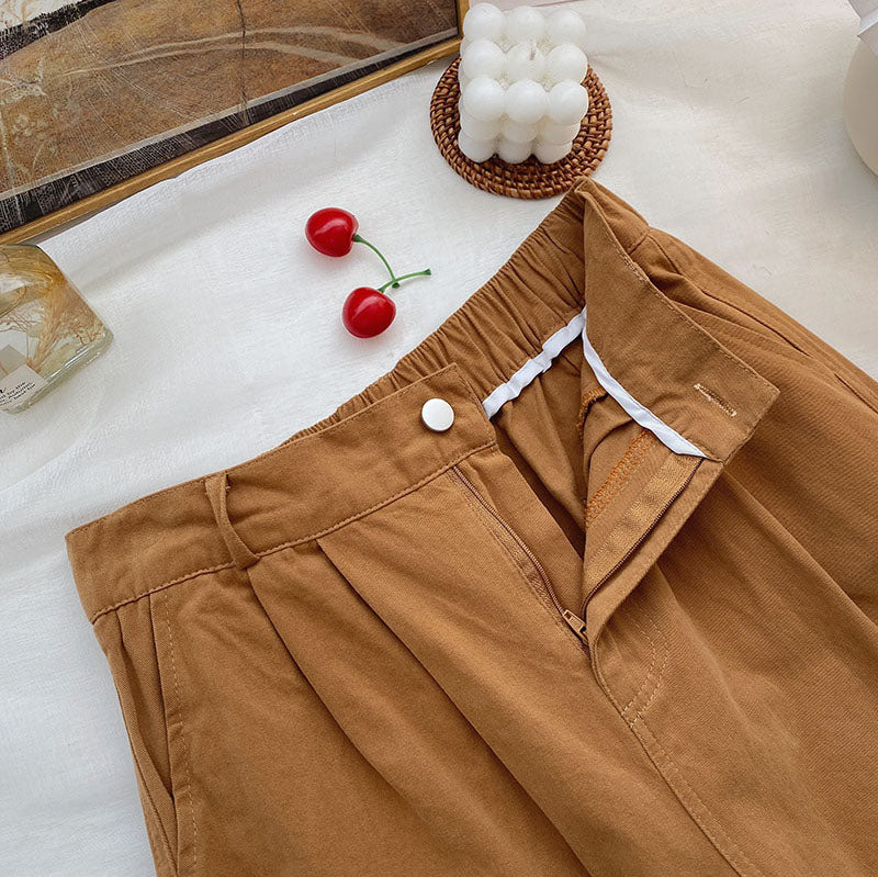 Comfy and relaxed cotton pants in versatile colors for everyday use, no matter the occasion. Button and zip up front with belt loops, side pockets, back pockets and elastic waist back. Slightly cropped.
